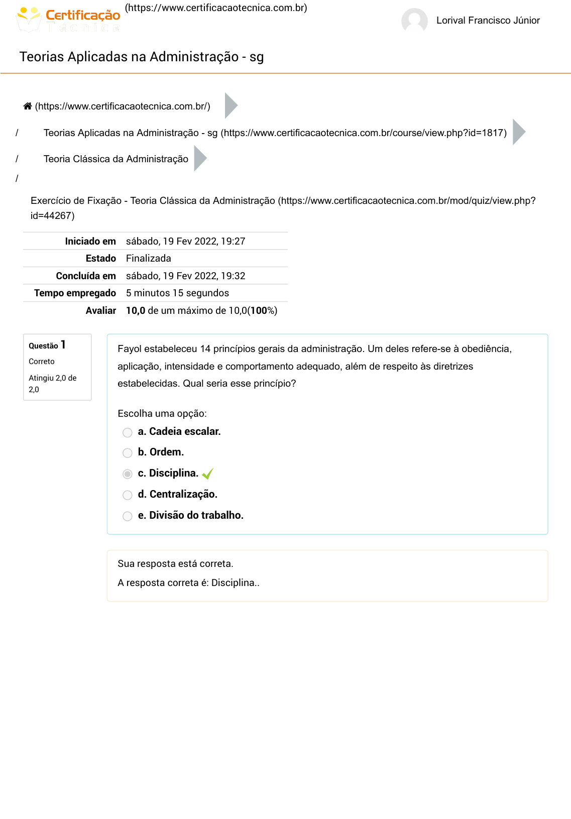 (https://www.certificacaotecnica.com.br) Lorival Francisco Júnior Teorias Aplicadas na Administração - sg Questão 1 Correto Atingiu 2,0 de 2,0 / / / Iniciado em sábado, 19 Fev 2022, 19:27 Estado Finalizada Concluída em sábado, 19 Fev 2022, 19:32 Tempo empregado 5 minutos 15 segundos Avaliar 10,0 de um máximo de 10,0(100%) Fayol estabeleceu 14 princípios gerais da administração. Um deles refere-se à obediência, aplicação, intensidade e comportamento adequado, além de respeito às diretrizes estabelecidas. Qual seria esse princípio? Escolha uma opção: a. Cadeia escalar. b. Ordem. c. Disciplina. d. Centralização. e. Divisão do trabalho. Sua resposta está correta. A resposta correta é: Disciplina.. (https://www.certificacaotecnica.com.br/) Teorias Aplicadas na Administração - sg (https://www.certificacaotecnica.com.br/course/view.php?id=1817) Teoria Clássica da Administração Exercício de Fixação - Teoria Clássica da Administração (https://www.certificacaotecnica.com.br/mod/quiz/view.php? id=44267) https://www.certificacaotecnica.com.br/ https://www.certificacaotecnica.com.br/ https://www.certificacaotecnica.com.br/course/view.php?id=1817 https://www.certificacaotecnica.com.br/mod/quiz/view.php?id=44267 Questão 2 Correto Atingiu 2,0 de 2,0 Questão 3 Correto Atingiu 2,0 de 2,0 Fayol, o percursor da Teoria Clássica da Administração, acreditava que as empresas eram como uma estrutura. Sendo assim, para elaborar os princípios da administração de modo a nortear as estratégias dessa estrutura organizacional, ele começou analisando as funções básicas das instituições. Assinale a alternativa que contenha essas funções. Escolha uma opção: a. Comerciais, contábeis, financeiras e administrativas. b. Técnicas, comerciais, financeiras, de segurança, contábeis e administrativas. c. Financeiras, contábeis e administrativas. d. Técnicas, comerciais, financeiras, de segurança e contábeis. e. Comerciais, administrativas, técnicas e de segurança. Sua resposta está correta. A resposta correta é: Técnicas, comerciais, financeiras, de segurança, contábeis e administrativas.. Além de Fayol, outros autores fizeram contribuições à Teoria Clássica da Administração. Quais foram os princípios sugeridos por Urwick? Escolha uma opção: a. Princípio da autoridade e amplitude administrativa. b. Princípio da especialização, amplitude administrativa e autoridade. c. Princípio da definição e autoridade. d. Princípio da autoridade, amplitude administrativa e definição. e. Princípio da especialização, autoridade, amplitude administrativa e definição. Sua resposta está correta. A resposta correta é: Princípio da especialização, autoridade, amplitude administrativa e definição.. Questão 4 Correto Atingiu 2,0 de 2,0 Questão 5 Correto Atingiu 2,0 de 2,0 A Teoria Clássica traz como concepção a ideia de que as organizações com um maior compartilhamento de tarefas são mais eficazes do que as que não seguem essa orientação. Quais são as divisões que poderão permear a divisão do trabalho? Escolha uma opção: a. Organização como função administrativa. b. Organização como uma entidade social. c. Divisão horizontal. d. Divisão vertical. e. Divisão vertical e divisão horizontal. Sua resposta está correta. A resposta correta é: Divisão vertical e divisão horizontal.. De que forma Fayol contribuiu para o gerenciamento das empresas atuais por meio da Teoria Clássica da Administração? Escolha uma opção: a. Por meio de um modelo de gestão flexível, inovador e leve. b. Por meio da criação de métodos que melhorassem o ambiente de trabalho, isto é, passou a refletir sobre a estrutura organizacional, além de todas as esferas da empresa, como as operacionais e gerenciais. c. Por meio de uma visão onde a organização é considerada um indivíduo. d. Por meio de quatro princípios: princípio da especialização, da autoridade, da amplitude administrativa e da definição. e. Infelizmente, devido às grandes diferenças das organizações daquele tempo para as atuais, não houve colaboração de Fayol. Sua resposta está correta. A resposta correta é: Por meio da criação de métodos que melhorassem o ambiente de trabalho, isto é, passou a refletir sobre a estrutura organizacional, além de todas as esferas da empresa, como as operacionais e gerenciais..