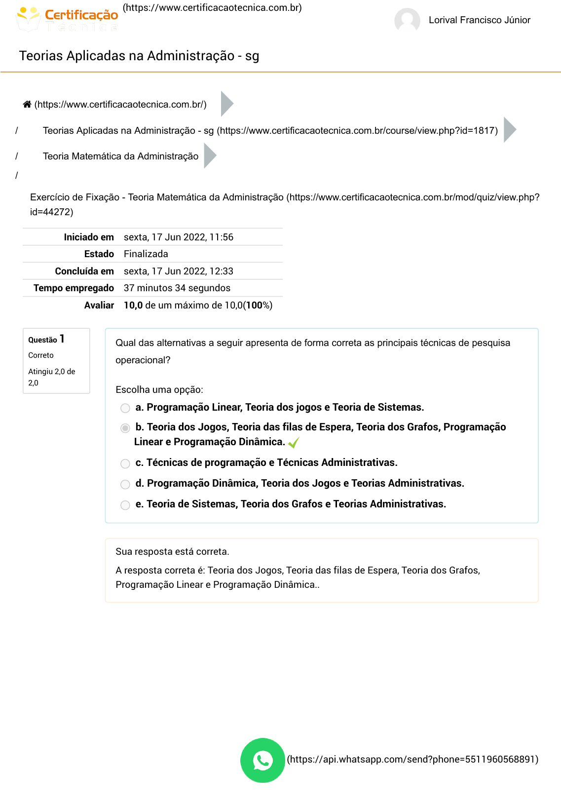 (https://www.certificacaotecnica.com.br) Lorival Francisco Júnior Teorias Aplicadas na Administração - sg Questão 1 Correto Atingiu 2,0 de 2,0 / / / Iniciado em sexta, 17 Jun 2022, 11:56 Estado Finalizada Concluída em sexta, 17 Jun 2022, 12:33 Tempo empregado 37 minutos 34 segundos Avaliar 10,0 de um máximo de 10,0(100%) Qual das alternativas a seguir apresenta de forma correta as principais técnicas de pesquisa operacional? Escolha uma opção: a. Programação Linear, Teoria dos jogos e Teoria de Sistemas. b. Teoria dos Jogos, Teoria das filas de Espera, Teoria dos Grafos, Programação Linear e Programação Dinâmica. c. Técnicas de programação e Técnicas Administrativas. d. Programação Dinâmica, Teoria dos Jogos e Teorias Administrativas. e. Teoria de Sistemas, Teoria dos Grafos e Teorias Administrativas. Sua resposta está correta. A resposta correta é: Teoria dos Jogos, Teoria das filas de Espera, Teoria dos Grafos, Programação Linear e Programação Dinâmica.. (https://www.certificacaotecnica.com.br/) Teorias Aplicadas na Administração - sg (https://www.certificacaotecnica.com.br/course/view.php?id=1817) Teoria Matemática da Administração Exercício de Fixação - Teoria Matemática da Administração (https://www.certificacaotecnica.com.br/mod/quiz/view.php? id=44272) (https://api.whatsapp.com/send?phone=5511960568891) https://www.certificacaotecnica.com.br/ https://www.certificacaotecnica.com.br/ https://www.certificacaotecnica.com.br/course/view.php?id=1817 https://www.certificacaotecnica.com.br/mod/quiz/view.php?id=44272 https://api.whatsapp.com/send?phone=5511960568891 https://api.whatsapp.com/send?phone=5511960568891 https://api.whatsapp.com/send?phone=5511960568891 https://api.whatsapp.com/send?phone=5511960568891 Questão 2 Correto Atingiu 2,0 de 2,0 Questão 3 Correto Atingiu 2,0 de 2,0 O ponto focal da abordagem quantitativa é a tomada de decisão, ou seja, a Teoria da Matemática. Sob quais perspectivas a abordagem quantitativa toma decisões? Escolha uma opção: a. Sob a perspectiva do problema e a perspectiva da matemática. b. Sob a perspectiva do processo e a perspectiva do problema. c. Sob a perspectiva do setor e a perspectiva do gestor. d. Sob a perspectiva das regras e a perspectiva das soluções. e. Sob a perspectiva do analista e a perspectiva do gestor. Sua resposta está correta. A resposta correta é: Sob a perspectiva do processo e a perspectiva do problema.. Entre as alternativas a seguir, qual apresenta de forma correta os três aspectos básicos comuns à abordagem da pesquisa operacional na tomada de decisões administrativas? Escolha uma opção: a. O uso da tecnologia, as ferramentas matemáticas e as normas que não avaliam a lógica. b. A utilização de um sistema existente, as pessoas e os sentimentos relacionados ao problema evidenciado pela equipe. c. A visão sistêmica, a aplicação de métodos científicos e subjetivos. d. A utilização de métodos científicos, matemáticos e sem o uso da lógica. e. Visão sistêmica dos problemas, uso do método científico e técnicas específicas. Sua resposta está correta. A resposta correta é: Visão sistêmica dos problemas, uso do método científico e técnicas específicas. . (https://api.whatsapp.com/send?phone=5511960568891) https://api.whatsapp.com/send?phone=5511960568891 https://api.whatsapp.com/send?phone=5511960568891 https://api.whatsapp.com/send?phone=5511960568891 Questão 4 Correto Atingiu 2,0 de 2,0 Questão 5 Correto Atingiu 2,0 de 2,0 Quando nos referimos ao processo de tomada de decisão, podemos afirmar que a escolha entre um modelo ou outro é fundamental na obtenção do sucesso. Dentre as alternativas a seguir, qual apresenta de forma correta o modelo racional? Escolha uma opção: a. O tomador de decisões não tem informações perfeitas, não é racional e sempre tem em mente os melhores interesses da organização. Por isso, ele escolherá a primeira alternativa minimamente aceitável. b. Para os processos de decisão racional, as organizações deixam em aberto o número de possibilidades para que os funcionários possam opinar livremente, sem fixar pressupostos a serem atingidos. c. O tomador de decisões tem: informações perfeitas e uma lista exaustiva de alternativas dentre as quais pode escolher. Ainda, ele é racional e sempre tem em mente os melhores interesses da organização. d. O modelo racional é estabelecido pelas organizações com o objeto de implantar processos decisórios baseados em informações que ocasionalmente podem ser imperfeitas e também incompletas. e. O tomador de decisões nem sempre tem informações perfeitas, muitas vezes, não tem um conjunto completo de alternativas ou não entende plenamente aquelas que estão à disposição. Sua resposta está correta. A resposta correta é: O tomador de decisões tem: informações perfeitas e uma lista exaustiva de alternativas dentre as quais pode escolher. Ainda, ele é racional e sempre tem em mente os melhores interesses da organização.. Podemos considerar como uma das limitações da Teoria Matemática da Administração: Escolha uma opção: a. As condições necessárias para que seja possível aplicar a teoria em todos os níveis organizacionais. b. Todas os problemas são reduzidos a números ou expressões matemáticas, mas nem todos eles podem ser mensurados matematicamente. c. A preocupação com a competição dos jogos e a realização de incursões na estratégia organizacional. d. O grande arcabouço teórico e epistemológico que envolve essa teoria e dificulta sua aplicação. e. A complexidade que envolve a Teoria Matemática, dificultando sua aplicação no nível operacional das empresas Sua resposta está correta. A resposta correta é: Todas os problemas são reduzidos a números ou expressões matemáticas, mas nem todos eles podem ser mensurados matematicamente.. (https://api.whatsapp.com/send?phone=5511960568891) https://api.whatsapp.com/sen