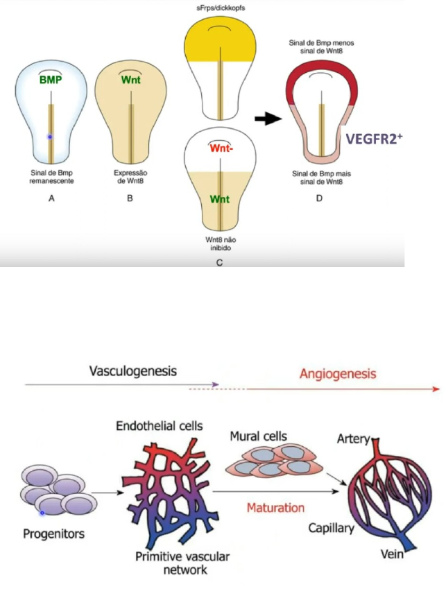 Morfogênese vascular e do coração · O sistema cardiovascular é o primeiro a começar a funcionar no embrião; · No décimo sétimo dia, células percursoras de vasos sanguíneos e do sangue se diferenciam a partir do saco vitelino. · No vigésimo segundo dia há o início do batimento cardíaco; · 24-25 dias se inicia a circulação de sangue no embrião – a função circulatória é critica para a viabilidade do próprio embrião. Mesoderma da placa lateral: progenitores do coração e dos vasos sanguíneos. Células do epiblasto que ingressam para o mesoderma a partir do terço rostral da linha primitiva vão executar a rota bilateral e bem rostral que dará origem ao coração. Em relação aos vasos, eles vêm de células do epiblasto que ingressam em um momento mais tardio do que as células do coração pela linha primitiva também pelo plano do mesoderma, mas numa porção mais rostral, executando uma rota bilateral. BMP+/Wnt+ marca território intraembrionário de indução de angioblastos. Wnt – positivo na região caudal, visto que existem inibidores de sua atuação na região próxima ao crânio primitivo. BMP – atua na parte caudal e cranial. A região negativa Wnt e positiva BMP – células que darão origem ao coração. Abaixo disso (ilustrado em rosa salmão), temos os progenitores vindos da placa lateral. De onde surgem os primeiros vasos durante a embriogênese? Intra-embrionáriamente, eles vão surgir da diferenciação de células que se situa no mesoderma da placa lateral mais caudal – então quando as células sofrem ação de BMP e Notch elas vão passar a expressar o receptor 2 e, a partir disso, vemos as modificações que elas sofrerão. Notch+ linhagem hematopoiética Notch- linhagem endotelial Os precursores que surgem do saco vitelino são chamados de bipotente porque dependendo da sinalização eles vão se agregar e conseguir se diferenciar. Nesses aglomerados, teremos percursores da linhagem hematopoiética primitiva e das células endoteliais. As células que ficam na periferia de cada um desses agregados (também chamados de ilhotas sanguíneas) vão se diferenciar posteriormente na parede endotelial e as que ficam no centro acabam se diferenciando nos eritrócitos primitivos. Veias vitelínicas vão fazer anastomose com a aorta primitiva. A partir da quarta semana temos uma rede vascular primitiva. HSC: células tronco hematopoiéticas. Aorta gônada mesonerfa – endotélio vai ser um endotélio hemogenico. VRGF: fator de crescimento vascular endotelial; ele é um fator secretado na matriz que pertence a uma família (visto que existe o VEGF A, B, C, D – em geral nos referimos ao A por sua abundancia e etc) e ele atua nas células endoteliais. Representação de uma célula qualquer. Em seu citoplasma ela tem uma subunidade de um fator de transcrição – subunidade HIF1 alfa do fator de transcrição HIF. Essa subunidade, então, reside no citoplasma, e quando a célula está sob tensão normal de oxigênio, essa subunidade é encaminhada para degradação. Caso uma situação de hipoxia (quase constante no embrião), a subunidade alfa se acumula no citoplasma e, desse modo, ele acaba indo até o núcleo, onde encontra a subunidade beta. Quando isso acontece, essas subunidades formam o fator de transcrição HIF1. Esse HIF1 vai levar a transc0frição de um ‘’sem-número’’ de genes que vão dar origem a proteínas, dentre elas o VEGF. Logo, VEGF pode ser secretado por qualquer célula a qualquer momento caso esta se encontre em uma situação de baixa tensão de oxigênio. Então, quando temos o VEGF se ligando ao receptor 2, ele vai ativar uma cascata intracelular dentro da célula endotelial que vai permitir a permeabilidade vascular no vaso pré-existente e vai levar à proliferação celular, a sobrevida e também a migração celular dessa célula naquela direção a formação de cordões vasculares. Sem o receptor 2 não há HSC e se nocauteia o 1 há uma hiper vascularização. Ambos levam a uma morte prematura ainda no útero. R1: maior VGFA do que R2 Os receptores 1 e 2 seriam uma boa tentativa na elaboração de terapias anti-angiogenicas. Anomalias Hemangioma capilar ou nervo vascular Fatores angiogenicos estimulam a proliferação de vasos sanguíneos e linfáticos Crescimento exacerbado das células endoteliais leva a tumores benignos mais comuns na infância. Angiogênese ajuda a expandir e ramificar nosso plexo vascular primitivo e também conforme crescemos ao longo da vida. Angiogênese tumoral – terapias com receptores ou células que expõem receptores de atores que promovem ou impedem a angiogênese – importante para o conceito de melhora tumoral. Brotamento vascular: série de eventos coordenados no tempo e espaço · Aumento da permeabilidade vascular e degradação de MEC · Proliferação e migração dirigida das células endoteliais · Formação do lúmen · Estabilização · Diferenciação veia e artéria Na extremidade de um capilar em expansão existe uma célula endotelial exploratória, visto seus receptores para inúmeras proteínas secretadas na matriz. Ela regula o crescimento do capilar. Caso duas células dessas se toquem, elas deixam o seu broto vascular e vão ao próximo. Células tip ou líder (não proliferativa, migratória, tem receptores para moléculas de direcionamento vascular, possuem perfil molecular particular, secretam metaloproteases) migram em resposta a gradientes de VEGF (em direção à hipóxia). Células seguidoras (que estão tendo a expressão de Notch) seguem a célula tip. Essa célula, por sua vez, é proliferativa. Os macrófagos acabam por auxiliar a fusão entre as tip cells. A tip cell acaba indicando direção pra onde o capilar deve seguir. Na angiogênese, o processo no qual brotos de vasos sanguíneos crescem a partir de uma rede vascular pré-existente, as chamadas células da ponta endotelial desempenham um papel essencial. As células da pon
