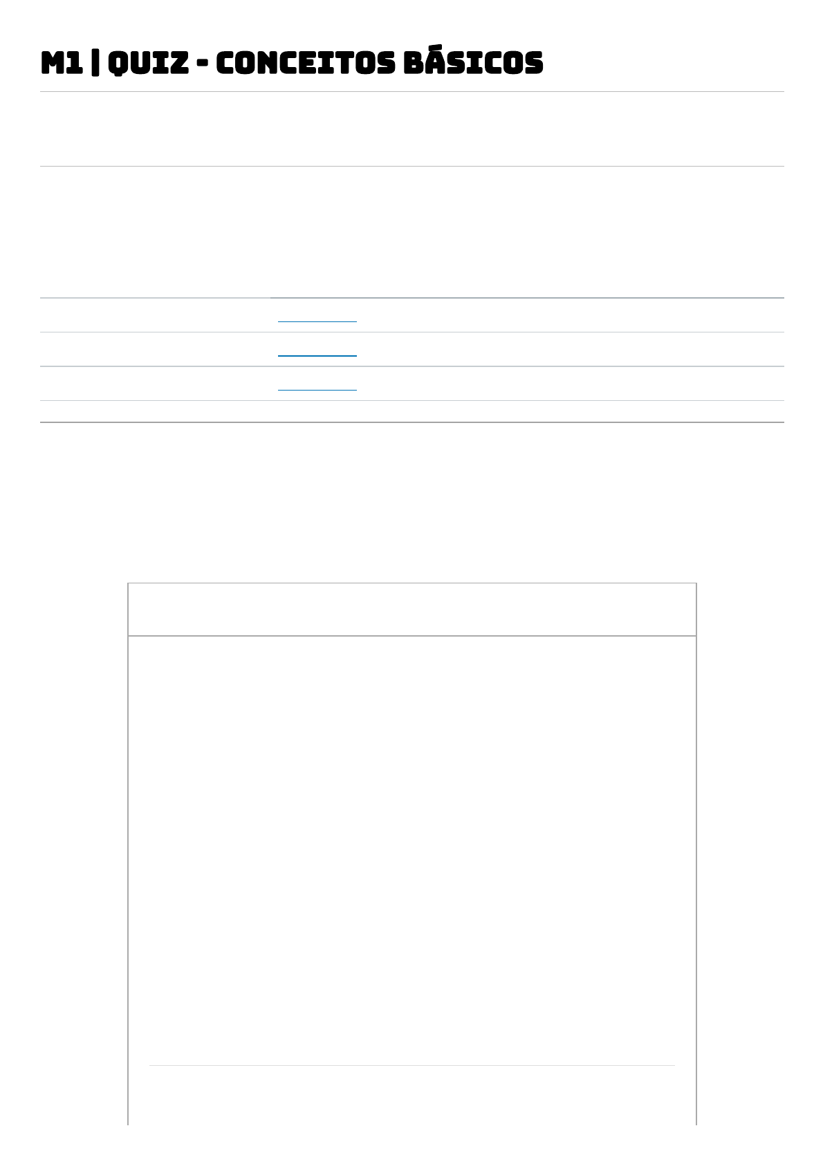 09/08/2022 17:49 M1 | Quiz - Conceitos básicos: 2022/2 - Gestão de Sistemas de Informação - GR95001-00806-876355 - Quarta-feira - 21:00… https://unisinos.instructure.com/courses/22958/quizzes/16539 1/5 M1 | Quiz - Conceitos básicos Entrega 10 ago em 23:59 Pontos 1,3 Perguntas 5 Limite de tempo Nenhum Tentativas permitidas 2 Histórico de tentativas Tentativa Tempo Pontuação MANTIDO Tentativa 2 2 minutos 1,3 de 1,3 MAIS RECENTE Tentativa 2 2 minutos 1,3 de 1,3 Tentativa 1 22 minutos 1,04 de 1,3 As respostas corretas estarão disponíveis em 11 ago em 0:00. Pontuação desta tentativa: 1,3 de 1,3 Enviado 9 ago em 17:49 Esta tentativa levou 2 minutos. 0,26 / 0,26 ptsPergunta 1 Responder 1: Assinale verdadeiro (V) ou falso (F) para cada afirmação a seguir: Falso Um sistema de informação em uma empresa é sempre computadorizado. Verdadeiro Informações são dados contextualizados, analisados e com relevância para o usuário ou tomador de decisão. Falso Dados são sinais brutos sobre uma ação ou medição, sozinhos não têm relevância para tomada de decisão e, por isso, os bancos de dados dos sistemas transacionais não têm importância para decisões. Falso Quando avaliamos a qualidade de uma informação, a dimensão tempo é a mais importante, pois mais vale ter uma informação agora (com prontidão), mesmo que com erros, do que ter uma informação precisa. https://unisinos.instructure.com/courses/22958/quizzes/16539/history?version=2 https://unisinos.instructure.com/courses/22958/quizzes/16539/history?version=2 https://unisinos.instructure.com/courses/22958/quizzes/16539/history?version=1 09/08/2022 17:49 M1 | Quiz - Conceitos básicos: 2022/2 - Gestão de Sistemas de Informação - GR95001-00806-876355 - Quarta-feira - 21:00… https://unisinos.instructure.com/courses/22958/quizzes/16539 2/5 Responder 2: Responder 3: Responder 4: Falso Verdadeiro Falso Falso 0,26 / 0,26 ptsPergunta 2 Um Sistema de Informações faz parte de uma organização, não atua de forma isolada, por isso, não é apenas uma solução tecnológica, as dimensões organizacionais e humanas também determinam como um sistema vai funcionar. Verifique as situações abaixo, e indique a dimensão equivalente. a) Anete trabalhava na DeBoa, e sempre que precisava requisitar material para o almoxarifado, bastava fazer a requisição no ERP e, se havia orçamento disponível para aquele material, o mesmo era liberado. Agora, trabalhando na Segura, que usa o mesmo ERP, todas as requisições precisam ser aprovadas previamente pelo seu gerente, mesmo quando há orçamento disponível. Esse tipo de funcionamento do sistema é influência direta da dimensão: Dimensão Organizacional b) Mário começou a trabalhar em uma nova empresa, e estava conseguindo convencer seu supervisor a adquirir um software para controle dos processos, quando percebeu que precisaria primeiro montar uma rede interna e adquirir novos computadores. A aquisição do software precisou ser adiada em funções de questões de... Dimensão Tecnológica c) Uma rede de varejo trocou seu sistema de controle, que ainda era baseado em DOS (sistema operacional antecessor ao Windows, sem interface gráfica). Depois que o sistema foi implantado, a surpresa: a 09/08/2022 17:49 M1 | Quiz - Conceitos básicos: 2022/2 - Gestão de Sistemas de Informação - GR95001-00806-876355 - Quarta-feira - 21:00… https://unisinos.instructure.com/courses/22958/quizzes/16539 3/5 Responder 1: Responder 2: Responder 3: produtividadecaiu porque os vendedores, acostumados com o sistema anterior, não se adaptaram ao novo sistema. Esse é um problema da dimensão... Dimensão Humana Dimensão Organizacional Dimensão Tecnológica Dimensão Humana 0,26 / 0,26 ptsPergunta 3 Os sistemas que atuam no nível operacional de uma empresa ou organização, fazendo a gestão dos processos básicos, em nível unitário e em tempo real são chamados de... SPT (Sistema de Processamento de Transações) ou Sistema Transacional BI (Business Intelligence) Sistemas colaborativos Sistemas especialistas Sistemas CRM 0,26 / 0,26 ptsPergunta 4 09/08/2022 17:49 M1 | Quiz - Conceitos básicos: 2022/2 - Gestão de Sistemas de Informação - GR95001-00806-876355 - Quarta-feira - 21:00… https://unisinos.instructure.com/courses/22958/quizzes/16539 4/5 No final da tarde, você passou no supermercado perto de sua casa para comprar os ingredientes para seu jantar. No caixa, o atendente utilizou uma leitora ótica para registrar suas compras, e o sistema identificou preço e quantidade dos produtos, bem como registrou sua “baixa” no sistema de estoque e calculou o total que você deveria pagar. O sistema utilizado no caixa é um: SIG (Sistema de Informações Gerenciais) SPT (Sistema de Processamento de Transações) ou Sistema Transacional CRM (Customer Relationship Management), ou Gestão do Relacionamento com o Cliente SCM - Gerenciamento da Cadeia de Suprimentos Sistema especialista 0,26 / 0,26 ptsPergunta 5 Marque a informação incorreta sobre sistemas transacionais: Permitem apenas informação estruturada, ou seja, com uma certa configuração e padronização. São sistemas que suportam operações como edição de textos, criação de apresentações e de planilhas. 09/08/2022 17:49 M1 | Quiz - Conceitos básicos: 2022/2 - Gestão de Sistemas de Informação - GR95001-00806-876355 - Quarta-feira - 21:00… https://unisinos.instructure.com/courses/22958/quizzes/16539 5/5 Auxiliam na automação de processos operacionais de uma organização. São sistemas que suportam operações como cadastro de pedidos, vendas, controle financeiro, recursos humanos e produção. Possuem um banco de dados associado. Pontuação do teste: 1,3 de 1,3