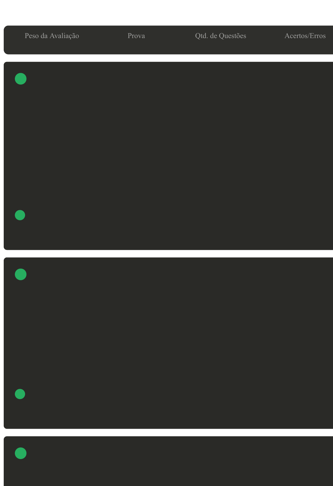 GABARITO | Avaliação II - Individual (Cod.:767002) Peso da Avaliação 1,50 Prova 52825243 Qtd. de Questões 10 Acertos/Erros 10/0 O ensino por projetos de aprendizagem é a organização de situações de aprendizagem que eduquem pela pe estudantes em todas as fases, desde a elaboração do projeto, a sua execução, até a sistematização final. Sobr verdadeiras e F para as falsas: ( ) Um projeto de ensino-aprendizagem deve estar intimamente articulado à realidade dos estudantes. ( ) A preparação de um projeto de ensino-aprendizagem é um momento privilegiado de formação continu ( ) Um projeto de ensino-aprendizagem deve, obrigatoriamente, seguir apenas um formato: justificativa, o bibliográficas. ( ) Quando planejamos as ações a serem desenvolvidas com os estudantes, estamos revendo nossas conce escola. Assinale a alternativa que apresenta a sequência CORRETA: A F - V - V - F. B V - F - F - V. C V - V - F - V. D F - F - V - F. Diversas classificações foram propostas até hoje para os métodos de ensino. Libâneo (2008) propõe uma cl método de exposição pelo professor, método de trabalho independente, método de elaboração conjunta, mé especiais. Com relação ao método de trabalho em grupo, analise as sentenças a seguir: I- Esse método consiste basicamente em distribuir temas de estudo a pequenos grupos. II- É aconselhável que apenas alunos com o mesmo nível de rendimento escolar participem de um mesmo g III- Cada grupo deve ter um coordenador, que poderá ser escolhido pelo grupo ou indicado pelo professor. IV- O professor precisa deixar bem claro aos alunos os objetivos da atividade e os passos que devem ser seg FONTE: LIBÂNEO, José Carlos. Didática. 28. ed. São Paulo: Cortez, 2008. A As sentenças II e III estão corretas. B As sentenças I, II e III estão corretas. C As sentenças I, III e IV estão corretas. D As sentenças II e IV estão corretas. O Planejamento de Ensino define a conduta do planejamento curricular. É desenvolvido, basicamente, a par compete a ele definir os objetivos a serem alcançados pelo aluno. Neste sentido, sabemos que existem diver variam em abrangência e complexidade. Com relação aos planejamentos de ensino, associe os itens, utilizan I Pl j i l 1 2 3 Toda atividade humana é movida por objetivos. No entanto, no âmbito educacional, os objetivos são impres pedagógico. Os objetivos educacionais expressam explicitamente propósitos definidos com relação ao dese precisam ser adquiridas ao longo do processo. Segundo Libâneo (2008), não há prática educativa sem objet objetivos educacionais tem três referenciais. Sobre o exposto, analise as seguintes sentenças: I- A proposta dos valores e ideais expressos na LDB (Lei de Diretrizes e Bases da Educação Nacional) repr dominantes no sistema social. II- A proposta preconiza que os conteúdos das diversas ciências são historicamente produzidos e acumulado expectativas e necessidades de formação cultural exigidas pela população majoritária decorre de suas condi pela democratização, das quais participam. IV- A proposta de que os profissionais de educação ajudem somente os mais favorecidos a conquistar seus a desigualdade não acabem equilibra a sociedade. Assinale a alternativa CORRETA: FONTE: LIBÂNEO, José Carlos. Didática. 28. ed. São Paulo: Cortez, 2008. A As sentenças I, II e III estão corretas. B As sentenças I, III e IV estão corretas. C As sentenças II, III e IV estão corretas. D As sentenças I, II e IV estão corretas. Sabemos que o plano de aula é um detalhamento do plano de ensino. O plano de aula é responsável por nor professor, sendo imprescindível na sua carreira. Profissionais da área de educação que se comprometem a f mais chances de obter êxito no processo de aprendizagem, de modo que sejam evitadas aulas monótonas, d assim, sobre o plano de aula, classifique V para as sentenças verdadeiras e F para as falsas: ( ) Como o plano de aula é um planejamento anual, todos os itens apresentados devem ser redigidos de fo ( ) No plano de aula, o professor deve especificar os itens e também os subitens dos conteúdos que serão t ( ) O plano de aula, também chamado de plano de curso, é um roteiro organizado das unidades didáticas a durante um ano ou semestre letivo. ( ) No plano de aula, o professor define os procedimentos de ensino e organiza as atividades de ensino-ap Assinale a alternativa que apresenta a sequência CORRETA: FONTE: https://escolaeducacao.com.br/plano-de-aula/. Acesso em: 12 set. 2018. A F - V - F - V. B F - F - V - F. C V - F - V - V. D V - V - F - V. A capacidade de se satisfazer pessoal e profissionalmente depende da qualidade de conhecimento que o pro as ações. Todo professor tem a responsabilidade de educar o aluno de maneira que o oriente em suas ativida solucionar suas ações pessoais e profissionais. Para desenvolver esta prática, o professor necessita de objeti tornando-o um indivíduo mais organizado e realizado. Uma das estratégias para atingir essa organização é o elaborada contendo objetivos gerais e específicos Com base nos objetivos analise as sentenças a seguir: 4 5 6 Os métodos de ensino tratam de uma estratégia norteadora das ações e procedimentos adotados pelos profe objetivos com relação ao ensino e aprendizagem. Existem diferentes tipos de métodos de ensino, com carac e expectativas diferentes. Diversos pesquisadores apresentam a classificação dos métodos de ensino. Com b método de exposição pelo professor, associe os itens, utilizando o código a seguir: I- Exposição verbal. II. Demonstração. III. Ilustração. IV. Exemplificação. ( ) O professor utiliza instrumentos que possam representar fenômenos e processos, que podem ser, por m experimento simples. ( ) O professor utiliza a representação gráfica, mapas, gravuras, esquemas. Dessa maneira, o professor enr compreensíveis. ( ) Sua função é explicar um assunto desconhecido. O professor explica os cont