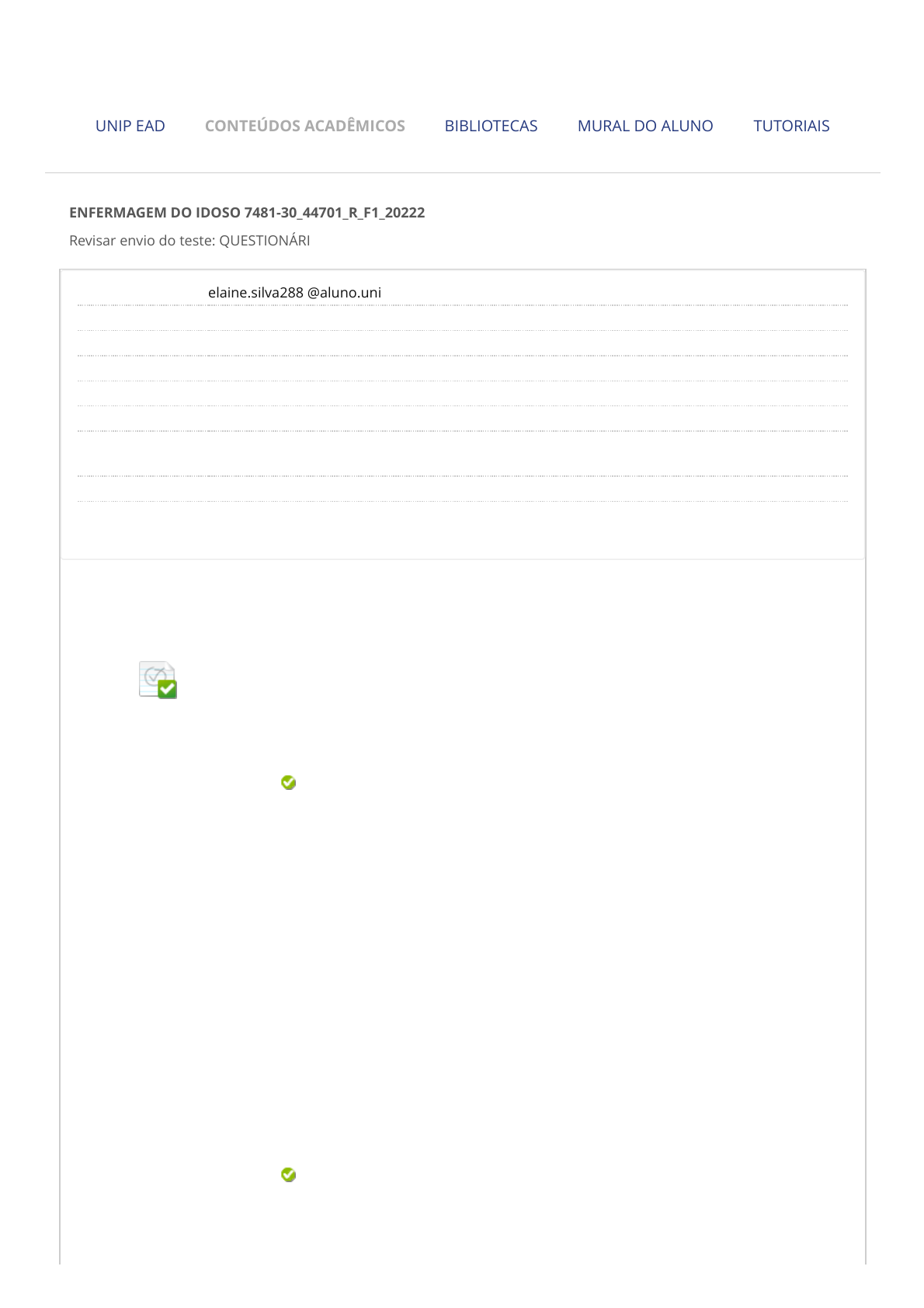 07/09/2022 21:10 Revisar envio do teste: QUESTIONÁRIO UNIDADE I – ... https://ava.ead.unip.br/webapps/assessment/review/review.jsp?attempt_id=_84164877_1&course_id=_238188_1&content_id=_2898045_1&retur… 1/7 Revisar envio do teste: QUESTIONÁRIO UNIDADE I ENFERMAGEM DO IDOSO 7481-30_44701_R_F1_20222 CONTEÚDO Usuário elaine.silva288 @aluno.unip.br Curso ENFERMAGEM DO IDOSO Teste QUESTIONÁRIO UNIDADE I Iniciado 07/09/22 20:34 Enviado 07/09/22 21:10 Status Completada Resultado da tentativa 5 em 5 pontos Tempo decorrido 35 minutos Resultados exibidos Todas as respostas, Respostas enviadas, Respostas corretas, Comentários, Perguntas respondidas incorretamente Pergunta 1 Resposta Selecionada: e. Respostas: a. b. c. d. e. Comentário O conceito de idoso ao longo da história foi sendo percebido de formas distintas pelas civilizações antigas; com o avanço da ciência, os idosos passaram a receber cuidados especializados por meio das práticas humanizadas em saúde. Assim, diversas teorias do envelhecimento buscam compreender esse fenômeno de maneira singular. Em relação a estas teorias, assinale a alternativa correta: A teoria biológica apresenta que o envelhecimento é um processo natural, contínuo e inevitável. As teorias estocásticas sugerem que o envelhecimento celular tenha início a partir de “erros” que ocorrem durante o processo de transcrição do material genético. As teorias do uso e do desgaste sugerem a perda da funcionalidade que acompanha o fenômeno do envelhecimento. A teoria neuroendócrina se baseia na possibilidade de danos moleculares progressivos ao longo do processo de envelhecimento. A teoria da ligação cruzada trata da ação dos radicais livres no processo de envelhecimento. A teoria biológica apresenta que o envelhecimento é um processo natural, contínuo e inevitável. Resposta: E UNIP EAD BIBLIOTECAS MURAL DO ALUNO TUTORIAISCONTEÚDOS ACADÊMICOS 0,5 em 0,5 pontos http://company.blackboard.com/ https://ava.ead.unip.br/webapps/blackboard/execute/courseMain?course_id=_238188_1 https://ava.ead.unip.br/webapps/blackboard/content/listContent.jsp?course_id=_238188_1&content_id=_2896853_1&mode=reset https://ava.ead.unip.br/webapps/portal/execute/tabs/tabAction?tab_tab_group_id=_10_1 https://ava.ead.unip.br/webapps/portal/execute/tabs/tabAction?tab_tab_group_id=_27_1 https://ava.ead.unip.br/webapps/portal/execute/tabs/tabAction?tab_tab_group_id=_47_1 https://ava.ead.unip.br/webapps/portal/execute/tabs/tabAction?tab_tab_group_id=_29_1 https://ava.ead.unip.br/webapps/portal/execute/tabs/tabAction?tab_tab_group_id=_25_1 https://ava.ead.unip.br/webapps/login/?action=logout 07/09/2022 21:10 Revisar envio do teste: QUESTIONÁRIO UNIDADE I – ... https://ava.ead.unip.br/webapps/assessment/review/review.jsp?attempt_id=_84164877_1&course_id=_238188_1&content_id=_2898045_1&retur… 2/7 da resposta: Comentário: as teorias biológicas do envelhecimento tratam o processo como a perda da capacidade funcional do organismo, ocorrida ao longo do tempo, como um processo natural decorrente do envelhecimento celular e da degeneração das estruturas dos sistemas orgânicos. Pergunta 2 Resposta Selecionada: b. Respostas: a. b. c. d. e. Comentário da resposta: As teorias psicossociais tentam explicar o processo de envelhecimento com base na função cognitiva dos indivíduos, como a memória, a inteligência e as emoções. Desse modo, em relação às teorias psicossociais do processo de envelhecimento, analise as a�rmativas a seguir: I. A teoria da atividade compreende a senescência como um processo de afastamento da vida; II. A teoria do desengajamento a�rma que a sociedade deve ter as mesmas expectativas em relação ao idoso e aos adultos de meia idade; III. Na teoria da continuidade a personalidade e os padrões de comportamento básicos permanecem inalterados com o processo de envelhecimento. Está correto apenas o que se a�rma em: III. I. III. I e II. I, II e III. II e III. Resposta: B Comentário: de acordo com a teoria da continuidade, para que o processo de envelhecimento ocorra de forma harmônica é importante que cada indivíduo seja capaz de manter os comportamentos anteriores e que foram manifestos ao longo de toda a sua existência. Pergunta 3 Considerando o fenômeno do envelhecimento, alguns conceitos são fundamentais para a compreensão do complexo processo que é o “envelhecer”. Assim, leia as a�rmativas a seguir, e assinale V (verdadeiro) e F (falso): ( ) A senilidade é também conhecida como envelhecimento normal. ( ) A idade cronológica ordena as pessoas de acordo com a sua data de nascimento. ( ) A senescência refere-se ao envelhecimento secundário ou patológico. ( ) Todos os indivíduos serão atingidos pelo processo de envelhecimento. 0,5 em 0,5 pontos 0,5 em 0,5 pontos 07/09/2022 21:10 Revisar envio do teste: QUESTIONÁRIO UNIDADE I – ... https://ava.ead.unip.br/webapps/assessment/review/review.jsp?attempt_id=_84164877_1&course_id=_238188_1&content_id=_2898045_1&retur… 3/7 Resposta Selecionada: d. Respostas: a. b. c. d. e. Comentário da resposta: Assinale a alternativa que apresenta a sequência correta: F, V, F, V. V, V, F, V. V, F, F, F. V, V, V, V. F, V, F, V. F, F, V, V. Resposta: D Comentário: a senescência é o processo de envelhecimento considerado normal e ocorre por meio de alterações �siológicas apresentadas pelo organismo idoso. A senilidade ocorre quando o indivíduo idoso apresenta doenças que não são normais ao processo de envelhecimento e que interferem, de forma negativa, nesse processo. Pergunta 4 Resposta Selecionada: a. Respostas: a. b. c. d. e. Comentário da resposta: É sabido que muitos são os termos utilizados pela sociedade para nomear, caracterizar, quali�car e, até mesmo, “chamar” a pessoa idosa. Muitos desses termos estão em desuso e alguns, quando utilizados por outrem, podem caracterizar uma atitude permeada por preconceito. Portanto, em relação aos termos utilizado