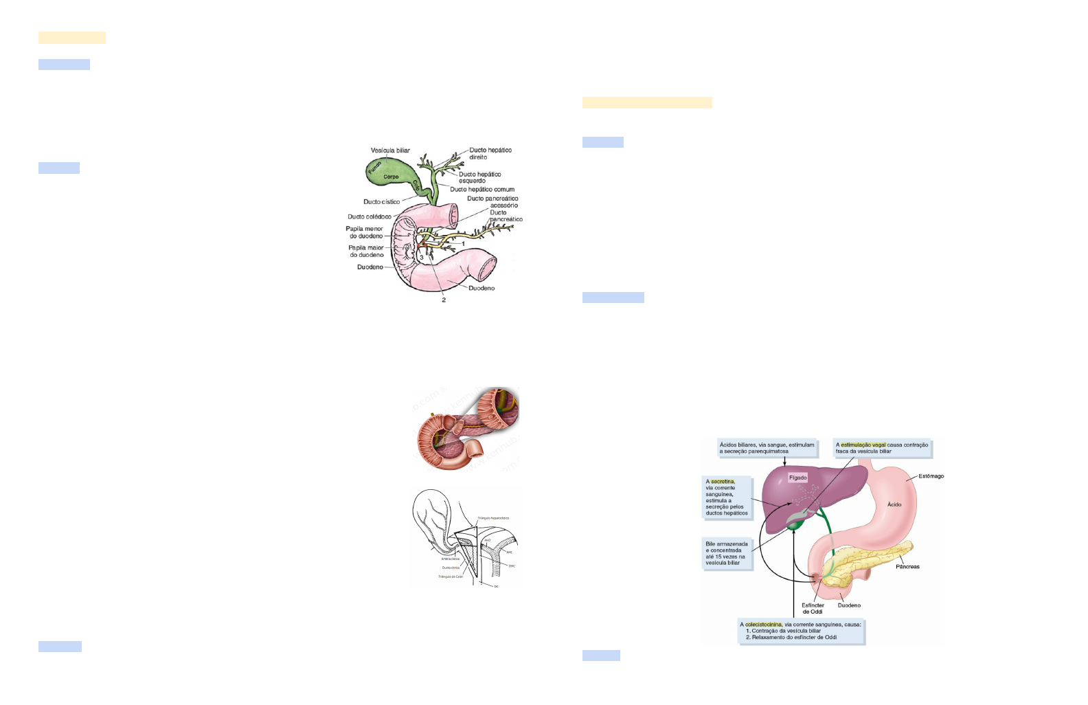 Júlia Demuner - MED UVV XXIX Vesícula Biliar - Moore cap.2, Kierszenbaum cap.17, Guyton cap. 75 Embriologia O fígado, a vesícula biliar e o sistema de ductos biliares surgem como um crescimento ventral, o divertículo hepático, a partir da porção distal do intestino anterior no início da 4ª semana. - Porção cranial maior do divertículo hepático: é o primórdio do fígado; - Porção caudal menor torna-se o primórdio da vesícula biliar; - Pedúnculo do divertículo forma o ducto cístico; - Na 13ª semana a bile é lançada no duodeno pelo ducto biliar. Anatomia A vesícula biliar tem de 7 a 10 cm de comprimento e situa-se na fossa da vesícula biliar na face visceral do fígado , tendo capacidade de armazenar até 50 ml de bile . Subdivide-se em três partes: - Fundo: a extremidade larga e arredondada circundada e unida ao corpo/colo por peritônio . - Corpo: parte principal, que toca a face visceral do fígado, o colo transverso e a parte superior do duodeno. - Colo: extremidade estreita e afilada voltada para a porta do fígado que se une ao ducto cístico . Vias Biliares Os hepatócitos secretam bile para os canalículos biliares formados entre eles, os quais drenam para os pequenos ductos biliares interlobulares e depois para os grandes ductos biliares coletores da tríade portal intra-hepática , que se fundem para formar os ductos hepáticos direito e esquerdo . Os ductos hepáticos direito e esquerdo drenam as partes direita e esquerda do fígado, respectivamente, unindo-se para formar o ducto hepático comum , que recebe no lado direito o ducto cístico , dando origem, por fim, ao ducto colédoco , que conduz a bile para o duodeno. ductos intra-hepáticos → ducto hepático D + E → ducto hepático comum → ducto hepático comum + ducto hepático cístico (vesícula) → ducto biliar comum A região periampular consiste na localização da segunda porção duodenal próximo à ampola de Vater, região de confluência dos ductos pancreático e biliar , que que desaguam seus fluidos neste local. O trígono cisto-hepático ou trígono de Calot é um espaço anatômico delimitado pelo ducto hepático comum, ducto cístico e a borda inferior do fígado , sendo um marco anatômico para a realização da colecistectomia (retirada da vesícula). Vascularização A irrigação arterial da vesícula biliar, do ducto cístico e do colédoco provém principalmente da artéria cística (que tem origem na artéria hepática direita), enquanto a drenagem venosa geralmente entra diretamente no fígado ou na veia pancreaticoduodenal superior. ! Como a drenagem da vesícula entra diretamente no fígado ou no sistema porta, quaisquer problemas (cirrose, hipertensão portal) vão gerar consequências na vesícula. Histologia A parede da vesícula biliar é formada por uma túnica mucosa, uma túnica muscular e uma túnica adventícia, Júlia Demuner - MED UVV XXIX não apresentando submucosa . A mucosa apresenta múltiplas pregas que facilitam a adaptação do órgão a diversos estágios de seu preenchimento por bile, e é sustentada por uma lâmina própria que contém um plexo vascular, além disso, forma divertículos ou bolsas na mucosa, conhecidas como seios de Rokitansky-Aschoff . Fisiologia da Vesícula Biliar As principais funções da vesícula biliar são armazenamento, concentração e liberação da bile . Secreção A solução inicial é secretada pelas células principais do fígado, os hepatócitos, para os canalículos biliares, e contém grande quantidade de ácidos biliares, colesterol e outros constituintes orgânicos . Em seguida, a bile flui pelos canalículos em direção aos septos interlobulares para desembocar nos ductos biliares terminais, fluindo então, para ductos progressivamente maiores, até chegar ao ducto hepático e ao ducto biliar comum. Desde esses ductos, a bile flui diretamente para o duodeno ou é encaminhada ao ducto cístico e armazenada na vesícula biliar. Nesse percurso pelos ductos biliares , a segunda porção da secreção hepática é acrescentada à bile inicial, adicionando uma solução aquosa de íons sódio e bicarbonato , secretada pelas células epiteliais que revestem os canalículos e ductos e estimulada especialmente pela secretina . Esvaziamento Quando o alimento começa a ser digerido no trato gastrointestinal superior, a vesícula biliar começa a se esvaziar, especialmente quando alimentos gordurosos chegam ao duodeno. Este esvaziamento se dá por contrações rítmicas da parede da vesícula biliar , com o relaxamento simultâneo do esfíncter de Oddi , que controla a entrada do ducto biliar comum no duodeno. O estímulo mais potente para as contrações da vesícula biliar é o hormônio CCK , liberado após a constatação da presença de alimentos gordurosos no duodeno , porém, a vesícula biliar também é estimulada, com menor intensidade, por fibras nervosas secretoras de acetilcolina , tanto no nervo vago como no sistema nervoso entérico. Além disso, quando o alimento não contém gorduras , a vesícula biliar também se esvazia, mas faz isso lentamente. Funções Os sais biliares têm ação detergente , sobre as partículas de gordura dos alimentos, atuam diminuindo a Júlia Demuner - MED UVV XXIX tensão superficial das partículas , o que permite que a agitação no trato intestinal as quebre em partículas diminutas, processo denominado função emulsificante ou detergente dos sais biliares. Além disso, os sais biliares ajudam na absorção de ácidos graxos, monoglicerídeos, colesterol e outros lipídios pelo trato intestinal mediante a formação de complexos físicos bem pequenos denominados micelas , os quais são semissolúveis no quimo devido às cargas elétricas dos sais biliares. Cálculos Biliares Sob condições anormais, o colesterol pode se precipitar na vesícula biliar, resultando na formação de cálculos biliares de colesterol , a colelitíase. Os sais biliares são formados nas c