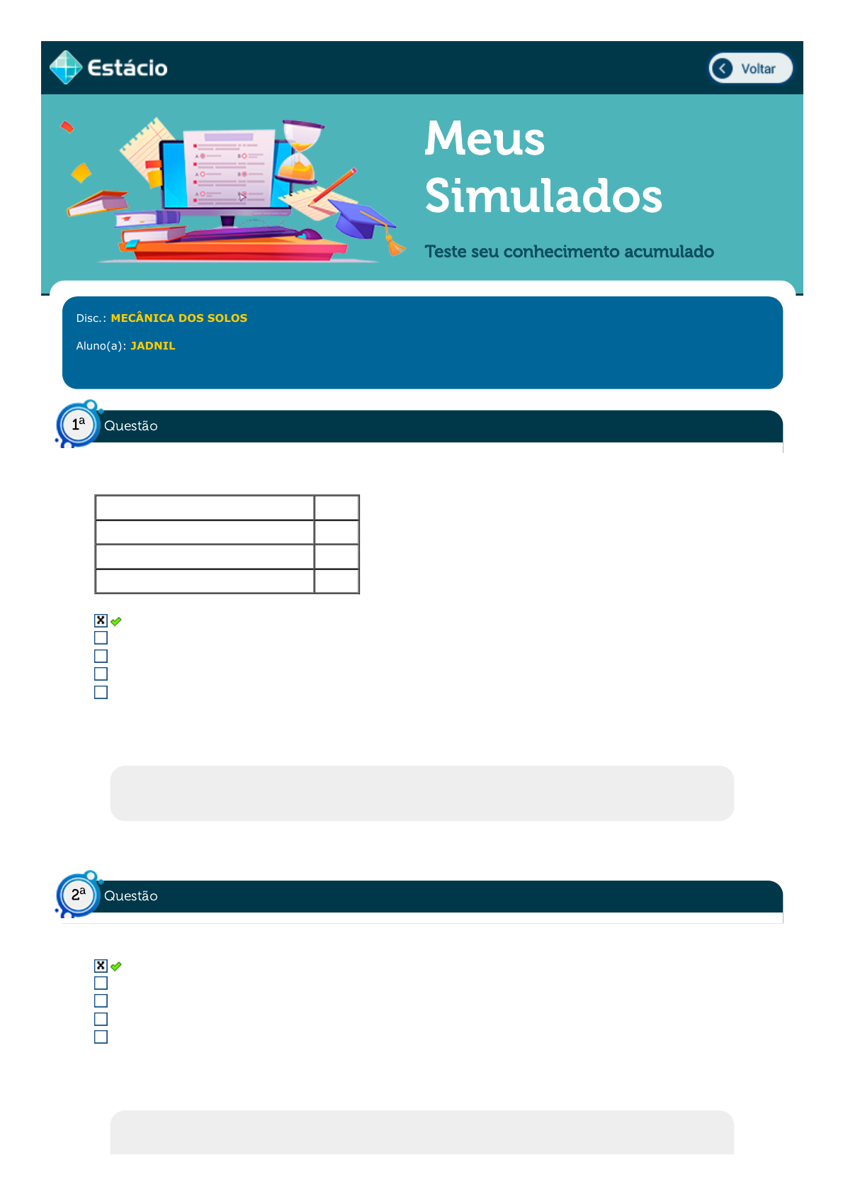 11/09/2022 19:46 Estácio: Alunos https://simulado.estacio.br/alunos/ 1/5 Meus Simulados Teste seu conhecimento acumulado Disc.: MECÂNICA DOS SOLOS Aluno(a): JADNILTON FONSECA DA SILVA 202001014772 Acertos: 8,0 de 10,0 11/09/2022 Acerto: 1,0 / 1,0 Os principais resultados de ensaios de granulometria e plasticidade de um dado solo estão disponíveis a seguir. De acordo com a classificação rodoviária (TRB), esse solo deve ser classificado como: Retido na peneira nº 200 28% LL 47% LP 22% IG 2 A-2-7 A-7-5 A-2-4 A-7-6 A-2-5 Respondido em 11/09/2022 19:37:45 Explicação: Resposta correta: A-2-7 Acerto: 1,0 / 1,0 Dentre os minerais abaixo, aquele que tem a menor dureza é: Talco Diamante Feldspato Topázio Gipsita Respondido em 11/09/2022 19:38:09 Explicação: Questão1 a Questão2 a https://simulado.estacio.br/alunos/inicio.asp javascript:voltar(); 11/09/2022 19:46 Estácio: Alunos https://simulado.estacio.br/alunos/ 2/5 Resposta correta: Talco Acerto: 1,0 / 1,0 Numa série de cinco ensaios de compactação foram obtidos os seguintes resultados: Dentre as opções abaixo, assinale a umidade ótima. 10% de umidade 14% de umidade 12% de umidade 20% de umidade 17% de umidade Respondido em 11/09/2022 19:38:35 Explicação: A resposta certa é: 14% de umidade Acerto: 1,0 / 1,0 Observe a figura abaixo. Se ao invés de 3 camadas estratificadas, fossem 10 camadas, qual seria o valor do coeficiente de permeabilidade resultante? Considere que todas as camadas tenham a mesma espessura e o coeficiente de permeabilidade igual a K: K/50 K/5 K K/2 K/10 Respondido em 11/09/2022 19:38:58 Explicação: A resposta certa é: K Questão3 a Questão4 a 11/09/2022 19:46 Estácio: Alunos https://simulado.estacio.br/alunos/ 3/5 Acerto: 1,0 / 1,0 Sobre os ensaios de adensamento, assinale a alternativa correta: O cálculo do recalque leva em consideração o volume aparente do solo e sua umidade, sem a necessidade de determinar o volume real do solo. O adensamento do solo aumenta o número de vazios, quando o solo é duro, e diminui o número de vazios, quando o solo é mole. Quanto menor o número de lacunas vazias no interior do solo, menor é o recalque sofrido por ele. O adensamento do solo aumenta o número de vazios, quando o solo é mole, e diminui o número de vazios, quando o solo é duro. Com o ensaio edométrico, é possível determinar somente a umidade do solo não adensado. Respondido em 11/09/2022 19:39:35 Explicação: A resposta certa é:Quanto menor o número de lacunas vazias no interior do solo, menor é o recalque sofrido por ele. Acerto: 1,0 / 1,0 Considerando o coeficiente de Poisson igual a 0,35 e E = 55MPa, calcule o recalque inicial devido a um carregamento de 3.000kN em uma sapata rígida de base retangular de lados iguais a 2m e 10m: 3,2mm 4,8mm 4,0mm 3,6mm 4,4mm Respondido em 11/09/2022 19:39:59 Explicação: A resposta certa é:4,8mm Acerto: 1,0 / 1,0 A forma mais acurada de se obter o coeficiente de adensamento para estimativa de recalques e tempo até que ocorra em adensamentos em solos é por meio do (a): Método de Pacheco e Silva a partir dos resultados de ensaio edométrico. Correlações com o índice de plasticidade. Método de Taylor a partir dos resultados de ensaio edométrico. Retroanálise de casos reais em campo. Método de Casagrande a partir dos resultados de ensaio edométrico. Respondido em 11/09/2022 19:40:50 Explicação: A resposta certa é: Retroanálise de casos reais em campo. Questão5 a Questão6 a Questão7 a 11/09/2022 19:46 Estácio: Alunos https://simulado.estacio.br/alunos/ 4/5 Acerto: 1,0 / 1,0 Um engenheiro coletou amostras de argila compressível para estimar os parâmetros do adensamento em laboratório. Se durante o transporte a amostra sofreu vibração, pode-se afirmar que a amostra é indeformada, e o índice de vazios é menor que o do campo. a amostra é amolgada, e o índice de vazios é maior que o do campo. a amostra é indeformada, e o coeficiente de compressão é menor que o do campo. a amostra é amolgada, e o coeficiente de recompressão é maior que o do campo. a amostra é amolgada, e o coeficiente de compressão é maior que o do campo. Respondido em 11/09/2022 19:41:53 Explicação: A resposta certa é: a amostra é amolgada, e o coeficiente de recompressão é maior que o do campo. Acerto: 0,0 / 1,0 Caso uma areia esteja em campo com o índice de vazios igual ao crítico para a tensão confinante, até a ruptura, o solo apresenta: Aumento na poro-pressão. Nenhuma alteração na poro-pressão ou no volume. Diminuição na poro-pressão. Aumento de volume. Diminuição de volume. Respondido em 11/09/2022 19:43:14 Explicação: A resposta certa é:Nenhuma alteração na poro-pressão ou no volume. Acerto: 0,0 / 1,0 O ensaio realizado em laboratório para reconhecimento da resistência ao cisalhamento dos solos em que é possível controlar as condições de drenagem é o ensaio de: Triaxial Cone Palheta Compressão simples Cisalhamento direto Respondido em 11/09/2022 19:43:48 Explicação: A resposta certa é: Triaxial Questão8 a Questão9 a Questão10 a 11/09/2022 19:46 Estácio: Alunos https://simulado.estacio.br/alunos/ 5/5 javascript:abre_colabore('38403','292920150','5638211877');