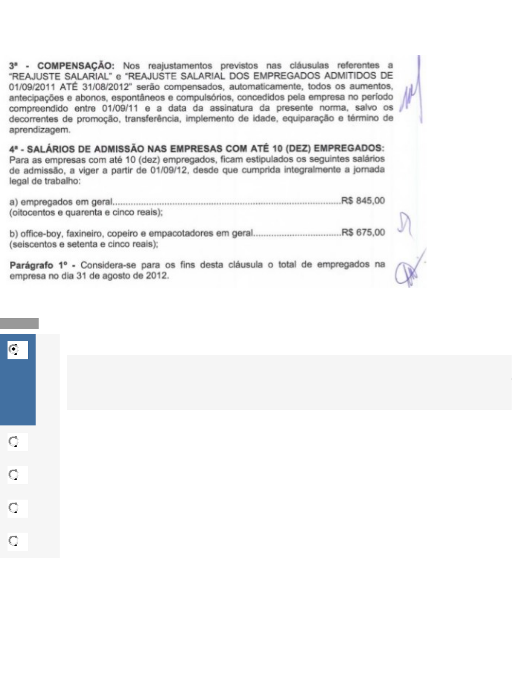 Leia o exemplo a seguir que apresenta um trecho de uma negociação coletiva realizada. Baseado neste trecho e no conteúdo estudado, assinale a alternativa correta. Nota: 10.0 A Trata-se de um trecho de uma convenção coletiva de trabalho; Você acertou! A alternativa correta é a “a”, pois ao diferenciar o salário de admissão para empresas de até 10 empregados, pressupõe-se que engloba diversas empresas, característica da convenção coletiva de trabalho. No caso do acordo coletivo de trabalho, o documento é exclusivo para a empresa que está em negociação com o sindicato (Aula 5). B Trata-se de um trecho de um acordo coletivo de trabalho; C Trata-se de um trecho de um contrato individual de trabalho; D Trata-se de um trecho da Consolidação das Leis do Trabalho; E Trata-se de um trecho da Constituição Federal de 1988. Questão 2/10 - Relações Trabalhistas Os direitos da licença-maternidade variam muito de país para país, conforme aponta pesquisa realizada pela Organização Internacional do Trabalho, conforme apresentado na figura a seguir. No que tange o resultado da pesquisa apresentado, é correto afirmar: Nota: 10.0 A A Irlanda, apesar de configurar como um dos países com os maiores períodos de licença-maternidade, só paga 62% do salário nominal da gestante; B Dos vinte países pesquisados, 85% deles encontram-se em uma faixa inferior ao Brasil no que tange a concessão da licença-maternidade; C A Noruega e o Reino Unido lideram o ranking de países com o maior período de licença-maternidade elencados na pesquisa; Você acertou! A alternativa correta é a “c”, uma vez que a alternativa “a” está incorreta, pois a figura apresenta o percentual de dias remunerados, não percentual do salário da gestante. A alternativa “b” está incorreta, pois 75% dos países encontra-se em uma faixa inferior a do Brasil e Portugal. A alternativa “d” está incorreta, pois o percentual apresentado refere-se ao percentual de dias trabalhados. A alternativa “e” está incorreta, uma vez que a figura não apresenta dados que tratam de evolução nos direitos das novas mães. (Aula 6). D A figura apresenta, além dos períodos de licença-maternidade, o percentual de salário nominal pago à gestante; E Os dados apresentados na figura referem-se a evolução nos direitos das novas mães no que tange à concessão de sua licença-maternidade. Questão 3/10 - Relações Trabalhistas Leia o trecho a seguir: A Justiça baiana decretou nesta quarta-feira (09) a ilegalidade da greve dos professores da rede municipal de ensino. Parte dos docentes paralisou as atividades há cinco dias. A decisão é da desembargadora Sandra Inês Moraes Rusciolelli Azevedo. A decisão determina também o retorno imediato às atividades, com multa diária estabelecida em R$ 50 mil em caso de descumprimento. A decisão judicial atendeu ao pedido da Prefeitura. Considerando o trecho apresentado e o conteúdo estudado, analise as afirmativas a seguir no que tange os motivos pelos quais a greve pode ser considerada ilegal: I. Falta de comunicação sobre o início da greve ao empregador com 24 horas de antecedência; II. Proibição do acesso ao trabalho daqueles empregados que decidiram por não aderir à greve; III. Garantia, durante o período da greve, da manutenção dos serviços indispensáveis e inadiáveis à população; IV. Inexistência de uma assembleia geral de trabalhadores para decidir ou não pela greve. São corretas as afirmativas: Nota: 10.0 A Afirmativas II e IV, apenas. Você acertou! A alternativa “a” está correta. As afirmativas I e IV estão corretas e podem conduzir a decisão da ilegalidade da greve. A alternativa II está incorreta, uma vez que, o prazo de comunicação deve ser de 48 horas para serviços normais e 72 horas para serviços essenciais. A afirmativa III está incorreta, pois a garantia, durante o período da greve, da manutenção dos serviços indispensáveis e inadiáveis à população, garante a legalidade da greve, sendo uma das condições para tal. (Aula 5). B Afirmativas I e II, apenas. C Afirmativas I, II e IV, apenas. D Afirmativas III e IV, apenas. E Afirmativas II e III, apenas. Questão 4/10 - Relações Trabalhistas Várias são as causas de extinção do contrato individual de trabalho, dentre elas, algumas por iniciativa do empregado, outras por iniciativa do empregador. Encontramos entre as causas de extinção do contrato de trabalho a dispensa indireta, que acontece quando: Nota: 10.0 A O empregado pede demissão B O empregador der causa, por motivo justo Você acertou! A dispensa indireta é a possibilidade de o empregado exigir a rescisão do contrato de trabalho, pois seu empregador é quem deu causa, por motivo justo. (Aula 4 tema 5) C O empregado comete atos de justa causa D O contrato é por prazo determinado e termina o seu termo E For somente contrato de experiência Questão 5/10 - Relações Trabalhistas Certa funcionária grávida em sua última semana de gestação interrompe seu contrato individual de trabalho para que possa ter uma tranquilidade maior na espera de seu parto. O período pelo qual a gestante pode paralisar o seu contrato de trabalho, conhecido como licença-maternidade, tendo a garantia de salário e de emprego está previsto na Carta Magna/88, assim definido: Nota: 10.0 A Que será de 180 (cento e oitenta) dias. B Que terá duração mínima de 120 (cento e vinte) podendo se estender até 180 (cento e oitenta) dias, se assim entender o empregador. C Que deverá ser de 150 (cento e cinquenta) dias. D Que deverá ter a duração de 180 (cento e oitenta) dias, podendo ser reduzido, mediante acordo ou convenção coletiva de trabalho. E Que deverá ser de 120 (cento e vinte) dias. Você acertou! A alternativa e está correta. O artigo 7º, inciso XVIII, concede à gestante, sem prejuízo do emprego e do salário, licença com a duração de cento e vinte dias. Questão 6/10 - Relações Trabalh