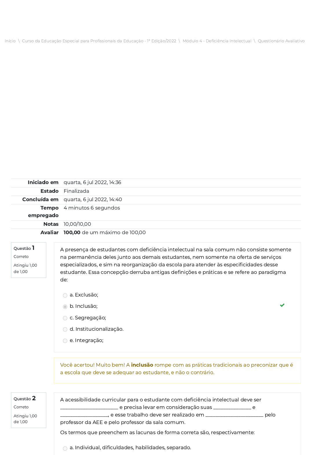 Início \ Curso da Educação Especial para Pro�ssionais da Educação - 1ª Edição/2022 \ Módulo 4 - De�ciência Intelectual \ Questionário Avaliativo Questão 1 Correto Atingiu 1,00 de 1,00 Questão 2 Correto Atingiu 1,00 de 1,00 Iniciado em quarta, 6 jul 2022, 14:36 Estado Finalizada Concluída em quarta, 6 jul 2022, 14:40 Tempo empregado 4 minutos 6 segundos Notas 10,00/10,00 Avaliar 100,00 de um máximo de 100,00 A presença de estudantes com de�ciência intelectual na sala comum não consiste somente na permanência deles junto aos demais estudantes, nem somente na oferta de serviços especializados, e sim na reorganização da escola para atender às especi�cidades desse estudante. Essa concepção derruba antigas de�nições e práticas e se refere ao paradigma de: a. Exclusão; b. Inclusão; c. Segregação; d. Institucionalização. e. Integração; Você acertou! Muito bem! A inclusão rompe com as práticas tradicionais ao preconizar que é a escola que deve se adequar ao estudante, e não o contrário. A acessibilidade curricular para o estudante com de�ciência intelectual deve ser _______________________ e precisa levar em consideração suas _______________ e ___________________, e esse trabalho deve ser realizado em _______________________ pelo professor da AEE e pelo professor da sala comum. Os termos que preenchem as lacunas de forma correta são, respectivamente: a. Individual, di�culdades, habilidades, separado. https://avaefape2.educacao.sp.gov.br/my/ https://avaefape2.educacao.sp.gov.br/course/view.php?id=225 https://avaefape2.educacao.sp.gov.br/course/view.php?id=225#section-6 https://avaefape2.educacao.sp.gov.br/mod/quiz/view.php?id=10368 Questão 3 Correto Atingiu 1,00 de 1,00 Questão 4 Correto Atingiu 1,00 de 1,00 b. Separado, competências, habilidades, separado. c. Individual, competências, habilidades, separado. d. Coletivamente, di�culdades, habilidades, separado. e. Individual, competências, habilidades, parceria. Você acertou! Muito bem! A acessibilidade curricular deve ser pensada e adequada para cada estudante; por isso, deve ser individualizada e realizada em conjunto por docentes da sala comum e do Atendimento Educacional Especializado. As acessibilidades curriculares possibilitam que docentes atuem e auxiliem estudantes com de�ciência intelectual e têm o objetivo de: a. Substituir o trabalho realizado pelo(a) docente. b. Subsidiar o trabalho realizado pelo(a) docente. c. Enfraquecer o trabalho realizado pelo(a) docente. d. Ocultar o trabalho realizado pelo(a) docente. e. Minimizar o trabalho realizado pelo(a) docente. Você acertou! Muito bem! A acessibilidade curricular auxilia estudantes e docentes, que terão condições de apoiar as necessidades especí�cas e respeitar as potencialidades em um instrumento preparado exclusivamente para o estudante com de�ciência. O caso a seguir é �ctício. Leia-o atentamente. Joaquim está no 4º ano do Ensino Fundamental, tem 10 anos e frequenta uma escola da rede estadual de ensino do estado de São Paulo. Ele possui o diagnóstico de de�ciência intelectual e lê e escreve palavras e frases curtas. Conta até 20, realiza cálculos de adição e subtração com dezenas simples e realiza a divisão com material concreto. Leia as a�rmações a seguir: I. O _____________________ propõe que, para atender às especi�cidades de Joaquim, o(a) docente deve desenhar a sua aula utilizando diversos recursos e estratégias, a �m de propiciar o acesso ao conteúdo de uma forma mais signi�cativa e acessível. II. Antes de produzir as atividades para o Joaquim, é necessário que o(a) docente realize uma _______________ para conhecer e avaliar o seu repertório. III. O(a) docente da sala regular, junto o(a) docente do Atendimento Educacional Especializado, deve planejar as aulas considerando as _______________ de Joaquim. Assinale a alternativa em que a sequência de palavras preenche corretamente as lacunas. a. Mapa da empatia – avaliação formativa – preferências. b. Desenho Universal da Aprendizagem – avaliação diagnóstica – especi�cidades. c. Mapa da empatia – avaliação somativa – especi�cidades. d. Storytelling – avaliação diagnóstica – especi�cidades. e. Storytelling – avaliação somativa – di�culdades. Você acertou, parabéns! O Desenho Universal da Aprendizagem propõe que, para atender Questão 5 Correto Atingiu 1,00 de 1,00 Questão 6 Correto Atingiu 1,00 de 1,00 p p g p p q p às especi�cidades de Joaquim, o(a) docente deve desenhar a sua aula utilizando diversos recursos e estratégias, a �m de propiciar o acesso ao conteúdo de uma forma mais signi�cativa e acessível. Antes de produzir as atividades para o Joaquim, é necessário que o(a) docente realize uma avaliação diagnóstica para conhecer e avaliar o seu repertório. O(a) docente da sala regular, junto com o(a) docente do Atendimento Educacional Especializado, deve planejar as aulas considerando as especi�cidades de Joaquim. De acordo com Lei no 9.394/96 que estabelece as diretrizes e bases da educação nacional e com a Política de Educação Especial do Estado de São Paulo, os sistemas de ensino deverão providenciar currículos, métodos e recursos educativos, entre outros, que assegurarão a plena participação do estudante com de�ciência. Então: a. A família deve ser comunicada de que o estudante com de�ciência deve sempre receber a nota 5,0, pois não é necessário realizar as atividades escolares. b. Cabe à escola realizar um trabalho de parceria com todos os docentes envolvidos na vida escolar desse estudante com de�ciência e, assim, procurar a melhor forma de trabalhar o currículo e as atividades avaliativas. c. Somente o professor do Atendimento Educacional Especializado é o responsável em realizar a acessibilidade curricular e avaliar o estudante com de�ciência intelectual. d. A direção escolar deverá comunicar o docente da s
