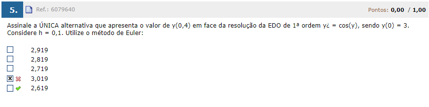 7 Marcar para revisão Assinale a ÚNICA alternativa que apresenta o valor de y(0,4) em face da resolução da EDO de 1º ordem y = y² +3, sendo y(0) ...