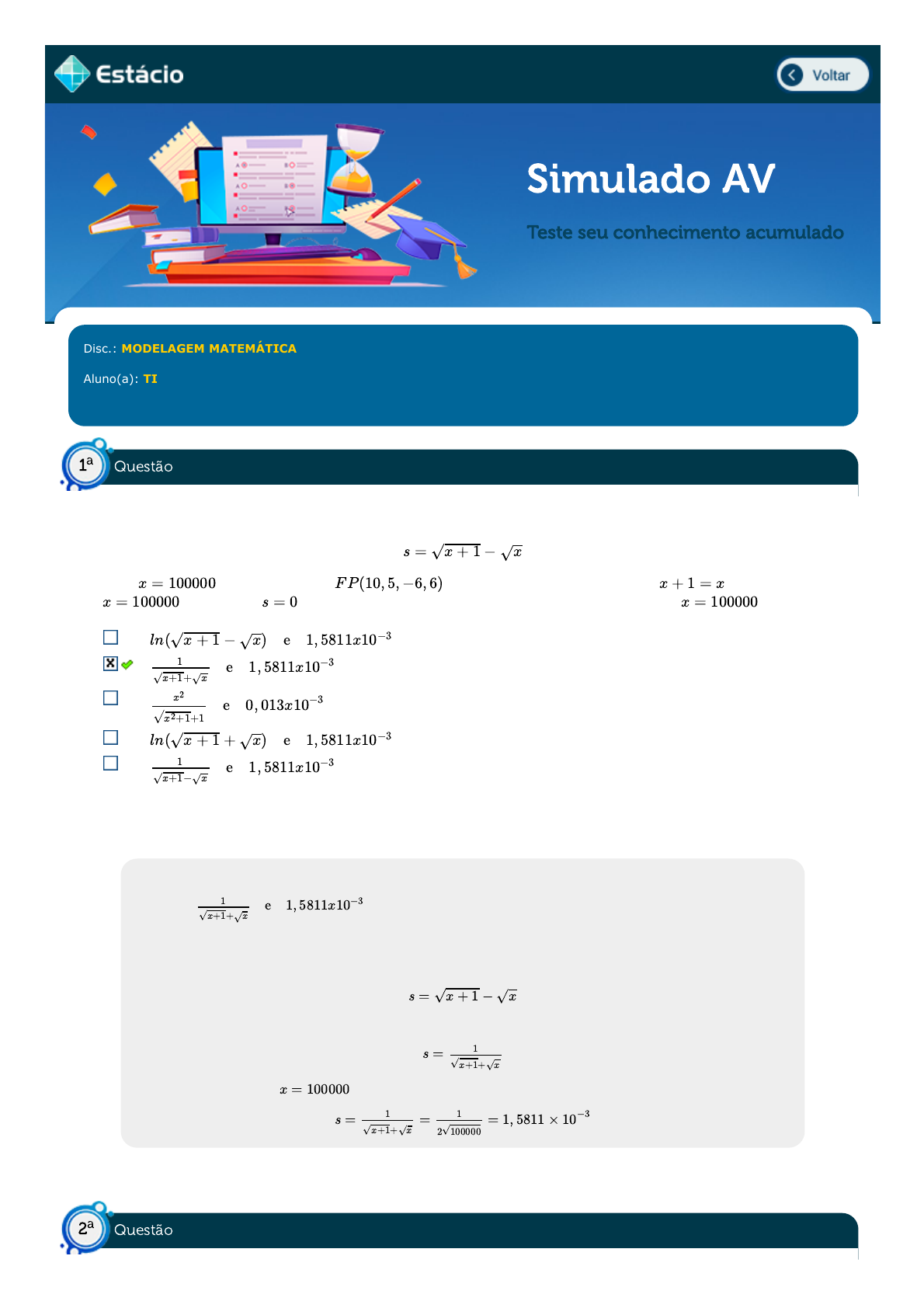 31/03/2022 10:58 Estácio: Alunos https://simulado.estacio.br/alunos/ 1/9 Simulado AV Teste seu conhecimento acumulado Disc.: MODELAGEM MATEMÁTICA Aluno(a): TIAGO BARBOSA SILVA 202008192951 Acertos: 7,0 de 10,0 31/03/2022 Acerto: 1,0 / 1,0 Para evitar erros de cancelamento em operações de subtração de dois números numa notação de ponto flutuante, é comum reorganizar as operações. Seja a expressão: onde num computador , observe que nesse computador , para , resultando . Determine uma expressão equivalente e o seu valor para . Respondido em 31/03/2022 10:42:33 Explicação: Gabarito: Justificativa: Tem-se que a expressão equivalente pode ser obtida da seguinte maneira: ou seja, Então, o valor de s para é Acerto: 0,0 / 1,0 s = √x + 1 − √x x = 100000 FP(10, 5, −6, 6) x + 1 = x x = 100000 s = 0 x = 100000 ln(√x + 1 − √x) e 1, 5811x10−3 e 1, 5811x10−31 √x+1+√x e 0, 013x10−3 x2 √x2+1+1 ln(√x + 1 + √x) e 1, 5811x10−3 e 1, 5811x10−31 √x+1−√x e 1, 5811x10−31 √x+1+√x s = √x + 1 − √x s = 1 √x+1+√x x = 100000 s = = = 1, 5811 × 10−31 √x+1+√x 1 2√100000 Questão1 a Questão2 a https://simulado.estacio.br/alunos/inicio.asp javascript:voltar(); 31/03/2022 10:58 Estácio: Alunos https://simulado.estacio.br/alunos/ 2/9 (Metrô - SP / 2010) Na conversão de uma base decimal para outra base qualquer, o processo direto é composto por duas partes: Divisão sucessiva da parte inteira e soma sucessiva da parte fracionária. Subtração sucessiva da parte inteira e multiplicação sucessiva da parte fracionária. Divisão sucessiva da parte inteira e multiplicação sucessiva da parte fracionária. Divisão sucessiva da parte inteira e subtração sucessiva da parte fracionária. Soma sucessiva da parte inteira e multiplicação sucessiva da parte fracionária. Respondido em 31/03/2022 10:32:58 Explicação: Gabarito: Divisão sucessiva da parte inteira e multiplicação sucessiva da parte fracionária. Justificativa: A resposta é simplesmente a definição de transformação de um número decimal para uma base b, observando que, nesse processo, nos interessa os restos e o quociente final das divisões sucessivas da parte inteira, e na parte fracionária, a parte inteira do produto. Acerto: 1,0 / 1,0 A interpolação de Lagrange utiliza os seguintes polinômios básicos pelas propriedades desses polinômios podemos afirmar que Ln,m(xk) é igual a: 1 xm ym 0 xk Respondido em 31/03/2022 10:48:31 Explicação: Pela propriedade e construção dos polinômios básicos de Lagrange temos: Acerto: 1,0 / 1,0 É dado um conjunto de pontos que possui 5 coordenadas (x,y), deseja-se usar uma base de monômios para obter um polinômio de grau 4 , a ordem da matriz utilizada para calcular os coeficientes desse polinômio interpolador é: 3x3 4x4 7x7 6x6 5x5 Respondido em 31/03/2022 10:55:07 Explicação: Questão3 a Questão4 a 31/03/2022 10:58 Estácio: Alunos https://simulado.estacio.br/alunos/ 3/9 Como temos 5 pontos e o polinômio interpolador possui 5 coeficientes para determinar, necessitamos de uma matriz 5x5. Acerto: 1,0 / 1,0 Assinale a ÚNICA alternativa que apresenta o valor da integral de cos(-x) no intervalo de 0 a 1. Divida o intervalo de integração em 10 partes. Utilize o método de Simpson: 0,841 0,541 0,641 0,741 0,941 Respondido em 31/03/2022 10:05:45 Explicação: A resolução do problema de integração numérica em um intervalo definido requer que o enunciado forneça alguns elementos importantes, como: - A função a ser integrada; - O valor inicial do intervalo de integração; - O valor final do intervalo de integração; e - A quantidade de intervalos (ou o tamanho de cada intervalo). Neste exemplo, temos que: - A função a ser integrada é f(x) = cos(-x); - O valor inicial do intervalo de integração é 0; - O valor final do intervalo de integração é 1; e - O intervalo de integração é dividido em 10 partes, de modo que o tamanho de cada intervalo é 0,1. Assim, aplicando os conceitos para o método de Simpson, temos o código em Python indicado a seguir: import numpy as np import math f = lambda x: np.cos(-x) a = 0; b = 1; N = 10 x = np.linspace(a,b,N+1) y = f(x) dx = (b-a)/N soma_Simpson = dx/3 * np.sum(y[0:-1:2] + 4*y[1::2] + y[2::2]) print("Integral:",soma_Simpson) O resultado obtido corresponde à alternativa indicada como correta na questão. Acerto: 0,0 / 1,0 Assinale a ÚNICA alternativa que apresenta o valor da integral de sen(x) no intervalo de 0 a 1. Utilize o método de Romberg, com aproximação até n = 2: 0,49970 0,55970 Questão5 a Questão6 a 31/03/2022 10:58 Estácio: Alunos https://simulado.estacio.br/alunos/ 4/9 0,65970 0,45970 0,41970 Respondido em 31/03/2022 10:50:23 Explicação: A resolução do problema de integração numérica em um intervalo definido requer que o enunciado forneça alguns elementos importantes, como: - A função a ser integrada; - A técnica de integração a ser utilizada; - O valor inicial do intervalo de integração; - O valor final do intervalo de integração; e - A quantidade de partições (n) Neste exemplo, temos que: - A função a ser integrada é f(x) = sen(x); - A técnica de integração a ser utilizada é a Extrapolação de Romberg; - O valor inicial do intervalo de integração é 0; - O valor final do intervalo de integração é 1; e - A quantidade de partições é dada por 2n, sendo n = 2. Assim, aplicando os conceitos ensinados na aula de hoje para o método de Romberg, temos o código em Python indicado a seguir: import scipy as sp from scipy import integrate func = lambda x:sp.sin(x) result = integrate.romberg(func, 0, 1, show=True) Acerto: 1,0 / 1,0 Assinale a ÚNICA alternativa que apresenta o valor de y(3) em face da resolução da EDO de 1ª ordem y'= sen2(y), sendo y(0) = 0,2. Considere h = 0,30. Utilize o método de Runge-Kutta: 0,677 0,777 0,577 0,877 0,477 Respondido em 31/03/2022 10:08:25 Explicação: A resolução do problema de va