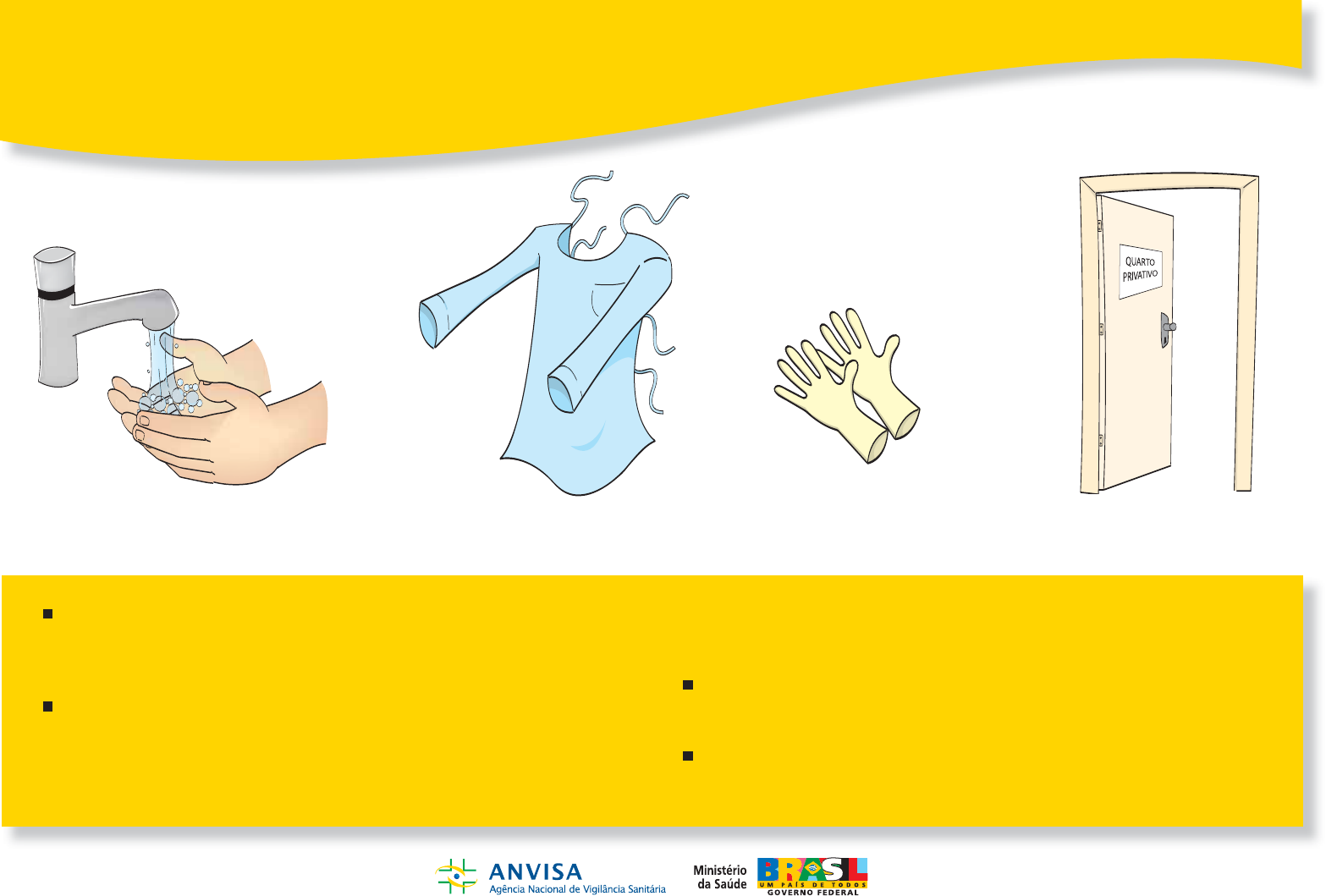 Precaução de Contato Higienize as mãos antes e após o contato com o paciente; use óculos, máscara cirúrgica e avental quando houver risco de contato com san- gue ou secreções; e descarte adequadamente os pérfuro-cortantes. Use luvas e avental em toda manipulação do paciente, de cateteres e de sondas, do circuito e do equipamento ventilatório e de outras su- perfícies próximas ao leito. Coloque-os imediatamente antes do conta- to com o paciente ou com as superfícies e retire-os logo após o uso, higienizando as mãos em seguida. Quando não houver disponibilidade de quarto privativo, a distân- cia mínima entre dois leitos deve ser de um metro. Equipamentos como termômetro, esfignomanômetro e estetoscó- pio devem ser de uso exclusivo do paciente. Higienização das mãos Avental Luvas Quarto privativo