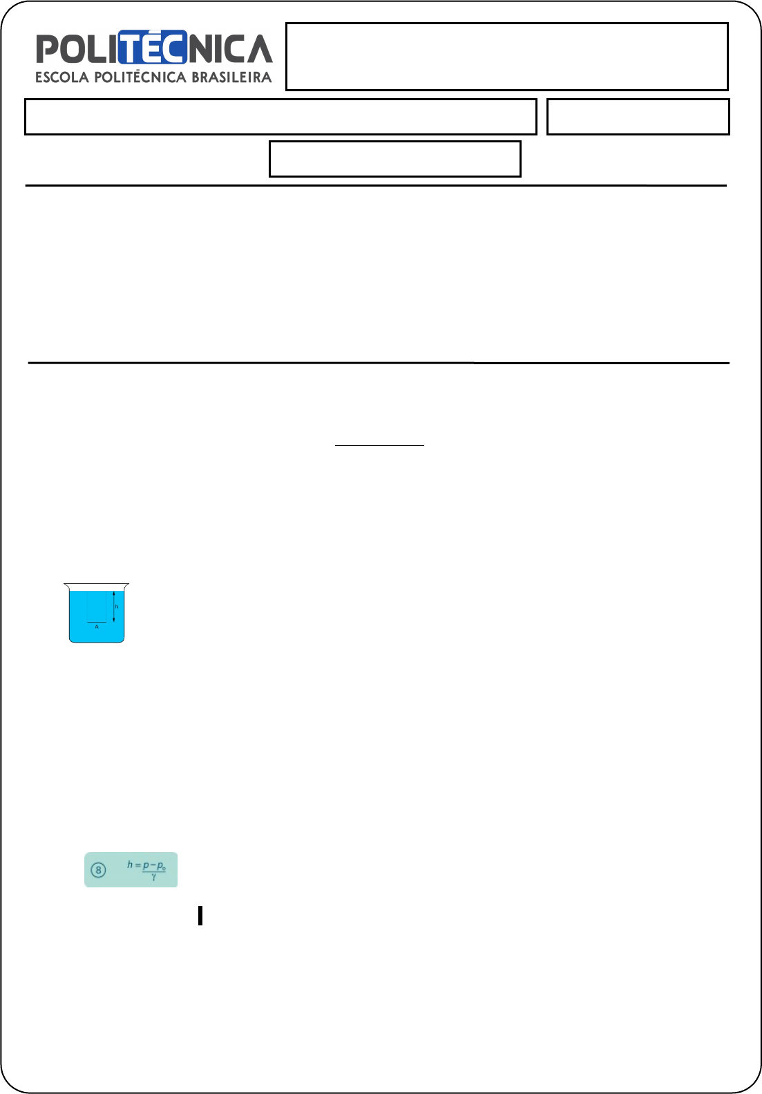 Mecânica dos Fluidos Aluno (a): JOEL ALVES DE BRITO Data: 04 / 10 /2022 Atividade de Aprendizagem 01 ORIENTAÇÕES: · Esta Atividade contém 08 questões, totalizando 10 (dez) pontos. · Ler atentamente as instruções contidas no documento é de fundamental importância na realização da avaliação. · Para esta atividade o aluno poderá utilizar-se das ferramentas de pesquisas como: internet, artigos científicos, manuais técnicos, livros e literaturas disponibilizadas em nossa biblioteca. · Você deve preencher dos dados no Cabeçalho para sua identificação - Nome / Data de entrega · Ao terminar grave o arquivo com o nome Atividade de Envio (nome do aluno). · A nota será lançada no sistema. · O prazo de correção é de até 07 (sete) dias úteis. · Envie o arquivo pelo sistema em formato digital em PDF ou WORD. Bons Estudos! Observação: Só será avaliada a questão que apresentar o seu respectivo desenvolvimento. QUESTÕES 1. Descreva como se comporta a distribuição da pressão hidrostática em uma massa fluida? Pressão hidrostática A pressão hidrostática relaciona a força por unidade de área que atua sobre um corpo, o qual está imerso em um fluido. A pressão hidrostática depende da aceleração gravitacional, da densidade do fluido e da profundidade que o corpo se encontra. Quanto mais profundo o corpo estiver, maior será a pressão hidrostática exercida sobre ele. Por conta disso, os submarinos possuem formas cilíndricas e construções reforçadas. 2. O que se entende por altura de carga? A altura h [m] é também conhecida como altura de carga e pode ser interpretada como a altura de uma coluna de líquido de peso específico γ [N/m³] necessária para manter uma diferença de pressão p – po, ou seja 3. Explique em uma figur a as diferenças entre pressão manométrica e pressão absoluta? A pressão absoluta é medida tendo como referência a pressão de zero absoluto, enquanto a pressão manométrica é medida tendo como referência a pressão atmosférica. Na figura abaixo, pode-se visualizar de uma forma gráfica a relação entre essas pressões 4. Qual a pressão manométrica em kPa em um recipiente contendo óleo cujo tubo piezométrico apresenta uma leitura de 0,30 m. Considere a densidade relativa do óleo igual a 0,9? Portanto, a pressão manométrica é: PA = 0,9 · 10.000 N/m3 · 0,3 m = 2.700 Pa = 2,7 kPa 5. Por que os medidores de pressão mecânicos ou elétricos são mais práticos que os manômetros de coluna de líquido? Os manômetros são amplamente utiliz ados, mas apresentam muitas desvantagens em relação a sua a plicação quando c omparados a outros dispositi vos mecânicos ou elétricos, como o medidor de pressão de Bourdon (Figura 1.10) ou os transdutores piez oelétricos ou de ex tensores resistivos (Figura 1.11). Na prática, esses dispositi vos são mais ágeis e m ais práticos p ara a realização da medição d as pressões do que os primeiros e, por isso, são os mais utiliz ados em plantas industriais. 6. No lado da sucção de uma bomba, um medidor de pressão de Bourdon mede 40 kPa de vácuo. Qual a pressão absoluta equivalente, se a pressão atmosférica absoluta é igual a 100 kPa? Pressão Absoluta = 100 kPa – 40 kPa = 60 kPa 7. Deduza a equação para determinar a pressão no reservatório B em função da pressão no reservatório A da Figura 1.8 da aula 01? P2 – P1 = γ1·h1 (1) Sendo P1 = PA, P2 – PA = γ1·h1 (2) P4 – P3 = - γ2·h2 (3) Sendo P2 = P3, P4 – P2 = - γ2·h2 (4) PB – P4 = - γ3·h3 (5) Somando-se as equações (2), (4) e (5): P2 – PA + P4 – P2 + PB – P4 = γ1·h1 - γ2·h2 - γ3·h3 PB – PA = γ1·h1 - γ2·h2 - γ3·h3 PB = γ1·h1 - γ2·h2 - γ3·h3 + PA 8. Qual a pressão sobre o casco de um submarino que viaja a 50 m abaixo da superfície livre? Considerando a pressão atmosférica igual a 100 kPa, quantas vezes a pressão sobre o casco é maior do que a pressão atmosférica? PSubmarino = PAtmosférica + γágua·h = 100 kPa + 10.000 N/m3 · 50 m = 100 kPa + 500 kPa = 600 kPa A pressão sobre o casco é 6x a pressão atmosférica. Atividade de Aprendizagem 01: Mecânica dos Fluidos
