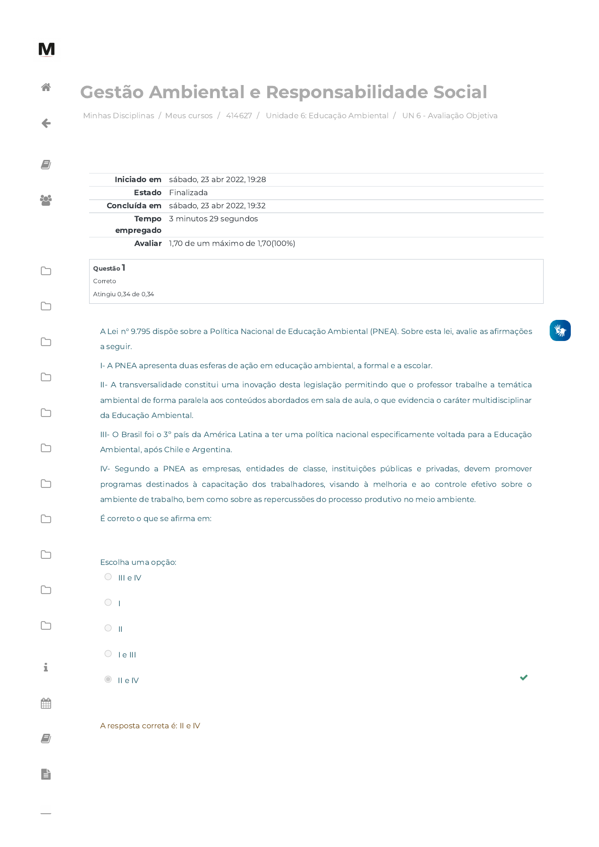 16/05/2022 14:03 UN 6 - Avaliação Objetiva: Revisão da tentativa https://avap.multivix.edu.br/mod/quiz/review.php?attempt=1094446&cmid=1028920 1/5 Minhas Disciplinas / Meus cursos / 414627 / Unidade 6: Educação Ambiental / UN 6 - Avaliação Objetiva Gestão Ambiental e Responsabilidade Social Iniciado em sábado, 23 abr 2022, 19:28 Estado Finalizada Concluída em sábado, 23 abr 2022, 19:32 Tempo empregado 3 minutos 29 segundos Avaliar 1,70 de um máximo de 1,70(100%) Questão 1 Correto Atingiu 0,34 de 0,34 A Lei n° 9.795 dispõe sobre a Política Nacional de Educação Ambiental (PNEA). Sobre esta lei, avalie as a�rmações a seguir. I- A PNEA apresenta duas esferas de ação em educação ambiental, a formal e a escolar. II- A transversalidade constitui uma inovação desta legislação permitindo que o professor trabalhe a temática ambiental de forma paralela aos conteúdos abordados em sala de aula, o que evidencia o caráter multidisciplinar da Educação Ambiental. III- O Brasil foi o 3º país da América Latina a ter uma política nacional especi�camente voltada para a Educação Ambiental, após Chile e Argentina. IV- Segundo a PNEA as empresas, entidades de classe, instituições públicas e privadas, devem promover programas destinados à capacitação dos trabalhadores, visando à melhoria e ao controle efetivo sobre o ambiente de trabalho, bem como sobre as repercussões do processo produtivo no meio ambiente. É correto o que se a�rma em: Escolha uma opção: III e IV I II I e III II e IV A resposta correta é: II e IV https://avap.multivix.edu.br/my/ https://avap.multivix.edu.br/course/view.php?id=14095 https://avap.multivix.edu.br/course/view.php?id=14095§ion=7 https://avap.multivix.edu.br/mod/quiz/view.php?id=1028920 https://avap.multivix.edu.br/my/ https://avap.multivix.edu.br/course/view.php?id=14095 https://avap.multivix.edu.br/user/index.php?id=14095 https://avap.multivix.edu.br/course/view.php?id=14095§ion=1 https://avap.multivix.edu.br/course/view.php?id=14095§ion=2 https://avap.multivix.edu.br/course/view.php?id=14095§ion=3 https://avap.multivix.edu.br/course/view.php?id=14095§ion=4 https://avap.multivix.edu.br/course/view.php?id=14095§ion=5 https://avap.multivix.edu.br/course/view.php?id=14095§ion=6 https://avap.multivix.edu.br/course/view.php?id=14095§ion=7 https://avap.multivix.edu.br/course/view.php?id=14095§ion=8 https://avap.multivix.edu.br/course/view.php?id=14095§ion=9 https://avap.multivix.edu.br/course/view.php?id=14095§ion=10 https://avap.multivix.edu.br/course/view.php?id=14095§ion=11 https://avap.multivix.edu.br/mod/page/view.php?id=1252%2F%22%20target%3D%22_blank https://avap.multivix.edu.br/calendar/view.php/ https://avap.multivix.edu.br/local/staticpage/view.php?page=biblioteca https://portalweb.multivix.edu.br/gabaritos/login.aspx https://multivix.edu.br/office-365/ https://avap.multivix.edu.br/ 16/05/2022 14:03 UN 6 - Avaliação Objetiva: Revisão da tentativa https://avap.multivix.edu.br/mod/quiz/review.php?attempt=1094446&cmid=1028920 2/5 Questão 2 Correto Atingiu 0,34 de 0,34 Em nível de legislação, a Educação Ambiental aparece na Lei n°6.938/81, que instituiu a ‘Política Nacional do Meio Ambiente’- PNEA. Considerando a PNEA, avalie as a�rmações a seguir. I- A Agenda 21 é um instrumento contido na PNEA. II- A PNEA apresenta duas esferas de ação em educação ambiental, a formal e não formal. III- As empresas, entidades de classe, instituições públicas e privadas não são contempladas no PNEA. IV- A transversalidade é a grande inovação desta legislação. É correto o que se a�rma em: Escolha uma opção: I II I e III II e IV III e IV A resposta correta é: II e IV https://avap.multivix.edu.br/my/ https://avap.multivix.edu.br/course/view.php?id=14095 https://avap.multivix.edu.br/user/index.php?id=14095 https://avap.multivix.edu.br/course/view.php?id=14095§ion=1 https://avap.multivix.edu.br/course/view.php?id=14095§ion=2 https://avap.multivix.edu.br/course/view.php?id=14095§ion=3 https://avap.multivix.edu.br/course/view.php?id=14095§ion=4 https://avap.multivix.edu.br/course/view.php?id=14095§ion=5 https://avap.multivix.edu.br/course/view.php?id=14095§ion=6 https://avap.multivix.edu.br/course/view.php?id=14095§ion=7 https://avap.multivix.edu.br/course/view.php?id=14095§ion=8 https://avap.multivix.edu.br/course/view.php?id=14095§ion=9 https://avap.multivix.edu.br/course/view.php?id=14095§ion=10 https://avap.multivix.edu.br/course/view.php?id=14095§ion=11 https://avap.multivix.edu.br/mod/page/view.php?id=1252%2F%22%20target%3D%22_blank https://avap.multivix.edu.br/calendar/view.php/ https://avap.multivix.edu.br/local/staticpage/view.php?page=biblioteca https://portalweb.multivix.edu.br/gabaritos/login.aspx https://multivix.edu.br/office-365/ https://avap.multivix.edu.br/ 16/05/2022 14:03 UN 6 - Avaliação Objetiva: Revisão da tentativa https://avap.multivix.edu.br/mod/quiz/review.php?attempt=1094446&cmid=1028920 3/5 Questão 3 Correto Atingiu 0,34 de 0,34 (1) Programas de educação ambiental podem ser apresentados como medidas mitigadoras ou compensatórias, em cumprimento às condicionantes das licenças ambientais. PORQUE (2) O licenciamento e a revisão de atividades efetiva ou potencialmente poluidoras é um dos instrumentos da Política Nacional do Meio Ambiente. A respeito dessas duas assertivas, assinale a resposta CORRETA: Escolha uma opção: As duas assertivas são verdadeiras e a segunda não justi�ca a primeira. A primeira assertiva é falsa e a segunda é verdadeira. A primeira assertiva é verdadeira e a segunda é falsa. As duas assertivas são verdadeiras e a segunda justi�ca a primeira. As duas assertivas são verdadeiras e a segunda justi�ca a primeira. A resposta correta é: As duas assertivas são verdadeiras e a segunda não justi�ca a primeira. https://avap.multivix.edu.br/my/ https://avap.multivix.edu.br/course/view.php?id=14095 https://avap.multivi