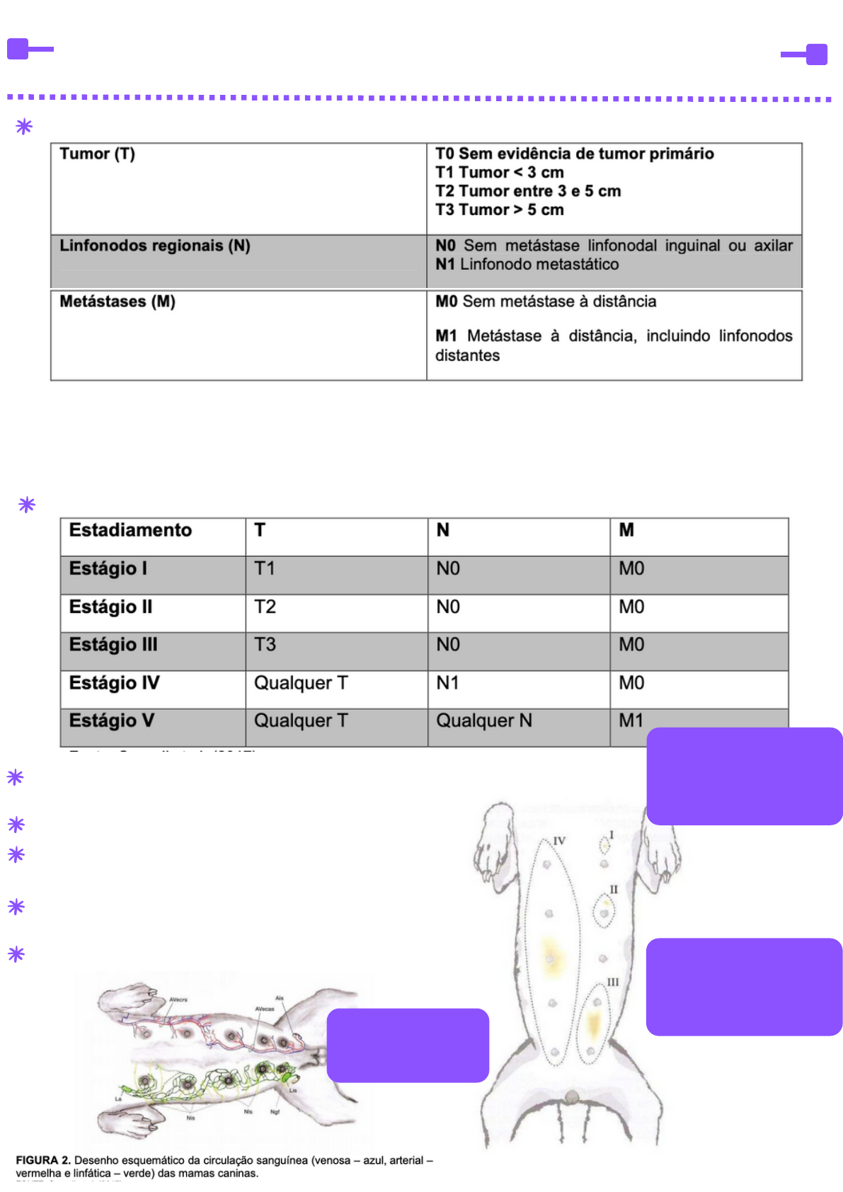 Classificação TNM e Estadiamento de tumor mamário As mamas 1 e 2 drenam para o linfonodo axilar, e as mamas 3, 4 e 5 drenam para o linfonodo inguinal. As vezes, a 3 drena para o axilar também. Se tem um tumor na 4, e ela drena para o inguinal, tem que pensar na cadeia tem a 4, 5 e o linfonodo. Se na palpação, o linfonodo tiver reativo, bem provável a 5 também está acometido. Lumpectomia/nodulectomia: retirada de só um tumor de até 1cm (I) TNM ESTADIAMENTO Mastectomia simples: retira só a mama afetada (II) Mastectomia regional: mais de um tumor de até 1cm ou 1 grande em só uma mama, (2-3 mamas) (III) Sarcoma tem dispersão sanguínea Carcinoma tem dispersão linfática Mastectomia unilateral: retirada de toda a cadeia mamária (IV), tumor grande Mastectomia geral/total: retira ambas as cadeias As mamas são irrigadas pela artéria axilar, artéria epigástrica cranial e artéria epigástrica caudal O sistema linfático é o principal dispersor de metástase