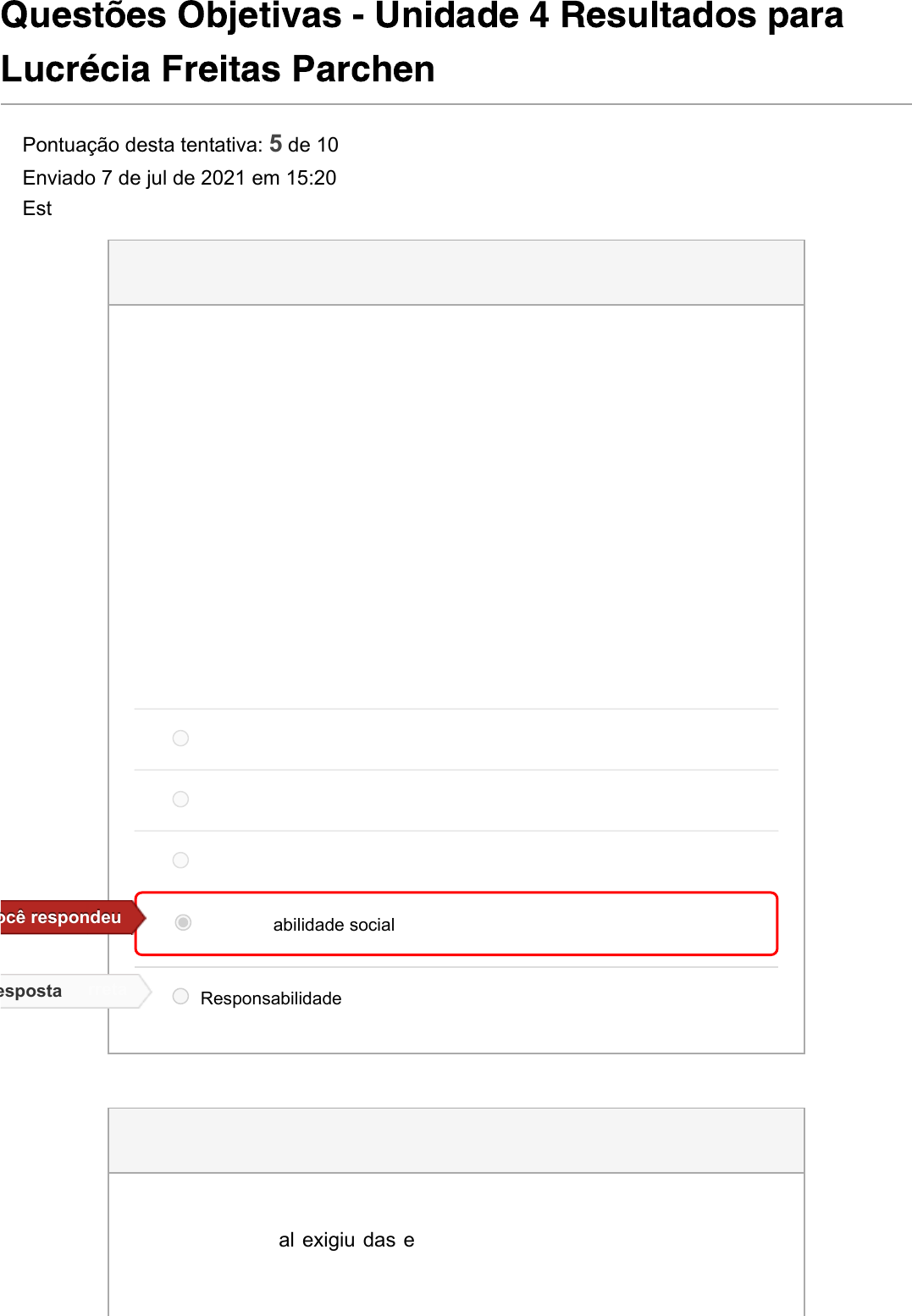 Questões Objetivas - Unidade 4 Resultados para Lucrécia Freitas Parchen Pontuação desta tentativa: 5 de 10 Enviado 7 de jul de 2021 em 15:20 Esta tentativa levou 47 minutos. 0 / 1,25 ptsPergunta 1 Na atualidade, as empresas são cobradas por posturas mais efetivas frente à realidade social e a crise ambiental. Não basta oferecer um bom produto ou seguir as leis, há que se apresentar como uma instituição que valoriza aspectos sociais e culturais. Leia atentamente o texto a seguir para responder à questão: É quando empresas, de forma voluntária, adotam posturas, comportamentos e ações que promovam o bem-estar dos seus públicos interno e externo e respeitem o meio ambiente. O texto se refere a: Sustentabilidade Filantropia Responsabilidade cultural Responsabilidade social ocê respondeuocê respondeu Responsabilidade socioambiental esposta corretaesposta correta 1,25 / 1,25 ptsPergunta 2 A crise ambiental exigiu das empresas uma nova postura em relação ao processo administrativo e produtivo, principalmente em relação aos impactos ambientais. Leia o texto a seguir para responder à questão: É o desenvolvimento capaz de suprir as necessidades da geração atual, sem comprometer a capacidade de atender as necessidades das futuras gerações. O conceito apresentado se refere a: Ecodesenvolvimento Desenvolvimento sustentável Correto!Correto! Responsabilidade social Desenvolvimento econômico Responsabilidade socioambiental 1,25 / 1,25 ptsPergunta 3 A sustentabilidade tem por objetivo obter crescimento econômico por meio da preservação do meio ambiente e pelo respeito aos anseios dos diversos agentes sociais, contribuindo assim para a qualidade de vida da sociedade. Considerando esta informação, relacione as colunas: 1. Econômico 2. Social 3. Ambiental. ( ) em sintonia com as demandas e questões sociais. ( ) utilizando, de forma consciente, os recursos disponíveis no meio ambiente. ( ) Empresas e poder público criem estratégias de desenvolvimento econômico. Assinale a sequência correta: 1, 2, 3 2, 3, 1 Correto!Correto! 1, 3, 2 3, 2, 1 2, 1, 3 0 / 1,25 ptsPergunta 4 Quebrar o paradigma do modelo analítico de pensar, que remete a estruturas hierarquizadas e burocráticas, têm sido uma das grandes dificuldades para criação de uma cultura organizacional que propicie um ambiente favorável ao aprendizado e à inovação. A partir do apresentado, analise as asserções a seguir e a relação proposta entre elas. I. A busca de soluções novas pode requerer abandonar experiências antigas Pois II. Tais experiências remetem à segurança e ao comodismo. A seguir, assinale a alternativa correta: As asserções I e II são proposições verdadeiras, mas a II não é uma justificativa correta da I. A asserção I é uma proposição verdadeira e a asserção II é uma proposição falsa. ocê respondeuocê respondeu As asserções I e II são proposições falsas As asserções I e II são proposições verdadeiras, e a II é uma justificativa correta da I. esposta corretaesposta correta A asserção I é uma proposição falsa, e a II é uma proposição verdadeira. 1,25 / 1,25 ptsPergunta 5 A governança corporativa é uma forma de gestão que se define pela relação ética e transparente da empresa com todos os públicos com os quais ela se relaciona. Tal governança apresenta alguns princípios fundamentais, exceto o que se lê em: Prestação de Contas (accountability) Desenvolvimento econômico Correto!Correto! Transparência Responsabilidade Corporativa Equidade 1,25 / 1,25 ptsPergunta 6 Há que se considerar que a evolução da administração está muito ligada aos aspectos históricos do período em que se desenvolveu. Assim, há que se considerar alguns marcos de influência, que determinaram os rumos dos processos administrativos. Na atualidade, quais elementos exercem influência sobre o desenvolvimento da administração? O processo de comunicação A valorização do RH A visão sistêmica O desenvolvimento de tecnologias de produção Era da Informação, da Tecnologia ou da Internet Correto!Correto! 0 / 1,25 ptsPergunta 7 A Teoria Administrativa é um produto típico do século XX. Hoje enfrenta os desafios do século XXI – a turbulência da Era da Informação. Isso exige dos administradores novas abordagens de negócio perante os desafios do século XXI. Em relação à globalização dos negócios, podemos dizer que: I. Estabilidade de capitais, pessoas e ideias, II. Simultaneidade - em todos lugares ao mesmo tempo. III. Desvio – poucas rotas para atingir o cliente. IV. Pluralidade – o centro não pode dominar. É correto que se afirma em: I, II, III e IV II e IV esposta corretaesposta correta I, III e IV II, III e IV I e II ocê respondeuocê respondeu 0 / 1,25 ptsPergunta 8 A globalização trouxe novas formas de negócio, assim como a tecnologia e o desenvolvimento de sistemas que auxiliam as empresas no seu processo administrativo. Na atualidade, existe um elemento central que influenciou da maneira drástica a administração. Qual é esse elemento? Computador Comunicação ocê respondeuocê respondeu Logística Sistemas de informação Internet esposta corretaesposta correta Pontuação do teste: 5 de 10