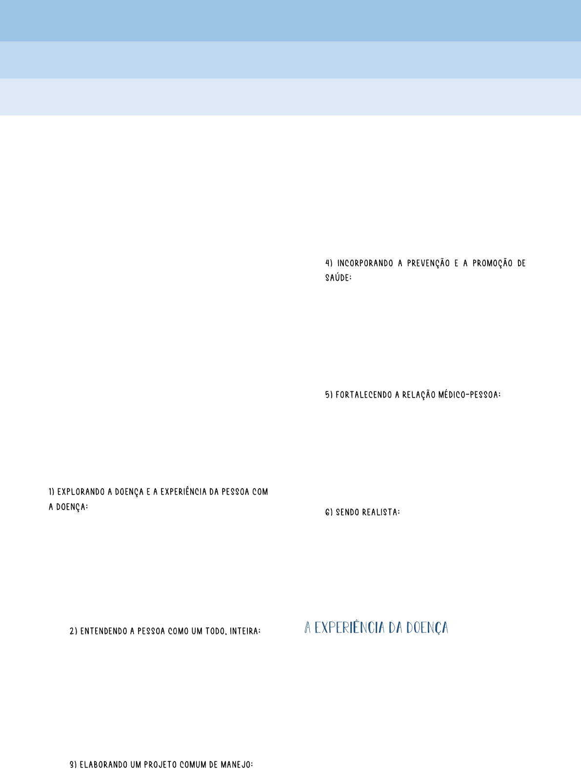 Collab: Milena Brandão Rios & Khilver Doanne Sousa Soares Habilidades de Comunicação e Método Clínico Centrado na Pessoa HAM V Habilidades de Comunicação e Método Clínico Centrado na Pessoa O Método Clínico Centrado na Pessoa (MCCP) surgiu da demanda das pessoas de um atendimento que contemplasse de maneira mais integral suas necessidades, preocupações e vivências relacionadas à saúde ou às doenças. Este método apresenta mais resultados positivos que o tradicional, são eles: Maior satisfação das pessoas e médicos; Melhora da aderência aos tratamentos; Redução de preocupações e ansiedade; Redução de sintomas; Diminuição das queixas por má-prática; Melhora da saúde mental; Melhora na situação fisiológica e na recuperação de problemas recorrentes. O método está estruturado em seis componentes, que são complementares entre si. São eles: • Avaliando a história, exame físico, exames complementares; • Avaliando a dimensão da doença: sentimentos, ideias, efeitos sobre a funcionalidade e expectativas da pessoa. • A pessoa: Sua história de vida, aspectos pessoais e de desenvolvimento; • Contexto próximo: Sua família, comunidade, emprego, suporte social; • Contexto distante: Sua comunidade, cultura, ecossistema. • Avaliando quais os problemas e prioridades; • Estabelecendo os objetivos do tratamento e do manejo; • Avaliando e estabelecendo os papéis da pessoa e do profissional de saúde. • Melhorias de saúde; • Evitando ou reduzindo riscos; • Identificando precocemente os riscos ou doenças; • Reduzindo complicações. • Exercendo a compaixão; • A relação de poder; • A cura (efeito terapêutico da relação); • O autoconhecimento; • A transferência e contra-transferência. • Tempo e timing; • Construindo e trabalhando em equipe; • Usando adequadamente os recursos disponíveis. Para entender melhor a experiência da pessoa em relação à doença, o profissional de saúde deve estar atento a sinais e indicações dadas pelas pessoas durante o atendimento. Deve-se indagar que fatores levaram uma determinada pessoa a buscar atendimento naquele momento específico. As pistas e sinais emitidos pelas pessoas que buscam atendimento, na forma de enunciados ou Collab: Milena Brandão Rios & Khilver Doanne Sousa Soares Collab: Milena Brandão Rios & Khilver Doanne Sousa Soares comportamentos, são importantes porque refletem suas ideias subjacentes, preocupações e experiências. Além de estar atento a essas pistas, propõe-se que os profissionais avaliem quatro dimensões da experiência da doença (lembradas pelo acróstico ): Os sentimentos das pessoas a respeito de seus problemas. Por exemplo, ela teme que os sintomas manifestados possam indicar uma doença mais séria, como um câncer? As suas ideias sobre o que está errado. Embora às vezes a ideia que uma pessoa faz de um sintoma seja bastante objetivo – “será que essa cólica é uma pedra no rim? ”, às vezes outros encaram problemas de saúde como punições, ou até como uma oportunidade, de forma muitas vezes inconsciente, de se tornar dependente e ser cuidado. Os efeitos da doença no funcionamento da pessoa: Haverá limitações nas atividades diárias? Será necessário ficar afastado do trabalho? Prejudica a qualidade de vida? Quais são as expectativas da pessoa. O que espera do médico? A dor de garganta deve ser tratada com antibióticos? Outro método utilizado visando o atendimento centrado na pessoa e humanização é a Tríade de Carls Rogers, ou Tríade Rogeriana. Empatia: colocar-se no lugar do outro, pela perspectiva do outro; Congruência: harmonia na relação médico-paciente. Aceitação incondicional: aceitar o paciente como ele é. Comunicando más notícias A comunicação entre o médico e o paciente pode influenciar a adesão ao tratamento e a satisfação com o atendimento realizado. Além disso, o médico não tem sempre notícias boas. Quando há o avanço da doença ou se desde o início ela se apresenta como ameaçadora da continuidade da vida, algo que afeta negativamente o futuro, o médico não só deve comunicar isso ao paciente e sua família, mas comunicar uma má notícia. A vivência dessa comunicação é vista como uma situação limite para o médico que, muitas vezes, sem saber lidar com o sofrimento emocional do paciente, pode fazer promessas falsas de cura, a mentira piedosa, ou uma transmissão abrupta e sem muitas explicações ou perspectivas de futuro, prejudicando toda a relação terapêutica. A comunicação deve não apenas abarcar o que o paciente precisa saber, mas ser realizada de forma apropriada, assegurando que ele compreendeu a informação, preocupando-se com sua reação afetiva e com a retenção da informação. – Setting up: Preparando-se para o encontro. Treinar antes é uma boa estratégia. Apesar de a notícia ser triste, é importante manter a calma, pois as informações dadas podem ajudar o paciente a planejar seu futuro. Procure por um lugar calmo e que permita que a conversa seja particular. Mantenha um acompanhante com seu paciente, isso costuma deixá-lo mais seguro. Sente-se e procure não ter objetos entre você e seu paciente. Escute atentamente o que o paciente diz e mostre atenção e carinho. – Perception: Percebendo o paciente. Collab: Milena Brandão Rios & Khilver Doanne Sousa Soares Investigue o que o paciente já sabe do que está acontecendo. Procure usar perguntas abertas. – Invitation: Convidando para o diálogo. Identifique até onde o paciente quer saber do que está acontecendo, se quer ser totalmente informado ou se prefere que um familiar tome as decisões por ele. Se o paciente deixar claro que não quer saber detalhes, mantenha-se disponível para conversar no momento que ele quiser. – Knowledge: Transmitindo as informações. Introduções como “infelizmente não trago boas notícias” podem ser um bom começo. Use sempre palavras adequada
