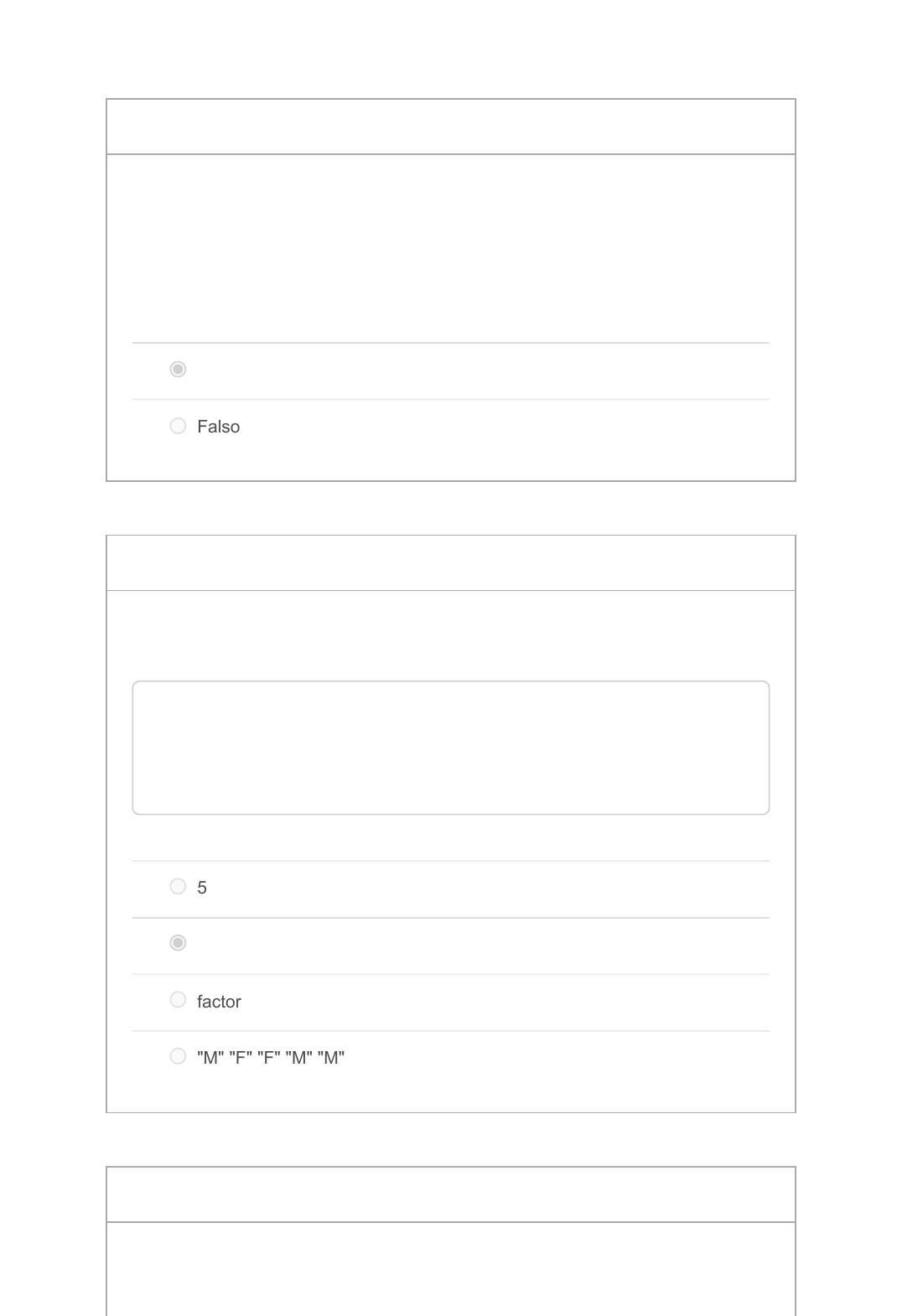 Pontuação desta tentativa: 10 de 10 Enviado 27 de set de 2021 em 23:29 Esta tentativa levou Menos de 1 minuto. 2 / 2 ptsPergunta 1 É possível transformar uma variável quantitativa em uma variável qualitativa se definirmos classes para os valores númericos. Por exemplo, transformar a variável idade em uma variável chamada faixa etária, composta das classes: criança, adolescente, adulto, idoso. Verdadeiro Falso 2 / 2 ptsPergunta 2 Observe a construção do seguinte fator: vetor = c("M" ,"F", "F", "M", "M") vetor fator_vetor = factor(vetor) O seguinte comando produz qual saída? levels(fator_vetor) 5 "F" "M" factor "M" "F" "F" "M" "M" 2 / 2 ptsPergunta 3 Qual o escopo da variável resultado? dados = function( ){ resultado = sample(1:6, size=1) resultado } Global Geral Interno Local 2 / 2 ptsPergunta 4 Fatores ordenados são usados para variáveis qualitativas ordinais, como escolaridade, por exemplo. Falso Verdadeiro 2 / 2 ptsPergunta 5 Sobre funções em linguagem R: É uma forma de evitar repetição de código através da criação de uma rotina com uso de parâmetros Só pode ser utilizada uma vez em seu código O R não possui nenhuma função built-in, todas devem ser construídas pelo programador Seu propósito é diferente de outras linguagens de programação, e é utilizada para evitar repetição de código Pontuação do teste: 10 de 10