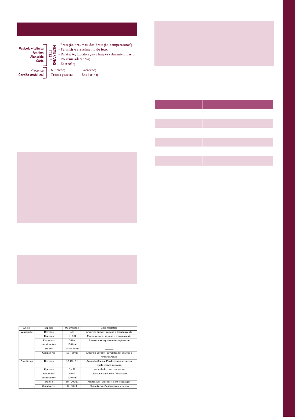 ANEXOS EMBRIONÁRIOS ANEXOS EMBRIONÁRIOS: são estruturas que derivam do zigoto, mas que pouco ou nada contribuem para a formação do embrião; são estruturas geralmente transitórias; MAMÍFEROS DOMÉSTICOS: há a regressão da vesícula vitelina, expansão do alantóide e áreas de aderência: Alantóide + Cório = membrana corioalantoideana (alantocório); alantóide colaba com o córion, contribuindo para a formação da placenta (placenta corioalantóidea); Cório + Âmnio = membrana corioamniótica (amniocório); Alantóide + Âmnio = alantoâmnio; Ruminantes e suínos: placenta alantocório e amniocório Equinos e carnívoros: placenta alantocório ALANTOIDE: formado pela evaginação da parede do saco vitelino; constituído por endoderme e mesoderme; Em equinos e carnívoros é tubular (adere totalmente ao âmnion); e em ruminantes e suínos é alongado (adere parcialmente ao âmnion) Líquido amniótico: fluido extracelular advindos do trato respiratório, saliva e pele; Líquido alantoideano: fluido extracelular advindos da urina; Hipomanes (equinos) e boomanes (bovinos; raro): também chamado de “cálculo alantóide”; encontrado dentro da placenta e durante a gestação fica flutuando no líquido alantóide; é formado por debris celulares, minerais e mucina; não tem significado clínico; CORDÃO UMBILICAL: conexão do feto com a placenta; constituído de 2 artérias e 1-2 veias umbilicais, e o úraco (ducto alantoideano); ESPÉCIE TAMANHO DO CORDÃO FELINO ⅓ do tamanho do feto BOVINO 30-40 cm CANINO ½ do tamanho do feto EQUINO 50-100 cm SUÍNO 20-25 cm PEQUENO RUMINANTE 20-30 cm