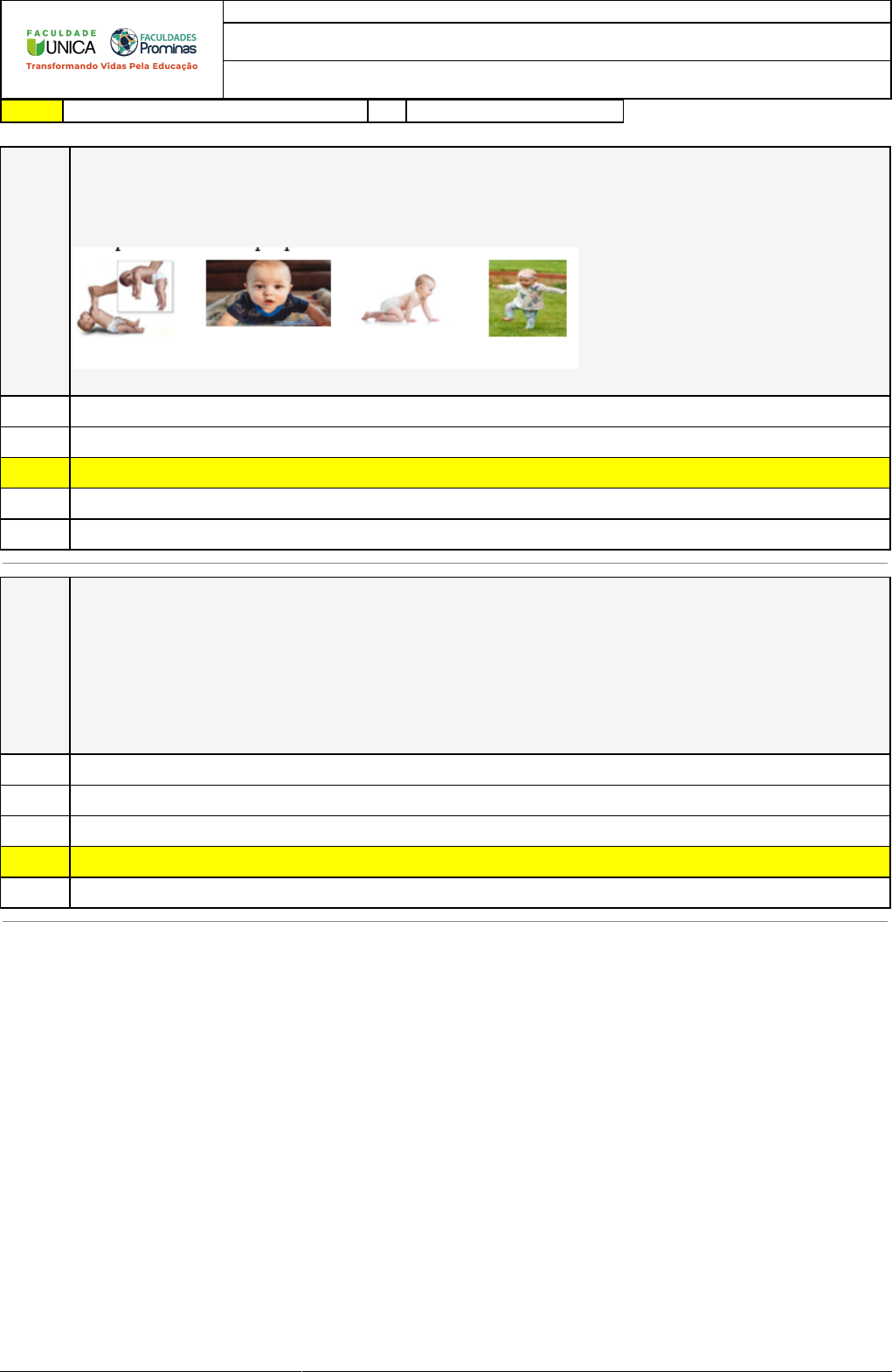 04/09/2022 10:59:36 1/3 REVISÃO DE SIMULADO Nome: PALOMA LUIZA SALES SILVA Disciplina: Psicomotricidade e Desenvolvimento Respostas corretas são marcadas em amarelo X Respostas marcardas por você. Questão 001 O controle postural ocorre como uma sequência, é percebido no seu início quando o bebê mantém suas mãos fechadas, desenvolvendo-se para outros estágios, passando do engatinhar para a postura ortostática. Essa dinâmica é conhecida por Thompson (2020) como ______. Marque a alternativa que preenche corretamente a lacuna. X A) Habilidade motora. B) Coordenação postural. C) Flutuação de tônus. D) Controle motor. E) Controle postural. Questão 002 O professor ao dar sequência a um programa de exercícios, solicita que seus alunos entre 4 e 8 anos, realizem a posição de vela, explicando que devem se deitar sobre o colchonete em decúbito dorsal e elevar suas membro inferiores para cima, também, o glúteo e parte do tronco, sustentando a posição com a ajudadas mãos apoiadas nas costas. Solicita que mantenham a posição por 10 segundos. Este exercício busca privilegiar quais aspectos motores? Marque a alterativa correta. X A) Coordenação motora global e coordenação motora fina. B) Estrutura espaço temporal e equilíbrio. C) Esquema corporal e coordenação motora global. D) Equilíbrio e tonicidade. E) Esquema corporal e lateralidade. 04/09/2022 10:59:36 2/3 Questão 003 Luria apresenta o mapeamento do cérebro, dividindo-o em três unidades funcionais, onde são relacionadas diretamente aos aspectos psicomotores, onde a primeira relaciona-se à condição de vigilância, de alerta e dos estados mentais; a segunda compromete-se com a recepção, análise e armazenamento da informação; a terceira relaciona-se com a organização da atividade consciente e a sua programação, regulação e verificação da atividade psicomotora, (FONSECA, 2012). Dadas as unidades funcionais de Luria, marque a opção que corresponde corretamente as colunas: Coluna 1 (1) Primeira (2) Segunda (3) Terceira Coluna 2 ( ) Esquema corporal. ( ) Tonicidade. ( ) Coordenação motora. ( ) Lateralidade. ( ) Equilíbrio. A) 2, 1, 3, 2, 2. X B) 2, 1, 3, 2,1 . C) 2, 1, 3, 2, 2. D) 3, 1, 2, 2, 1. E) 1, 3, 2, 2, 1. Questão 004 (Especialista em Psicomotricidade - CFP/ QUADRIX, adaptado) Com base nos estudos focados na educação pelo movimento, julgue os itens subsequentes. I. O esquema corporal pode ser considerado como uma intuição de conjunto ou de um conhecimento imediato que se tem do próprio corpo, em posição estática ou em movimento, na relação de suas diferentes partes entre si, sobretudo nas relações com o espaço e os objetos que o circundam. II. O esquema corporal acontece de após a criança atingir 3 anos de idade. III. O esquema corporal mal estruturado produz um deficit na relação sujeito-mundo exterior, traduzindo-se no plano da motricidade e da relação com outrem. Assinale a alternativa correta. A) Apenas os itens II e III estão certos. X B) Apenas o item I está certo. C) Apenas os itens I e III estão certos. D) Apenas os itens I e II estão certos. E) Apenas o item III está certo. Questão 005 (Professor de educação física – SEAD/SEECT-PA/AOCP) As mais variadas formas de ___________ que a criança puder realizar com os conteúdos da Educação Física favorecem em sua construção _______________, por ela tratar seu corpo como um organismo inteiro. Para isso, o conhecimento, que é formado na criança, deve ser um conhecimento de corpo e de ações ao corpo, em que os próprios movimentos possam ser vivenciados mais __________. Preencha as lacunas e assinale a alternativa correta. A) movimento / educativa / livremente. B) processo / normativa / elaboradamente. X C) elementos / normativa / repetidamente. 04/09/2022 10:59:36 3/3 D) movimentos / corretiva / livremente . E) segmentos / corretiva / ordenadamente. Questão 006 (Especialista em Psicomotricidade - CFP/ QUADRIX, adaptado) A BPM de Fonseca é um instrumento que favorece a avaliação psicomotora e pode fazer parte dos processos realizados pelos psicólogos. ( ) A BPM deve ser usada para diagnosticar déficits neurológicos para diagnosticar disfunções ou lesões cerebrais. ( ) A BPM tem uma utilidade educacional por diversos profissionais, tais como educadores físicos. ( ) A BPM requer afinamentos, mas dá um suporte clínico como modelo original de observação dinâmica do potencial de aprendizagem da criança. Assinale a alternativa correta. A) F – F – V . X B) F - V – F . C) V - V – V . D) F – V – V . E) V – V – F. Questão 007 O professor ao solicitar que um grupo de crianças de idade entre 3 e 6 anos montem um jogo de quebra-cabeça com a imagem do corpo humano, busca desenvolver a noção de corpo inteiro e suas partes. Neste sentido, qual aspecto motor é privilegiado? Marque a alterativa correta. A) Esquema corporal. X B) Lateralidade. C) Estruturação espaço temporal. D) Coordenação motora fina. E) Equilíbrio. Questão 008 (Professor de Educação Física, Prefeitura Municipal de Ji-Paraná, RO/IBADE, 2018, adaptado). A psicomotricidade pode ser entendida como a função do ser humano que sintetiza psiquismo e motricidade, com o propósito de permitir ao indivíduo adaptar-se de maneira flexível e harmoniosa ao meio que o cerca. Dentre as estruturas psicomotoras, aquela que se preocupa com o saber pré-consciente a respeito do seu próprio corpo e de suas partes, permitindo que o sujeito se relacione com espaços, objetos e pessoas que o circundam, é denominada _____. Marque a alternativa que preenche a lacuna. A) Esquema corporal. X B) Lateralidade. C) Coordenação motora fina. D) Organização espaço-temporal. E) Imagem corporal.