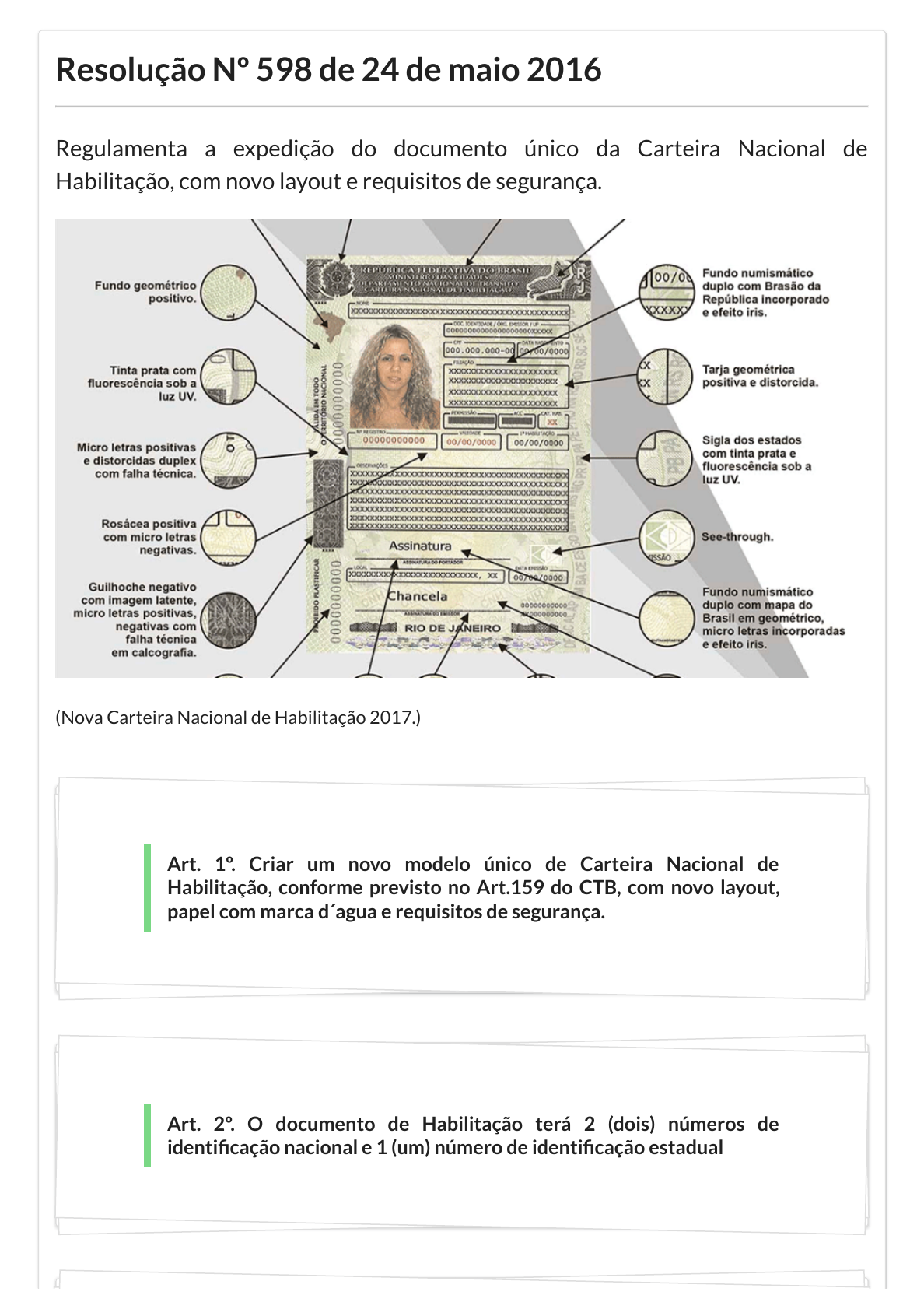 Resolução Nº 598 de 24 de maio 2016 Regulamenta a expedição do documento único da Carteira Nacional de Habilitação, com novo layout e requisitos de segurança. (Nova Carteira Nacional de Habilitação 2017.) Art. 1º. Criar um novo modelo único de Carteira Nacional de Habilitação, conforme previsto no Art.159 do CTB, com novo layout, papel com marca d´agua e requisitos de segurança. Art. 2º. O documento de Habilitação terá 2 (dois) números de identi�cação nacional e 1 (um) número de identi�cação estadual Art. 3º. A inscrição "Permissão", prevista no modelo da CNH, impressa em caixa alta e com fonte maior ao lado do número tipográ�co, na frente do documento, passa a ser impressa em caixeta especí�ca que deverá ser preenchida com a palavra "Permissão", usando as mesmas fontes dos demais campos na cor preta, ou ser hachurada quando se tratar de CNH de�nitiva. Art. 4º. Será acrescentada uma caixeta "ACC" que deverá ser impressa com a informação "ACC" usando as mesmas fontes dos demais campos, na cor preta ou deverá ser hachurada, quando não houver esta autorização de habilitação, sendo a "ACC" e a Categoria "A" excludente, não existindo simultaneamente para um mesmo condutor. Art. 5º. A "Permissão" para a "ACC" poderá ser simultânea com a permissão da Categoria "B", com validade de um ano. Art 7º. Dentro do campo Observações, deverão constar as restrições médicas, a informação "exerce atividade remunerada" e os cursos especializados que tenham certi�cado, todos em formatos padronizados e abreviados, conforme Anexo II desta Resolução. Art. 8°. A expedição da Carteira Nacional de Habilitação, modelo único, dar-se compulsoriamente quando: Modelo de Carteira Nacional de Habilitação, de autorização para conduzir ciclomotores e permissão para dirigir I - da obtenção da Permissão para Dirigir na "ACC" e nas categorias "A", "B" ou "A" e "B", pelo período de 1(um) ano; II - da troca da Permissão para Dirigir pela CNH De�nitiva, na "ACC" ou nas Categorias "A", " B", ou "A" e "B", ao término de um ano da permissão, desde que atendido ao disposto no §3º do Art. 148 do CTB; III - da adição e da mudança de categoria; IV - da perda, dano ou extravio; V - da renovação dos exames para a CNH; VI - houver a reabilitação do condutor; VII - ocorrer alteração de dados do condutor; VIII - da substituição do documento de habilitação estrangeira.
