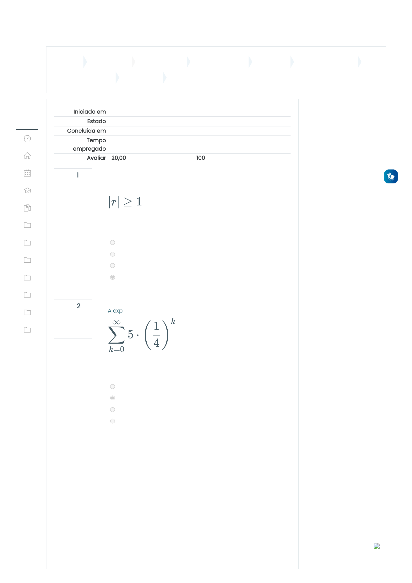 15/09/2022 13:00 QUESTIONÁRIO 2 https://ava.funec.br/mod/quiz/review.php?attempt=328592&cmid=12044 1/4 Painel Meus cursos CURSOS FUNEC Graduação - EAD Aluno EAD JUNÇÕES DE TURMA Cálculo Numérico AVALIAÇÕES QUESTIONÁRIO 2 Questão 1 Completo Atingiu 2,00 de 2,00 Questão 2 Completo Atingiu 2,00 de 2,00 Iniciado em Thursday, 15 Sep 2022, 12:54 Estado Finalizada Concluída em Thursday, 15 Sep 2022, 13:00 Tempo empregado 5 minutos 10 segundos Avaliar 20,00 de um máximo de 20,00(100%) No estudo das Séries, o modulo da razão abaixo for maior ou igual a 1, significa que: Escolha uma opção: a. Nenhuma das Alternativas acima b. Se o módulo de razão for menor ou igual a 1 ela converge c. Se o módulo de razão for maior ou igual a 1 ela converge d. Se o módulo de razão for maior ou igual a 1 ela diverge |r| ≥ 1 A expressão abaixo, converge ou diverge: Escolha uma opção: a. Diverge b. Converge c. Indiferente d. Não se aplica 5 ⋅∑ k=0 ∞ ( )1 4 k https://ava.funec.br/my/ https://ava.funec.br/course/index.php?categoryid=10 https://ava.funec.br/course/index.php?categoryid=17 https://ava.funec.br/course/index.php?categoryid=19 https://ava.funec.br/course/index.php?categoryid=77 https://ava.funec.br/course/view.php?id=896 https://ava.funec.br/course/view.php?id=896#section-6 https://ava.funec.br/mod/quiz/view.php?id=12044 javascript:void(0); https://ava.funec.br/user/index.php?id=896 https://ava.funec.br/badges/view.php?type=2&id=896 https://ava.funec.br/admin/tool/lp/coursecompetencies.php?courseid=896 https://ava.funec.br/grade/report/index.php?id=896 https://ava.funec.br/my/ https://ava.funec.br/?redirect=0 https://ava.funec.br/calendar/view.php?view=month&course=896 javascript:void(0); https://ava.funec.br/user/files.php https://ava.funec.br/course/view.php?id=324 https://ava.funec.br/course/view.php?id=757 https://ava.funec.br/course/view.php?id=342 https://ava.funec.br/course/view.php?id=624 https://ava.funec.br/course/view.php?id=819 https://ava.funec.br/course/view.php?id=896 https://ava.funec.br/course/view.php?id=488 https://ava.funec.br/course/view.php?id=698 https://ava.funec.br/course/view.php?id=492 https://ava.funec.br/course/view.php?id=485 https://ava.funec.br/my/ 15/09/2022 13:00 QUESTIONÁRIO 2 https://ava.funec.br/mod/quiz/review.php?attempt=328592&cmid=12044 2/4 Questão 3 Completo Atingiu 2,00 de 2,00 Questão 4 Completo Atingiu 2,00 de 2,00 Questão 5 Completo Atingiu 2,00 de 2,00 Questão 6 Completo Atingiu 2,00 de 2,00 A expressão abaixo, converge ou diverge: Escolha uma opção: a. Diverge b. Converge e Diverge c. Converge d. Indiferente ∑ k=2 +∞ 23k−1 9k A expressão abaixo, converge ou diverge: Escolha uma opção: a. Não se aplica b. Converge c. Diverge d. Indiferente 4 ⋅∑ k=0 ∞ ( )1 4 k Qual é a definição representada abaixo: Escolha uma opção: a. Soma Infinita b. Termo c. Razão d. Elemento Uk∑ k=1 ∞ Qual é o U1, que é expressado abaixo: Escolha uma opção: a. 2 b. 1 c. ½ d. 0 1 ⋅∑ k=0 +∞ ( )1 2 k javascript:void(0); https://ava.funec.br/user/index.php?id=896 https://ava.funec.br/badges/view.php?type=2&id=896 https://ava.funec.br/admin/tool/lp/coursecompetencies.php?courseid=896 https://ava.funec.br/grade/report/index.php?id=896 https://ava.funec.br/my/ https://ava.funec.br/?redirect=0 https://ava.funec.br/calendar/view.php?view=month&course=896 javascript:void(0); https://ava.funec.br/user/files.php https://ava.funec.br/course/view.php?id=324 https://ava.funec.br/course/view.php?id=757 https://ava.funec.br/course/view.php?id=342 https://ava.funec.br/course/view.php?id=624 https://ava.funec.br/course/view.php?id=819 https://ava.funec.br/course/view.php?id=896 https://ava.funec.br/course/view.php?id=488 https://ava.funec.br/course/view.php?id=698 https://ava.funec.br/course/view.php?id=492 https://ava.funec.br/course/view.php?id=485 https://ava.funec.br/my/ 15/09/2022 13:00 QUESTIONÁRIO 2 https://ava.funec.br/mod/quiz/review.php?attempt=328592&cmid=12044 3/4 Questão 7 Completo Atingiu 2,00 de 2,00 Questão 8 Completo Atingiu 2,00 de 2,00 Questão 9 Completo Atingiu 2,00 de 2,00 No estudo das Séries, o modulo da razão abaixo for menor do que 1, significa que: Escolha uma opção: a. Se o módulo da razão gerar um valor maior do que 1 ela converge b. Se o módulo da razão gerar um valor maior do que 1 ela converge c. Se o módulo da razão gerar um valor menor do que 1 ela diverge d. Se o módulo da razão gerar um valor menor do que 1 ela converge |r| < 1 Abaixo temos a soma parcial, e como ela pode ser reescrita, ficando: Escolha uma opção: a. b. c. d. =Sn ( − 1)a1 q n q − 1 =Sn (1º termo) ⋅ (razã − 1)on (razão) =Sn (1º termo) ⋅ (razão − 1) (razão − 1) =Sn (1º termo) ⋅ (razã − 1)on (razão − 1) =Sn (2º termo) ⋅ (razã − 1)on (razão − 1) Se temos a expressão abaixo, qual é o valor do U3: Escolha uma opção: a. 18 b. 46 c. 16 d. 14 2 ⋅ (2∑ k=1 ∞ )k javascript:void(0); https://ava.funec.br/user/index.php?id=896 https://ava.funec.br/badges/view.php?type=2&id=896 https://ava.funec.br/admin/tool/lp/coursecompetencies.php?courseid=896 https://ava.funec.br/grade/report/index.php?id=896 https://ava.funec.br/my/ https://ava.funec.br/?redirect=0 https://ava.funec.br/calendar/view.php?view=month&course=896 javascript:void(0); https://ava.funec.br/user/files.php https://ava.funec.br/course/view.php?id=324 https://ava.funec.br/course/view.php?id=757 https://ava.funec.br/course/view.php?id=342 https://ava.funec.br/course/view.php?id=624 https://ava.funec.br/course/view.php?id=819 https://ava.funec.br/course/view.php?id=896 https://ava.funec.br/course/view.php?id=488 https://ava.funec.br/course/view.php?id=698 https://ava.funec.br/course/view.php?id=492 https://ava.funec.br/course/view.php?id=485 https://ava.funec.br/my/ 15/09/2022 13:00 QUESTIONÁRIO 2 https://ava.funec.br/mod/quiz/review.php?attempt=328592&cmid=12044 4/4 Questão 10 Completo Atingiu 2,00 de 2,00 Temos a seq