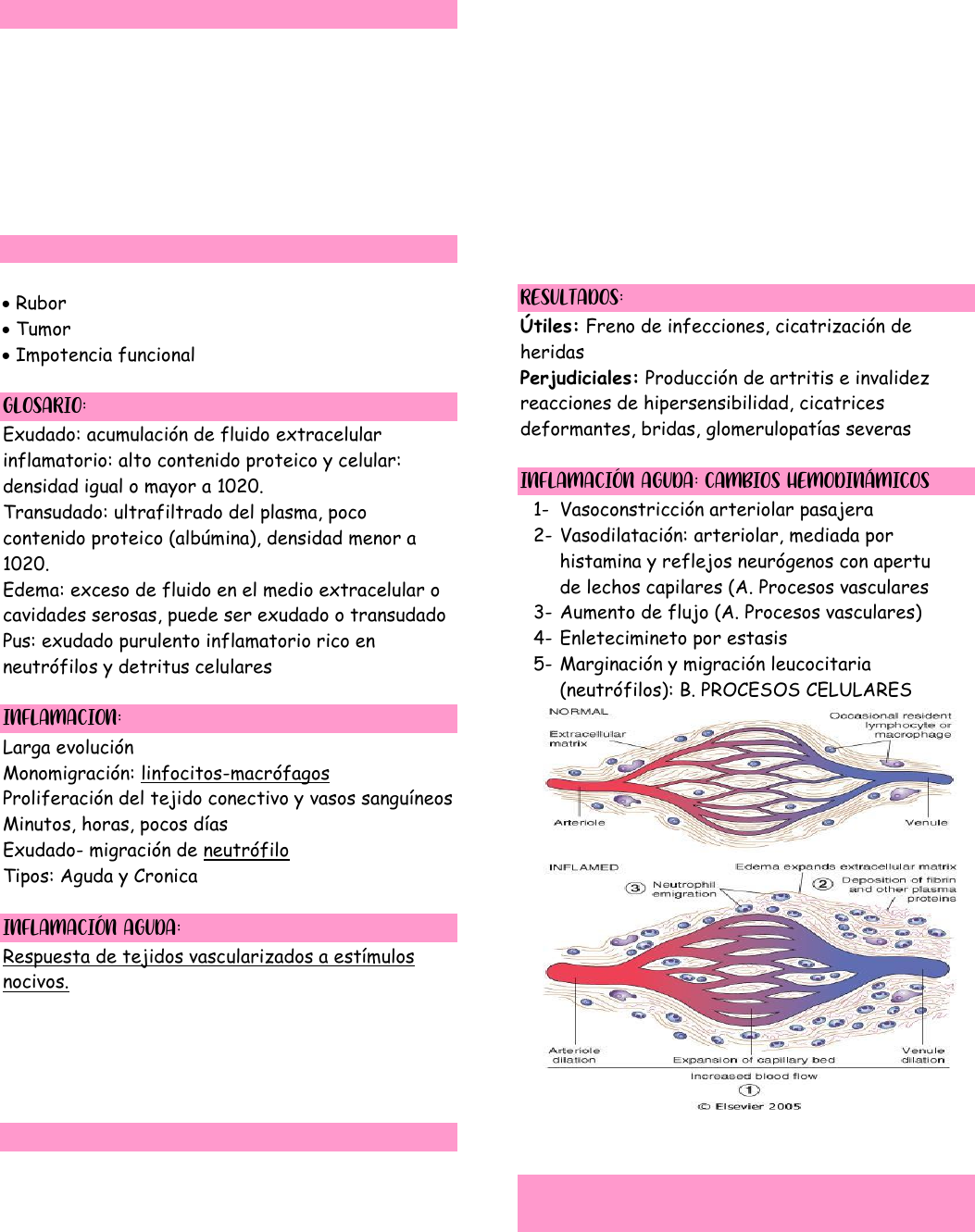 Anatomia Patológica INFLAMACÍON AGUDA: CONCEPTO: La inflamación es una respuesta protectora Participan las células del huésped, los vasos sanguíneos, y las proteínas y otros mediadores tratan de eliminar la causa inicial de la lesión celular, además de las células y los tejidos necróticos causados por la agresión inicial, e iniciar el proceso de reparación SIGNOS TIPICOS: • Calor • Rubor • Tumor • Impotencia funcional GLOSARIO: Exudado: acumulación de fluido extracelular inflamatorio: alto contenido proteico y celular: densidad igual o mayor a 1020. Transudado: ultrafiltrado del plasma, poco contenido proteico (albúmina), densidad menor a 1020. Edema: exceso de fluido en el medio extracelular o cavidades serosas, puede ser exudado o transudado Pus: exudado purulento inflamatorio rico en neutrófilos y detritus celulares INFLAMACION: Larga evolución Monomigración: linfocitos-macrófagos Proliferación del tejido conectivo y vasos sanguíneos Minutos, horas, pocos días Exudado- migración de neutrófilo Tipos: Aguda y Cronica INFLAMACIÓN AGUDA: Respuesta de tejidos vascularizados a estímulos nocivos. • Infecciones y toxinas bacterianas • Trauma • Agentes físicos y químicos • Necrosis tisular • Cuerpos extraños • Reacciones inmunes • Componentes de la respuesta inflamatoria ▪ Alteración del calibre vascular que producen incremento del flujo sanguíneo o Cambios estructurales de la microvasculatura que producen aumento de la permeabilidad capilar o Emigración de leucocitos que conlleva a su acumulación en el tejido inflamado y posterior activación RESULTADOS: Útiles: Freno de infecciones, cicatrización de heridas Perjudiciales: Producción de artritis e invalidez, reacciones de hipersensibilidad, cicatrices deformantes, bridas, glomerulopatías severas INFLAMACIÓN AGUDA: CAMBIOS HEMODINÁMICOS 1- Vasoconstricción arteriolar pasajera 2- Vasodilatación: arteriolar, mediada por histamina y reflejos neurógenos con apertura de lechos capilares (A. Procesos vasculares) 3- Aumento de flujo (A. Procesos vasculares) 4- Enletecimineto por estasis 5- Marginación y migración leucocitaria (neutrófilos): B. PROCESOS CELULARES INFLAMACIÓN AGUDA: Mayor permeabilidad Causas: • histamina, serotonina, etc. • daño directo parietal (quemaduras) • daño directo menor (radiaciones, sol) Consecuencias: • hendiduras por contracción de ▪ células endoteliales ▪ exudación de líquidos y proteínas INFLAMACION AGUDA: MIGRACION CELULAR (NEUTROFILOS) Marginación: Adhesión: Anatomia Patológica Migración: Quimiotaxis: Fagocitosis: Liberación de productos: MOLÉCULAS DE ADHESION Endotelio: P-selectina, E- selectina, L-selectina, I- CAM I, V- CAM I, Gly Cam CD34Leucocito:Sialil – Lewis X,Sialyl- Lewis x,Integrinas, Integrinas, L- selectina QUIMIOTAXIS: Locomoción orientada según un gradiente quimico (neutrófilos +++ y linfocitos +) Factores quimiotácticos son: Solubles en agua y difusibles Péptidos Origen exógeno: producto bacterianos Origen endogeno: C3a, C4a, C4a, C5A; de las hipoxigenasa, de los leucotrienios, citocinas Il-8 ACTIVACION LEUCOCITICA: Una vez que los leucocitos han sido reclutados al foco de infección o necrosis tisular, deben ser activados para que realicen sus funciones. Entre los estímulos para su activación se encuentran microbios, productos de las células necróticas y varios mediadores. FAGOCITOSIS: 1) Reconocimiento y unión de la partícula al leucocito responsable de su ingestión. 2) Engullimiento, con la consiguiente formación de una vacuola fagocítica. 3) y degradación del material ingerido. Destrucción MORFOLOGIA: La inflamación serosa se caracteriza por la extravasación de un líquido acuoso, relativamente pobre en proteínas, que, en función del lugar de la lesión, deriva del plasma o de las secreciones de las células mesoteliales que revisten las cavidades pleural, peritoneal o pericárdica. Las ampollas cutáneas secundarias a una quemadura o una infección vírica son un buen ejemplo de la acumulación de derrame seroso dentro o inmediatamente por debajo de la epidermis de la piel. La inflamación fibrinosa es consecuencia de lesiones más graves, que producen una mayor permeabilidad vascular lo que se traduce en la salida por la barrera endotelial de moléculas más grandes (como el fibrinógeno). Histológicamente, la acumulación extravascular de fibrina aparece como una red eosinófila de hebras y, en ocasiones, como un coágulo amorfo. El exudado fibrinoso es característico de la inflamación en las cubiertas de las cavidades corporales, como las meninges, el pericardio o la pleura. Estos exudados pueden ser degradados mediante fibrinólisis, y los restos acumulados, ser eliminados por los macrófagos, con la consiguiente recuperación de la estructura normal del tejido (resolución). Sin embargo, cuando los exudados ricos en fibrina son extensos puede que no se eliminen por completo y sean sustituidos por una proliferación de fibroblastos y vasos sanguíneos (organización), lo que culmina en una cicatriz que puede tener importantes consecuencias clínicas. La inflamación supurativa (purulenta) y formación de abscesos. Estos procesos se manifiestan por la acumulación de grandes cantidades de exudado purulento (pus) constituido por neutrófilos, células necróticas y líquido de edema. Algunos gérmenes (p. ej., estafilococos) tienen mayor probabilidad de producir una supuración localizada de este tipo y por eso se llaman gérmenes piógenos (formadores de pus). Los abscesos son acumulaciones focales de pus. Los abscesos típicos tienen una región central en su mayor parte necrótica rodeada por una capa de neutrófilos conservados con una zona circundante de vasos dilatados y proliferación de fibroblastos, sugestivos de un intento de reparación. Al pasar el tiempo, el absceso puede quedar totalmente limitado, hasta que, finalmente, es sustituido por tejido conjuntivo. Dado q
