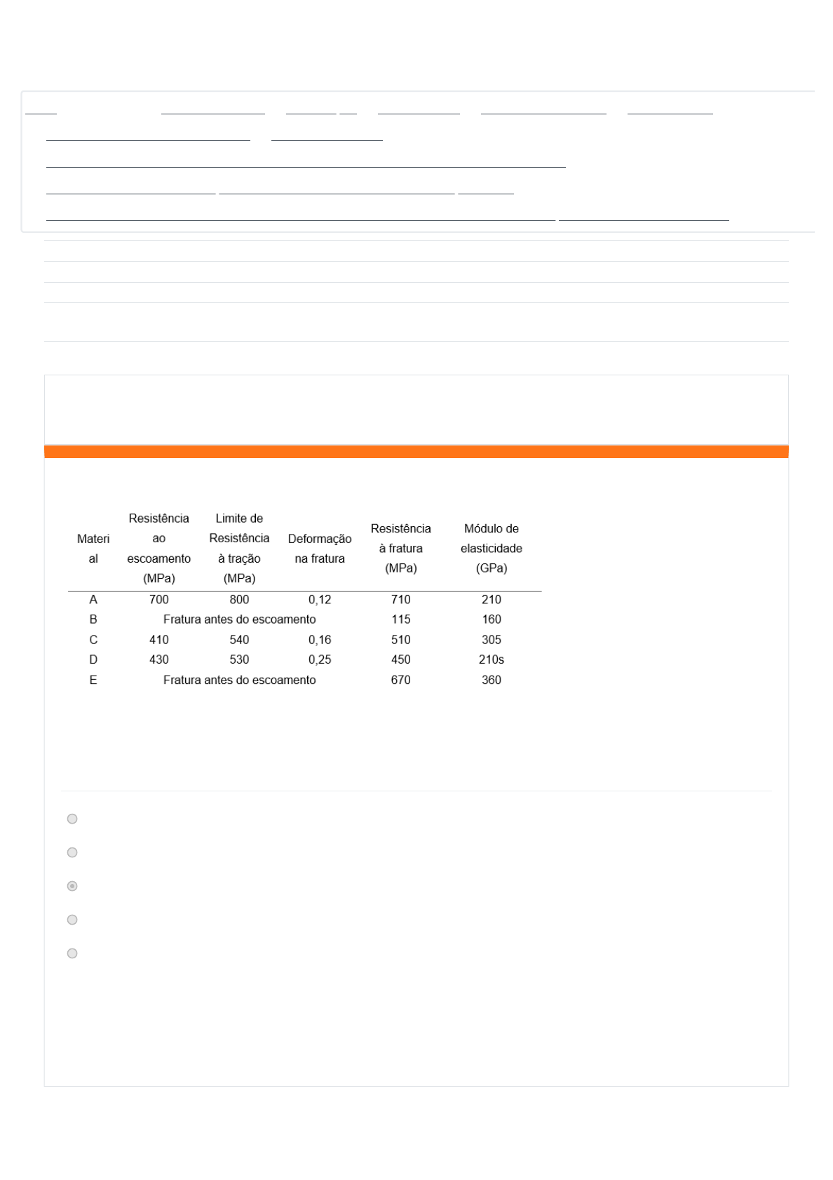 Iniciado em sexta, 16 set 2022, 18:02 Estado Finalizada Concluída em sexta, 16 set 2022, 18:34 Tempo empregado 32 minutos 16 segundos Avaliar 6,00 de um máximo de 6,00(100%) Questão 1 Correto Atingiu 0,60 de 0,60 A tabela a seguir apresenta algumas características mecânicas de cinco materiais. Com base nos dados da tabela, assinale a alternativa correta que indica o material com maior valor de rigidez: a. O material A. b. O material B. c. O material E. d. O material C. e. O material D. Sua resposta está correta. A resposta correta é: O material E. Painel / Meus cursos / ANO LETIVO - 2022 / GRADUAÇÃO / BACHARELADO / ENGENHARIA ELÉTRICA / CICLO 01 - 2022 / MÓDULO 07 - ENGENHARIA ELÉTRICA / TURMA 01 - 2022/07 / BACHARELADO EM ENGENHARIA ELÉTRICA EAD-disc. 4- CIÊNCIA E TECNOLOGIA DOS MATERIAIS / PROVA CURRICULAR - REALIZAÇÃO DIA 16/09/2022 A 18/09/2022 - VALOR 6,0 PONTOS / CLIQUE AQUI PARA REALIZAR A PROVA CURRICULAR - DIA 16/09/2022 A 18/09/2022 - VALOR 6,0 PONTOS - 1ª OPORTUNIDADE https://www.eadunifatecie.com.br/course/view.php?id=10331 https://www.eadunifatecie.com.br/my/ https://www.eadunifatecie.com.br/course/index.php?categoryid=3085 https://www.eadunifatecie.com.br/course/index.php?categoryid=3086 https://www.eadunifatecie.com.br/course/index.php?categoryid=3091 https://www.eadunifatecie.com.br/course/index.php?categoryid=3249 https://www.eadunifatecie.com.br/course/index.php?categoryid=3369 https://www.eadunifatecie.com.br/course/index.php?categoryid=4988 https://www.eadunifatecie.com.br/course/index.php?categoryid=4989 https://www.eadunifatecie.com.br/course/view.php?id=10331 https://www.eadunifatecie.com.br/course/view.php?id=10331#section-13 https://www.eadunifatecie.com.br/mod/quiz/view.php?id=304665 Questão 2 Correto Atingiu 0,60 de 0,60 Ao longo da história, diferentes modelos foram propostos para explicar as bases da matéria. Assim, analise as seguintes asserções sobre os modelos atômicos: I – O modelo atômico proposto por Ernest Rutherford (1871 – 1937), apesar de ainda possuir consideráveis deficiências, foi um grande passo no entendimento da estrutura atômica e rompia com a ideia existente para o átomo na época. Porque II – Propunha que o átomo possui duas partes distintas, com cargas opostas, compondo uma estrutura maciça, sendo apelidado de modelo “pudim de passas”’. a. As asserções I e II são proposições verdadeiras e a II é uma justificativa correta da I. b. A asserção I é uma proposição verdadeira, mas a asserção II é falsa. c. As asserções I e II são proposições falsas. d. As asserções I e II são proposições verdadeiras, mas a II é uma justificativa incorreta para I. e. A asserção I é uma proposição falsa, mas a asserção II é verdadeira. Sua resposta está correta. A resposta correta é: A asserção I é uma proposição verdadeira, mas a asserção II é falsa. Questão 3 Correto Atingiu 0,60 de 0,60 Os diagramas de fases contêm, portanto, diferentes informações de considerável importância sobre os fenômenos observados nos materiais como a cristalização, a fundição, a fusão, entre outros. Logo, compreender a forma como se deve interpretar essas informações fornecidas pelo diagrama é de imprescindível importância. Neste sentido, assinale a alternativa que apresenta a definição correta para diagrama de fases. a. Os diagramas de fases consistem em representações, através de gráficos, do comportamento dos materiais em suas diferentes fases. b. Os diagramas de fases são representações, por meio de gráficos, da variação da relação pressão – temperatura para o as fases da água. c. Os diagramas de fases consistem em representações, através de gráficos, dos estados físicos dos materiais. d. Os diagramas de fases são representações simbólicas dos mecanismos de difusão. e. Os diagramas de fases consistem em representações, através de fluxogramas, da distribuição dos elétrons nas diferentes camadas de energia. Sua resposta está correta. A resposta correta é: Os diagramas de fases consistem em representações, através de gráficos, do comportamento dos materiais em suas diferentes fases. Questão 4 Correto Atingiu 0,60 de 0,60 As propriedades dos materiais dizem respeito a forma como estes reagem ou respondem aos diversos tipos de esforços, permitindo desta forma algumas classificações. Sobre esse tópico, assinale verdadeiro ou falso para as afirmações a seguir: (_) Comumente as propriedades são definidas para um material de forma que independam do tamanho da amostra ou da forma como suas dimensões estão distribuídas. (_) Entre as principais categorias de propriedades estão as mecânicas, elétricas, magnéticas, térmicas, ópticas e de deterioração. (_) A evaporação é uma propriedade exclusiva da água. (_) As propriedades relacionadas a deterioração relacionam-se com a forma de reagir dos materiais, do ponto de vista químico. a. V-F-V-F b. V-V-V-F c. V-V-F-V d. F-V-F-V e. F-F-F-V Sua resposta está correta. A resposta correta é: V-V-F-V Questão 5 Correto Atingiu 0,60 de 0,60 Nos materiais presentes na natureza e até mesmo naqueles desenvolvidos e fabricados pelo homem estão presentes, quase sempre, anomalias ou imperfeições em sua estrutura. A esse respeito, analise as seguintes afirmativas. I – As imperfeições presentes nos materiais possuem capacidade de alterar de forma significativa algumas de suas propriedades e, consequentemente, o seu comportamento sob diversas ações. II – Muitas vezes a ocorrência das imperfeições é benéfica para a utilização do material original, a depender da finalidade buscada. III – Atualmente, em muitos processos ocorre a inserção proposital de diferentes substâncias na composição dos materiais, com o intuito de causar imperfeições. a. Todas as alternativas estão incorretas. b. Todas as alternativas estão corretas. c. Apenas I e II estão corretas. d. Apenas II e III 