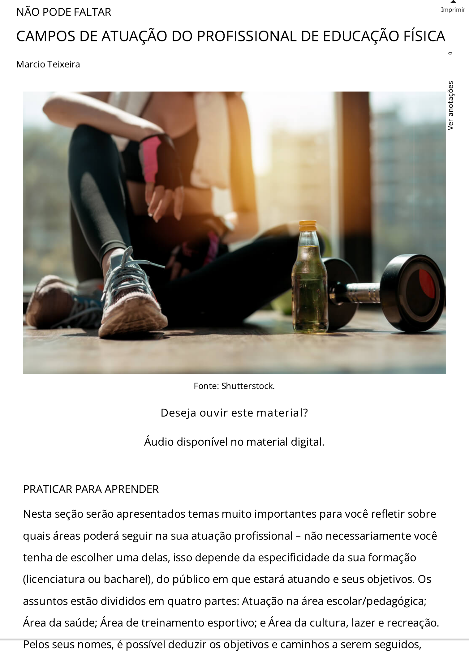 NÃO PODE FALTAR CAMPOS DE ATUAÇÃO DO PROFISSIONAL DE EDUCAÇÃO FÍSICA Marcio Teixeira Imprimir PRATICAR PARA APRENDER Nesta seção serão apresentados temas muito importantes para você re�etir sobre quais áreas poderá seguir na sua atuação pro�ssional – não necessariamente você tenha de escolher uma delas, isso depende da especi�cidade da sua formação (licenciatura ou bacharel), do público em que estará atuando e seus objetivos. Os assuntos estão divididos em quatro partes: Atuação na área escolar/pedagógica; Área da saúde; Área de treinamento esportivo; e Área da cultura, lazer e recreação. Pelos seus nomes, é possível deduzir os objetivos e caminhos a serem seguidos, Fonte: Shutterstock. Deseja ouvir este material? Áudio disponível no material digital. 0 V e r a n o ta çõ e s com variadas intenções. No ambiente escolar, o pro�ssional de educação vai desenvolver suas atividades atreladas a alguns aspectos, como ano de estudo (ensino fundamental e médio), seus objetivos especí�cos, idade (cronológica e biológica, associados às características maturacionais), gênero (masculino e feminino), além de outras particularidades de cada escola e de cada aluno. Nesse contexto, o esporte educação ou educacional é mais indicado, o que não signi�ca que o esporte saúde ou cultural/lazer/recreação não pode ser incorporado. Por outro lado, o esporte rendimento, estruturado no treinamento esportivo, tem por objetivo alcançar altos rendimentos. Ele atenderá um público seletivo, para o qual o desempenho esportivo é o foco principal. Aspectos como idade, gênero e fases do crescimento também devem ser levados em consideração. Nesta seção, procuraremos apresentar e discutir estes quatro temas, para que você, aluno, veri�que com clareza e consiga diferenciar os objetivos, os conteúdos e as metodologias de ensino a ser desenvolvidas. Anderson, docente de uma faculdade de Educação Física, se destaca por ser um profundo conhecedor da área do Treinamento Esportivo. Ele foi procurado por Mário, um colega da mesma instituição, que está desenvolvendo um projeto de preparação física em uma equipe de basquetebol em sua cidade. Mário já tem um conhecimento bem avançado na área, que é um campo de atuação do pro�ssional de Educação Física muito procurado e importante no esporte. Quando os dois se encontraram, Mário expos a Anderson que está preparando a programação da temporada de competição que acontecerá no próximo ano; e, por já estar �nalizando a temporada atual, já quer adiantar algumas etapas do treinamento de sua equipe. Porém, para isso necessita de ajuda do colega para resolver algumas questões relacionadas à área, como quais os melhores meios e métodos de treinamento; como escolher a carga de treinamento, testes motores; e de�nir a periodização do treinamento. Para Anderson ajudar Mário, recorreu aos temas discutidos nesta unidade sobre o campo de atuação pro�ssional, mais especi�camente na área do treinamento esportivo. 0 V e r a n o ta çõ e s Portanto, aluno, espero você �que muito atento sobre o que vamos discutir, pois, além de ampliar seus conhecimentos nessas áreas especi�cas, também surgirão outras possibilidades de atuação pro�ssional. CONCEITO-CHAVE ATUANDO NA ÁREA ESCOLAR/PEDAGÓGICA Para que o pro�ssional de Educação Física possa atuar na área escolar/pedagógica, é necessário que haja em sua formação acadêmica a habilitação da licenciatura ou alguma graduação generalista. Segundo o CONFEF (Conselho Federal de Educação Física), uma das especi�cidades de atuação pro�ssional é a Regência/docência em Educação Física, e suas ações de intervenção são: programar, planejar, Identi�car, organizar, coordenar, dirigir, supervisionar, avaliar, desenvolver e lecionar os conteúdos dos componentes curriculares da disciplina Educação Física, no Ensino Fundamental, na Educação Infantil, Médio e Superior e das atividades de características técnico-pedagógicas (Ensino, Pesquisa e Extensão) na área das disciplinas de formação técnico-pro�ssional no Ensino Superior cujo objetivo é a formação pro�ssional. A atuação desse pro�ssional no ambiente escolar deverá ser construída pelas recomendações da Lei de Diretrizes Básicas (LDB) e dos Parâmetros Curriculares Nacionais (PCNs) do Ministério de Educação, que apontam a divisão escolar entre ensino fundamental e médio, além de apresentar os objetivos de cada fase. As etapas do ensino fundamental se dividem em 1°, 2°, 3°, 4° e 5° ano (fundamental I), normalmente com idades de 6 a 10 anos, na qual o aluno inicia o processo de alfabetização e recebe conteúdos de atividades lúdicas que proporcionam o desenvolvimento motor, cognitivo e social. Espera-se que, no 5º ano, a criança já esteja preparada para dar início a uma nova fase, na qual os campos do conhecimento são ampliados e o aluno passa a ter contato com uma quantidade maior de professores. Os anos �nais do ensino fundamental são divididos em 6°, 7°, 8° e 9° ano (fundamental II), com idades entre 11 e 14 anos. Nesse momento é exigida mais maturidade dos estudantes, e são 0 V e r a n o ta çõ e s apresentados conteúdos mais complexos. Além disso, é uma etapa importante porque representa uma estrutura complexa que será abordada no ensino médio. Já o ensino médio é dividido em 1°, 2° e 3° ano, com estudantes de idades entre 15 e 17 anos. A partir do conhecimento da divisão das etapas da escolaridade dos estudantes, o próximo passo é conhecer os objetivos da Educação Física de cada etapa. EDUCAÇÃO FÍSICA: OBJETIVOS PARA O PRIMEIRO CICLO (FUNDAMENTAL I) Ao �nal do primeiro ciclo, espera-se que os alunos sejam capazes de: • Participar de diferentes atividades corporais buscando adotar uma atitude solidária e cooperativa sem discriminar os colegas pelo desempenho 