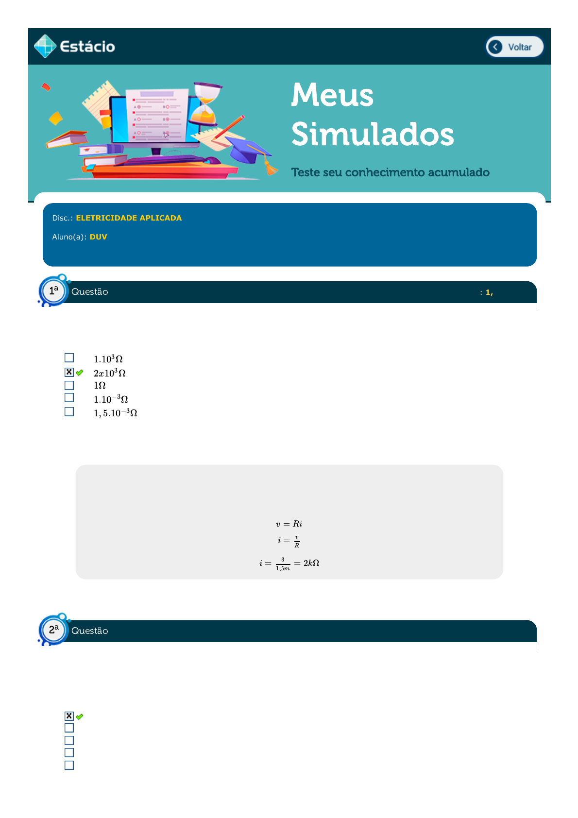 17/09/2022 20:39 Estácio: Alunos https://simulado.estacio.br/alunos/ 1/7 Meus Simulados Teste seu conhecimento acumulado Disc.: ELETRICIDADE APLICADA Aluno(a): DUVAL JOSÉ FERREIRA DE CARVALHO 202208769284 Acertos: 8,0 de 10,0 30/08/2022 Acerto: 1,0 / 1,0 Considere um resistor ôhmico. Este, ao ser atravessado por uma corrente elétrica de 1,5mA, apresenta uma diferença de potencial de 3V. Dentre as alternativas abaixo, assinale aquela que indica o módulo da resistência elétrica desse resistor: Respondido em 30/08/2022 19:40:18 Explicação: Justificativa: Aplicando a Lei de Ohm, temos: Acerto: 1,0 / 1,0 No ano de 2012 foi anunciado que uma empresa forneceria cerca de 230 turbinas para o segundo complexo de energia à base de ventos, localizado no Sudeste da Bahia. O chamado Complexo Eólico Alto Sertão, teria, por sua vez, no ano de 2014, uma capacidade geradora 375MW (megawatts). Esse total é suficiente para abastecer uma cidade de 3 milhões de habitantes. Considerando as informações apresentadas, assinale a opção tecnológica que mais atende às informações: Expansão das fontes renováveis Redução da utilização elétrica Intensificação da dependência geotérmica Ampliação do uso bioenergético Contenção da demanda urbano-industrial Respondido em 30/08/2022 19:40:58 1.103Ω 2x103Ω 1Ω 1.10−3Ω 1, 5.10−3Ω v = Ri i = v R i = = 2kΩ3 1,5m Questão1 a Questão2 a https://simulado.estacio.br/alunos/inicio.asp javascript:voltar(); 17/09/2022 20:39 Estácio: Alunos https://simulado.estacio.br/alunos/ 2/7 Explicação: Justificativa: De acordo com o texto apresentado, a empresa fornecerá "230 turbinas para o segundo complexo de energia à base de ventos". Essa informação indica um aumento da produção de energia eólica (energia dos ventos), que é uma das grandes fontes de energia renovável. Acerto: 1,0 / 1,0 Considere um resistor cujo valor é de . Este é percorrido por uma corrente elétrica de 20mA. Para esse circuito, pede-se a tensão entre dos terminais (ou ddp), dada em volts: Respondido em 30/08/2022 19:42:45 Explicação: Justificativa: Temos: Acerto: 1,0 / 1,0 Para o circuito ilustrado na figura, a corrente elétrica que circula pelo resistor é dada por Fonte: Autora 1A. 2A. 2,5A. 3A. 1,5A. Respondido em 30/08/2022 19:58:30 100Ω 2, 0x103 2, 0x10 5, 0x103 2, 0 5, 0 v = Ri v = 100(20x10−3) v = 2V R2 Questão3 a Questão4 a 17/09/2022 20:39 Estácio: Alunos https://simulado.estacio.br/alunos/ 3/7 Explicação: Justificativa: Considerando a regra de divisor de corrente, tem-se a equação que oferece a corrente elétrica que circula pelo resistor R2: Acerto: 1,0 / 1,0 Para o circuito visto na figura, o valor da tensão é Fonte: Autora 6,2V. 4,5V. 3,3V. 8,4V. 5,8V. Respondido em 30/08/2022 20:00:07 Explicação: Justificativa: Utilizando a regra de divisão de tensão, tem-se: Acerto: 1,0 / 1,0 Com base na Lei de Kirchhoff das tensões (LKT), é possível afirmar que as tensões e no circuito da figura valem respectivamente I2 = IT = 3 = 1A R1 R1+R2 2kΩ 2kΩ+4kΩ Vx Vx = VR1 + VR2 Vx = 12 + 12 R2 RT R3 RT Vx = 8, 4V V1 V2 Questão5 a Questão6 a 17/09/2022 20:39 Estácio: Alunos https://simulado.estacio.br/alunos/ 4/7 Fonte: Autora 25V e 15V. 10V e 15V. 30V e 15V. 10V e 20V. 30V e 25V. Respondido em 30/08/2022 20:18:15 Explicação: Justificativa: Aplicando a LKT, tem-se: Para malha 1: Para malha 2: Acerto: 0,0 / 1,0 (TELEBRAS / 2013) Considerando os circuitos elétricos representados nas figuras abaixo e que o potencial no nó A do circuito representado na figura I é de 0 volt, calcule a resistência de Norton vista dos terminais A-B. 25Ω 15Ω 20Ω 5Ω 10Ω 20 − V1 + 10 = 0 V1 = 30V −V2 − 25 = 0 V2 = 25V Questão7 a 17/09/2022 20:39 Estácio: Alunos https://simulado.estacio.br/alunos/ 5/7 Respondido em 30/08/2022 20:28:27 Explicação: Gabarito: 5Ω Justificativa: Acerto: 1,0 / 1,0 (MPE - GO / 2010) Com relação aos teoremas de Thévenin e Norton, assinale a alternativa correta. Para um mesmo circuito em que esses teoremas sejam válidos, a resistência equivalente calculada pelos teoremas de Thévenin e Norton é a mesma. O teorema de Norton somente pode ser aplicado a circuitos indutivos. A aplicação do teorema de Norton resulta em uma fonte de corrente em série com uma resistência. O teorema de Thévenin somente pode ser aplicado a circuitos capacitivos. A aplicação do teorema de Thévenin resulta em uma fonte de tensão em paralelo com uma resistência. Respondido em 30/08/2022 20:13:50 Explicação: Gabarito: Para um mesmo circuito em que esses teoremas sejam válidos, a resistência equivalente calculada pelos teoremas de Thévenin e Norton é a mesma. Justificativa: O teorema de Norton requer uma fonte de corrente em paralelo com um resistor, enquanto o teorema de Thévenin requer uma fonte de tensão em série com o resistor. Por comprovação teórica, as resistências de Norton e de Thévenin são iguais. Acerto: 1,0 / 1,0 No circuito ilustrado na Figura 43, os valores de e , quando , valem, respectivamente: Figura 43: Simulado - Exercício 6 - Fonte: Isabela Oliveira Guimarães 0,5 V e 0,5 A 1,5 V e 1,5 A RN = = 5Ω10x10 20 vo io Vs = 1 Questão8 a Questão9 a 17/09/2022 20:39 Estácio: Alunos https://simulado.estacio.br/alunos/ 6/7 0,5 V e 1,0 A 1,0 V e 0,5 A 1,0 V e 1,5 A Respondido em 30/08/2022 20:11:36 Explicação: Além do princípio da linearidade, o circuito pode ser simplificado transformando o segmento em estrela para seu equivalente em triângulo: , Independente de R, tem-se que: Quando Acerto: 0,0 / 1,0 Considere o circuito linear genérico ilustrado na Figura 50. Foram feitos 4 testes de laboratório para exemplificar o princípio da linearidade. É possível afirmar, portanto, que as medidas x, y e z na Tabela 1 são, respectivamente: Figura 50: Simulado - Exercício 13 - Fonte: Isabela Oliveira Guimarães Tabela 1: Dados do Exercício 13 - Fonte: Isabela Oliveira Guimarães x = 6V, y = 0,5V, z = -12V x