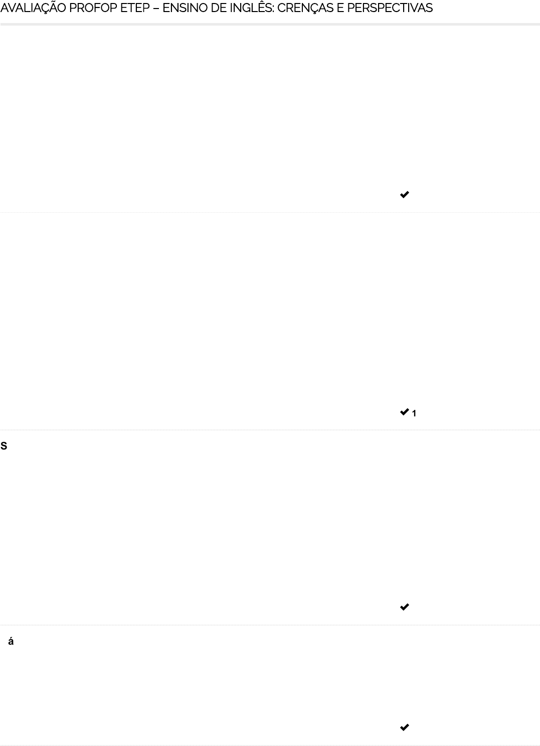 AVALIAÇÃO PROFOP ETEP – ENSINO DE INGLÊS: CRENÇAS E PERSPECTIVAS PONTUAÇÃO TOTAL: 1PONTUAÇÃO OBTIDA 1 Como a atividade de ensinar está também relacionada às crenças pessoais do professor (que são referências importantes para ele) e as suas atitudes em sala de aula são o resultado de suas crenças (Lunenburg & Schmidt, 1989), os estudos em aquisição de segundas línguas buscam, hoje, entender como essas crenças interferem no processo de ensino e aprendizagem da língua, afetando a prática do professor e também a vida escolar (Schmidt & Jacobson, 1990). Para entender o ensino da língua estrangeira é preciso, portanto: Resposta Marcada : Todas as alternativas anteriores. PONTUAÇÃO TOTAL: 1PONTUAÇÃO OBTIDA 1 O estudo sobre as crenças dos professores de LE interessa, principalmente, às instituições de ensino responsáveis por preparar o professor para ensinar, é muito importante. Assim, a reflexão sobre o ensino ou “reflective teaching” tem se tornado uma peça essencial na educação do professor (Zeichner & Liston, 1996), uma vez que este deve considerar as pressuposições e as crenças dos professores sobre o processo de ensino e aprendizagem da língua. Como coloca Bartlett (1990, p.212), “ao nos tornarmos reflexivos, somos forçados a adotar uma atitude crítica de nós mesmos como professores individuais de segunda língua, desafiando nossas visões pessoais sobre o ensino” . Uma vez que a vida do professor não pode ser separada de sua prática (Goodson, 1992), hoje se defende: Resposta Marcada : Investigar o professor no seu local de trabalho, buscando interpretar as suas ações não só a partir do que realiza em aula, mas também a partir de suas próprias perspectivas. PONTUAÇÃO TOTAL: 1PONTUAÇÃO OBTIDA 1 Segundo Clark & Peterson (1986), o comportamento do professor é substancialmente influenciado e até mesmo determinado pelos processos de pensamento dos professores. Uma vez que as crenças individuais das pessoas afetam significativamente seu comportamento (Pajares, 1992), a compreensão do sistema educativo, sua problemática e complexidade de suas relações interpessoais (Ecalle, 1998) requerem um estudo aprofundado das crenças e seu efeito nos professores e na vida acadêmica (Lunenburg & Schmidt, 1989), na prática de ensino da LE, na cultura e no desenvolvimento profissional do professor e na preparação do futuro professor (Aston, 1990). Portanto, as crenças afetam: Resposta Marcada : A tomada de decisão do professor. PONTUAÇÃO TOTAL: 1PONTUAÇÃO OBTIDA 1 Há uma grande dificuldade na definição dos termos crenças e conhecimento do professor (Clandinin & Connelly, 1987; Pajares, 1992). Como resultado, tem-se uma variedade de interpretações do termo crenças, entre elas destacamos as seguintes, EXCETO: Resposta Marcada : Crenças definidas como determinantes do saber (Brown & Cooney, 1982). PONTUAÇÃO TOTAL: 1PONTUAÇÃO OBTIDA 1 Entre as inúmeras definições para os termos crenças e conhecimento do professor, destacamos o conhecimento prático pessoal (Clandinin & Connelly, 1987), o qual é visto por Roehler et al. (1988) como uma base para se examinar o conhecimento pessoal dos professores. As crenças educacionais (idéias pré-concebidas e teorias implícitas, Clark, 1988) e orientações para o ensino (Porter & Freeman, 1986) também devem ser consideradas em um estudo sobre as crenças dos professores. Devem ser igualmente investigadas as influências do conhecimento do professor no ensino (Woods, 1996), considerando-se os conceitos de, EXCETO: Resposta Marcada : “Conhecimento padrão”. PONTUAÇÃO TOTAL: 1PONTUAÇÃO OBTIDA 1 Conhecer a distinção entre os sistemas de crenças e os sistemas de conhecimento do professor, segundo Abelson (1979) e Nespor (1987), também é importante. Para Nespor, as crenças são: Resposta Marcada : Mais influenciáveis do que o conhecimento na forma como as pessoas organizam e definem tarefas e problemas, pois predizem o comportamento. PONTUAÇÃO TOTAL: 1PONTUAÇÃO OBTIDA 1 Outra questão que não pode ser ignorada em um estudo sobre as crenças, é conhecer como elas são originadas, se através do processo de aculturação e construção social (Van Fleet, 1979), se da incorporação de idéias de outras pessoas (Lasley, 1980) ou se de inferências de si mesmas, ambiente e circunstâncias (Nisbett & Ross, 1980). Para Nisbett & Ross, as experiências prematuras influenciam os julgamentos finais, tornando-se teorias (ou crenças) difíceis de serem mudadas. Quanto às características das crenças, em geral, elas são vistas como representações mentais integradas dentro de um esquema existente, seguindo três suposições: I – As crenças formam um esquema como uma rede semântica. II – As crenças contraditórias residem em diferentes domínios desta rede. III – Algumas crenças são “essência” e, portanto, fáceis de mudar (Peterman, 1991). IV – As crenças contraditórias residem nos mesmos domínios desta rede. V – Algumas crenças são “essência” e, portanto, difíceis de mudar (Peterman,1991). As alternativas corretas são: Resposta Marcada : I, II e V. 10 / 10 PONTUAÇÃO TOTAL: 1PONTUAÇÃO OBTIDA 1 Entendem que as crenças metafísicas e os conceitos são centrais para uma concepção e responsáveis por filtrarem novas informações antes de estas se tornarem conhecimento adquirido. Para Posner et al. (1982), é pela assimilação que novas informações são incorporadas dentro de crenças já existentes na ecologia, e a acomodação acontece quando a nova informação não pode ser assimilada, então, as crenças existentes são substituídas ou reorganizadas. Mas dificilmente as crenças são substituídas, a menos que sejam provadas insatisfatórias. Assim são aspectos importantes na formação das crenças do professor, EXCETO: Resposta Marcada : Conceito de “apprenticeship of observation, Lortie, 1975 – (imagens de ensino 