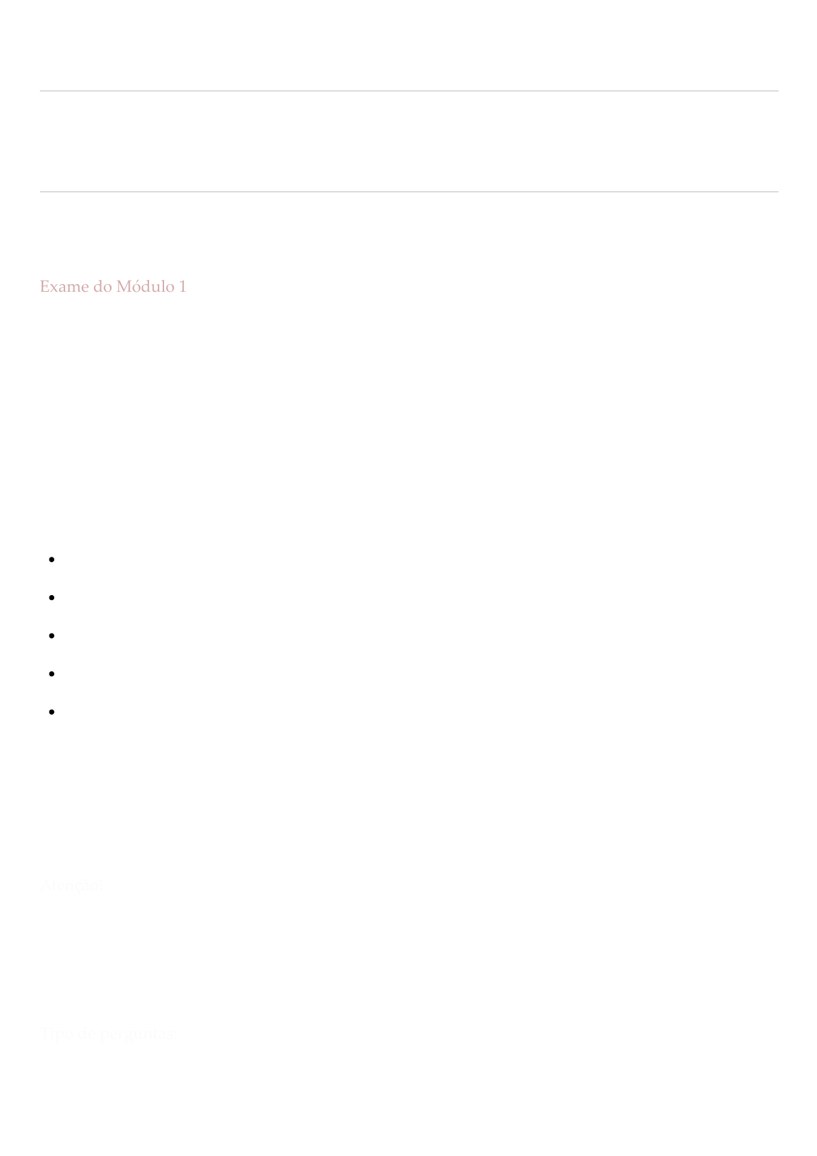 18/09/22, 17:30 Exame do Módulo 1: Curso gratuito: Liderança e Empreendedorismo https://uva.instructure.com/courses/28870/quizzes/5374 1/13 Exame do Módulo 1 Entrega 30 set em 23:59 Pontos 100 Perguntas 25 Disponível até 30 set em 23:59 Limite de tempo 45 Minutos Tentativas permitidas 5 Instruções Exame do Módulo 1 Para responder o seguinte exame, você deve ter revisado e estudado todos os conteúdos e recursos do módulo. Cada recurso lhe fornecerá ferramentas para poder responder às perguntas. Por isso, deverá prestar a devida atenção a cada um deles: Vídeos Esquema conceitual Leituras Fórum Vídeos de conceitos chaves Este exame tem o objetivo de verificar o avanço de sua aprendizagem e representa uma prática de avaliação formal, a qual lhe outorgará uma qualificação de desempenho. Atenção! Lembramos que você terá somente duas tentativas para a realização do mesmo. Cada tentativa terá um tempo limite de 20 minutos para sua realização. Tipo de perguntas: Cada exame pode conter diversos tipos de perguntas ou ordens: 18/09/22, 17:30 Exame do Módulo 1: Curso gratuito: Liderança e Empreendedorismo https://uva.instructure.com/courses/28870/quizzes/5374 2/13 Histórico de tentativas Tentativa Tempo Pontuação MAIS RECENTE Tentativa 1 15 minutos 98,67 de 100 Pontuação desta tentativa: 98,67 de 100 Enviado 18 set em 17:29 Esta tentativa levou 15 minutos. Verdadeiro-Falso: deve indicar se a proposição pode se considerar verdadeira ou falsa. Você deverá levar em consideração que, se somente um elemento da proposição for falso, deve se considerar falsa em seu conjunto. Múltipla escolha:somente uma das opções é correta.As alternativas estão indicadas com círculos.Você deverá selecionar a alternativa correta marcando o círculo precedente. Resposta múltipla:pode haver mais de uma resposta correta.Você deverá selecionar todas as alternativas que considere corretas, assinalando no quadrado. Será outorgada uma pontuação parcial em caso de não marcar todas as correspondentes. Coincidente:deve vincular duas categorias, selecionando na 1º coluna o conceito que corresponde com a categoria da 2ª coluna. Desejamos que você consiga desenvolver este exame com sucesso! Para começar, você deverá clicar em “Realizar Teste”, uma vez respondidas as perguntas, deverá clicar em “Enviar Teste”. Fazer o teste novamente 4 / 4 ptsPergunta 1 O processo comunicativo chamado “comunicação não verbal” poderá consolidar a atuação de um líder diante de seus colaboradores. A https://uva.instructure.com/courses/28870/quizzes/5374/history?version=1 https://uva.instructure.com/courses/28870/quizzes/5374/take?user_id=154407 18/09/22, 17:30 Exame do Módulo 1: Curso gratuito: Liderança e Empreendedorismo https://uva.instructure.com/courses/28870/quizzes/5374 3/13 respeito dos gestos do líder, é correto afirmar que: I. Os gestos emblemáticos são emitidos intencionalmente. II. Os gestos reguladores podem servir para acelerar o interlocutor. III. Os gestos ilustrativos auxiliam a comunicação verbal. Analise as afirmativas e marque a resposta correta: As afirmativas I, II e III estão incorretas. As afirmativas II e III estão corretas. Somente a afirmativa II está correta. Apenas a afirmativa I está correta. As afirmativas I, II e III estão corretas. Correto!Correto! 4 / 4 ptsPergunta 2 Os lideres são pessoas influentes e com credibilidade. Falso Verdadeiro. Correto!Correto! 4 / 4 ptsPergunta 3 O trabalho em equipe simplesmente é a somatória das contribuições individuais. 18/09/22, 17:30 Exame do Módulo 1: Curso gratuito: Liderança e Empreendedorismo https://uva.instructure.com/courses/28870/quizzes/5374 4/13 Falso Correto!Correto! Verdadeiro 4 / 4 ptsPergunta 4 As qualidades que um líder deve ter são: Sinceridade. Correto!Correto! Obediência. Correto!Correto! Justiça. Correto!Correto! Coragem. Correto!Correto! Honestidade. Correto!Correto! 4 / 4 ptsPergunta 5 A etapa divergente é aquela em que o líder permite todo tipo de opiniões e onde vale tudo. Verdadeiro Correto!Correto! Falso 4 / 4 ptsPergunta 6 A equipe ideal é resultado do exercício que permite refletir sobre os pontos fortes e fracos das pessoas. 18/09/22, 17:30 Exame do Módulo 1: Curso gratuito: Liderança e Empreendedorismo https://uva.instructure.com/courses/28870/quizzes/5374 5/13 Falso Verdadeiro Correto!Correto! 4 / 4 ptsPergunta 7 De acordo com o que aprendemos no módulo, veja a imagem e responda a seguinte pergunta: Quais gestos não verbais você consegue observar? Emblemáticos ou emblemas. Correto!Correto! Reguladores. Correto!Correto! Ilustrado. Correto!Correto! Pantográfico. Correto!Correto! Expressão facial. Correto!Correto! 18/09/22, 17:30 Exame do Módulo 1: Curso gratuito: Liderança e Empreendedorismo https://uva.instructure.com/courses/28870/quizzes/5374 6/13 2,67 / 4 ptsPergunta 8 As principais virtudes no exercício da liderança são: Virtudes derivadas. Correto!Correto! Virtudes teologais. esposta corretaesposta correta Virtudes cardinais. Correto!Correto! Virtudes de credibilidade. Virtudes do bem comum. 4 / 4 ptsPergunta 9 As inovações permitem que as organizações obtenham diferenciais e vantagens competitivas sobre seus concorrentes. Além de produtos, as empresas também podem inovar em: I. Processos. II. Modelo de negócios. III. Gestão. Analise as afirmativas e marque a resposta correta: Apenas a afirmativa I está correta. Apenas a afirmativa III está correta. As afirmativas I e II estão incorretas. 18/09/22, 17:30 Exame do Módulo 1: Curso gratuito: Liderança e Empreendedorismo https://uva.instructure.com/courses/28870/quizzes/5374 7/13 Apenas a afirmativa II está correta. As afirmativas I e II estão corretas. Correto!Correto! 4 / 4 ptsPergunta 10 O sentimento de descontentamento e falta de confiança em si mesmo está expresso em: A equipe ideal. Criatividade. Comunicativo. Autoestima positiva. Autoestima negativa. Corre