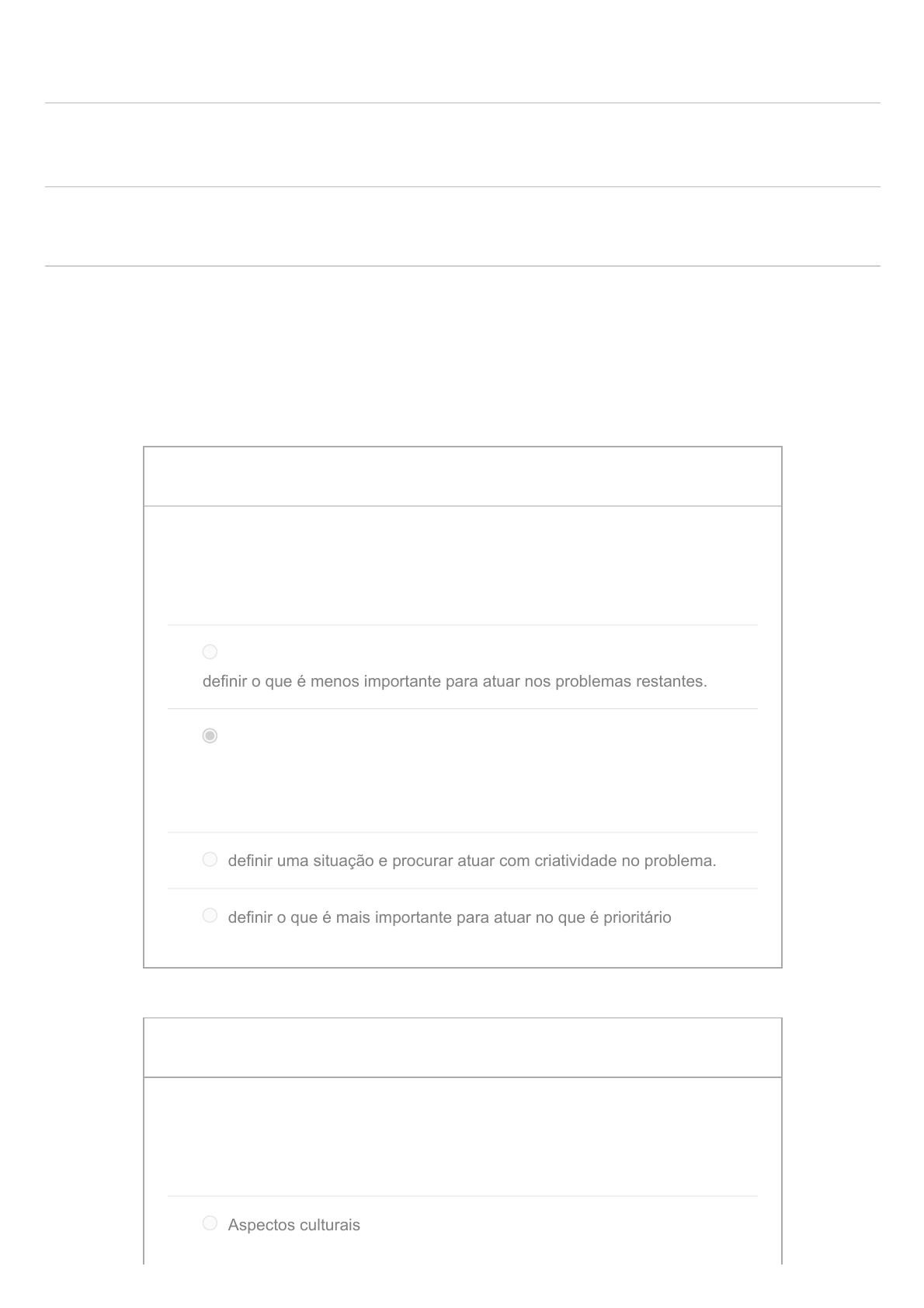 18/09/2022 22:04 Teste da semana 5: Negociação e Tomada de Decisão - G6/T1 - 2022/2 https://pucminas.instructure.com/courses/127840/quizzes/339825 1/3 Teste da semana 5 Entrega 30 set em 23:59 Pontos 5 Perguntas 4 Disponível 29 ago em 0:00 - 30 set em 23:59 Limite de tempo Nenhum As respostas corretas não estão mais disponíveis. Pontuação deste teste: 5 de 5 Enviado 5 set em 18:30 Esta tentativa levou 4.081 minutos. 1,25 / 1,25 ptsPergunta 1 O processo de decisão baseado na categorização implica em categorizar, ou seja, definir o que é menos importante para atuar nos problemas restantes. definir previamente alguns diagnósticos possíveis e ações possíveis e enquadrar um problema nesses tipos. definir uma situação e procurar atuar com criatividade no problema. definir o que é mais importante para atuar no que é prioritário 1,25 / 1,25 ptsPergunta 2 Dentre os itens abaixo, assinale aspectos que não estão incluídos da discussão de decisão responsável. Aspectos culturais 18/09/2022 22:04 Teste da semana 5: Negociação e Tomada de Decisão - G6/T1 - 2022/2 https://pucminas.instructure.com/courses/127840/quizzes/339825 2/3 Aspectos ligados a consciência moral Aspectos ligados a diferença de percepção entre os indivíduos. Aspecto ligados a ética 1,25 / 1,25 ptsPergunta 3 Dentre as decisões a seguir, assinale aquela que tem características de uma decisão incremental. Um decorador procurou colocar poucas peças em certo imóvel, e através de sondagem com os futuros moradores, foi adequando, com o tempo, o ambiente aos gostos dos moradores. Um professor que, insatisfeito com os resultados de seus alunos, alterou completamente a metodologia de estudos. Um médico que resolveu operar um paciente que estava entre a vida e a morte. Um advogado que mediante consulta ao cliente resolveu mudar totalmente as bases jurídicas de certo pleito (fundamentação jurídica). 1,25 / 1,25 ptsPergunta 4 Observe as situações abaixo e assinale aquela que NÃO se refere a categorização. 18/09/2022 22:04 Teste da semana 5: Negociação e Tomada de Decisão - G6/T1 - 2022/2 https://pucminas.instructure.com/courses/127840/quizzes/339825 3/3 Um psicólogo que tem uma série de procedimentos catalogado para casos de problemas psíquicos. Um advogado que frente a uma situação de conflito de direito analisa o caso a partir de diversas variáveis envolvidas. Um consultor organizacional na área de treinamento e que tem uma serie de situações previstas para determinados problemas de treinamento. Um profissional de computação que frente a diversas possibilidades de problemas define a partir de uma lista previa de soluções possíveis. Pontuação do teste: 5 de 5