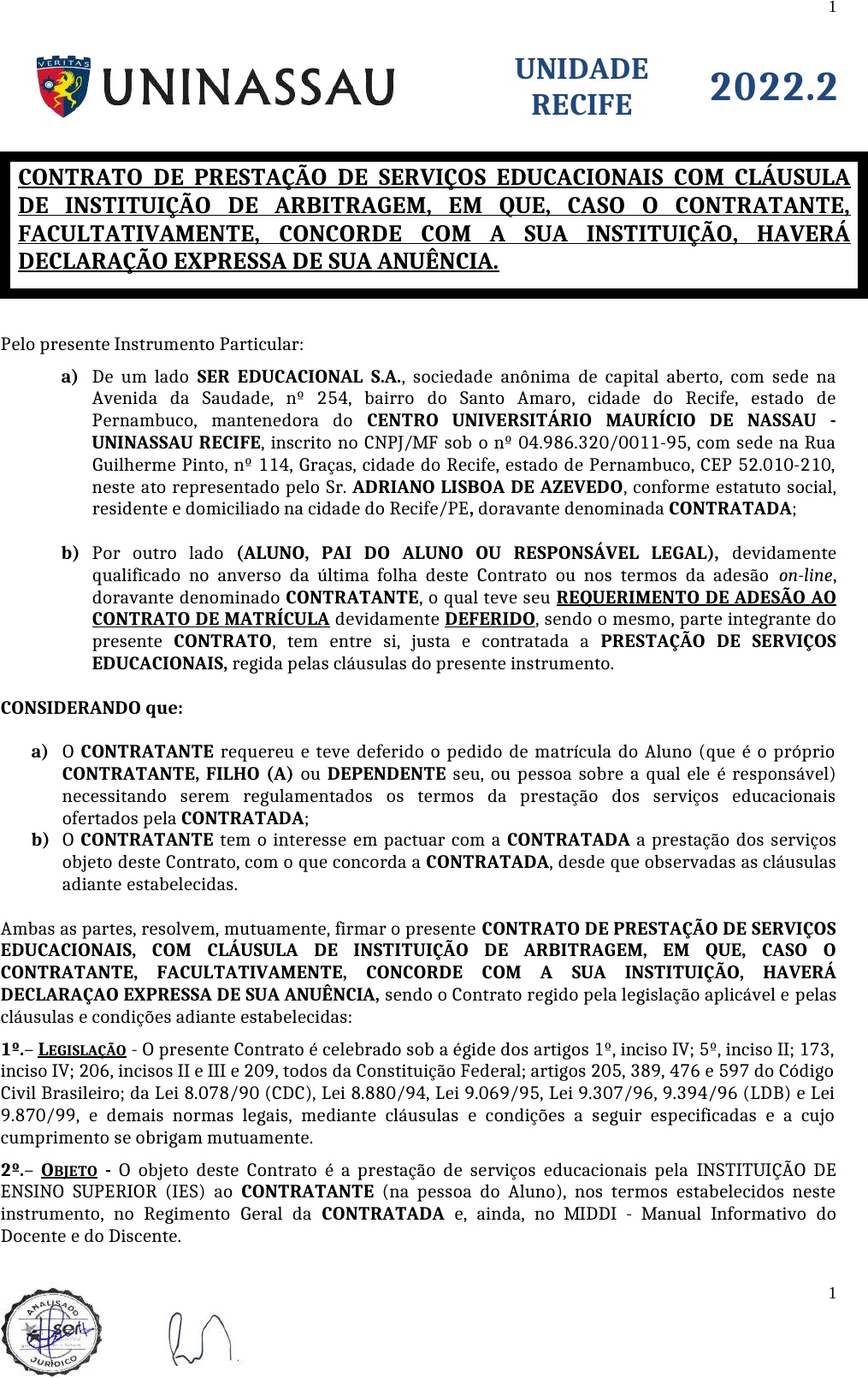 UNIDADE RECIFE 2022.2 Pelo presente Instrumento Particular: a) De um lado SER EDUCACIONAL S.A., sociedade anônima de capital aberto, com sede na Avenida da Saudade, nº 254, bairro do Santo Amaro, cidade do Recife, estado de Pernambuco, mantenedora do CENTRO UNIVERSITÁRIO MAURÍCIO DE NASSAU - UNINASSAU RECIFE, inscrito no CNPJ/MF sob o nº 04.986.320/0011-95, com sede na Rua Guilherme Pinto, nº 114, Graças, cidade do Recife, estado de Pernambuco, CEP 52.010-210, neste ato representado pelo Sr. ADRIANO LISBOA DE AZEVEDO, conforme estatuto social, residente e domiciliado na cidade do Recife/PE, doravante denominada CONTRATADA; b) Por outro lado (ALUNO, PAI DO ALUNO OU RESPONSÁVEL LEGAL), devidamente qualificado no anverso da última folha deste Contrato ou nos termos da adesão on-line, doravante denominado CONTRATANTE, o qual teve seu REQUERIMENTO DE ADESÃO AO CONTRATO DE MATRÍCULA devidamente DEFERIDO, sendo o mesmo, parte integrante do presente CONTRATO, tem entre si, justa e contratada a PRESTAÇÃO DE SERVIÇOS EDUCACIONAIS, regida pelas cláusulas do presente instrumento. CONSIDERANDO que: a) O CONTRATANTE requereu e teve deferido o pedido de matrícula do Aluno (que é o próprio CONTRATANTE, FILHO (A) ou DEPENDENTE seu, ou pessoa sobre a qual ele é responsável) necessitando serem regulamentados os termos da prestação dos serviços educacionais ofertados pela CONTRATADA; b) O CONTRATANTE tem o interesse em pactuar com a CONTRATADA a prestação dos serviços objeto deste Contrato, com o que concorda a CONTRATADA, desde que observadas as cláusulas adiante estabelecidas. Ambas as partes, resolvem, mutuamente, firmar o presente CONTRATO DE PRESTAÇÃO DE SERVIÇOS EDUCACIONAIS, COM CLÁUSULA DE INSTITUIÇÃO DE ARBITRAGEM, EM QUE, CASO O CONTRATANTE, FACULTATIVAMENTE, CONCORDE COM A SUA INSTITUIÇÃO, HAVERÁ DECLARAÇAO EXPRESSA DE SUA ANUÊNCIA, sendo o Contrato regido pela legislação aplicável e pelas cláusulas e condições adiante estabelecidas: 1º.– LEGISLAÇÃO - O presente Contrato é celebrado sob a égide dos artigos 1º, inciso IV; 5º, inciso II; 173, inciso IV; 206, incisos II e III e 209, todos da Constituição Federal; artigos 205, 389, 476 e 597 do Código Civil Brasileiro; da Lei 8.078/90 (CDC), Lei 8.880/94, Lei 9.069/95, Lei 9.307/96, 9.394/96 (LDB) e Lei 9.870/99, e demais normas legais, mediante cláusulas e condições a seguir especificadas e a cujo cumprimento se obrigam mutuamente. 2º.– OBJETO - O objeto deste Contrato é a prestação de serviços educacionais pela INSTITUIÇÃO DE ENSINO SUPERIOR (IES) ao CONTRATANTE (na pessoa do Aluno), nos termos estabelecidos neste instrumento, no Regimento Geral da CONTRATADA e, ainda, no MIDDI - Manual Informativo do Docente e do Discente. CONTRATO DE PRESTAÇÃO DE SERVIÇOS EDUCACIONAIS COM CLÁUSULA DE INSTITUIÇÃO DE ARBITRAGEM, EM QUE, CASO O CONTRATANTE, FACULTATIVAMENTE, CONCORDE COM A SUA INSTITUIÇÃO, HAVERÁ DECLARAÇÃO EXPRESSA DE SUA ANUÊNCIA. 1 1 3º.- Declara expressamente o CONTRATANTE ter conhecimento dos seguintes documentos e informações que se encontram disponíveis na Página da CONTRATADA na Rede Mundial de Computadores (Internet), no seguinte endereço eletrônico https://www.uninassau.edu.br/, obrigando-se o Aluno a obedecê-los fielmente: Regimento Geral da IES MIDDI – Manual Informativo Do Docente E Discente Regulamento/Cartilha Financeira Projeto Pedagógico do Curso Código de Ética Regulamentos Portarias 4º.- Declara ainda, ter ciência de que o currículo do curso, calendário escolar, critérios de avaliação, registros de faltas, notas e demais procedimentos operacionais pertinentes ao curso, estão disponíveis na REGIMENTO GERAL DA IES, acessível no site da Instituição CONTRATADA, fazendo parte integrante deste Contrato, e que, em virtude de ter lido todas as cláusulas constantes deste Contrato, está ciente de todas elas, aceitando-as expressamente. CONTRATANTE - ______________________ CONTRATADA - ______________________ 5º.- DA FORMALIZAÇÃO “ ONLINE” A ESTE CONTRATO VIA INTERNET 5.1.- - ALUNOS NOVATOS: AS PARTES CONTRATANTES RECONHECEM A LEGITIMIDADE E VALIDADE DESTE CONTRATO, PELA SUA FORMALIZAÇÃO VIA INTERNET. A FORMALIZAÇÃO REALIZAR-SE-Á DO SEGUINTE MODO: A) PREENCHIMENTO VIA INTERNET POR MEIO DE ACESSO ON-LINE NO SITE DO PROCESSO SELETIVO; B) APROVAÇÃO NO PROCESSO SELETIVO DE ACORDO COM OS CRITÉRIOS ESTABELECIDOS PARA CADA FORMA DE INGRESSO, CONFORME EDITAL, SENDO CONSIDERADO PLENO E EFICAZ APÓS SEU ACEITE ON-LINE ; E C) PAGAMENTO REFERENTE A PRIMEIRA PARCELA DA SEMESTRALIDADE, A QUAL CONFIGURA A MATRÍCULA (ADIANTAMENTO DE MATRÍCULA). 5.2.- ALUNOS VETERANOS –AS PARTES CONTRATANTES RECONHECEM A LEGITIMIDADE E VALIDADE DESTE CONTRATO, PELA SUA FORMALIZAÇÃO VIA INTERNET. A FORMALIZAÇÃO REALIZAR-SE-Á DO SEGUINTE MODO: A) RETIRADA DO BOLETO DE RENOVAÇÃO DE MATRÍCULA NO PORTAL DO ALUNO, DISPONÍVEL AO FINAL DE CADA SEMESTRE; B) PAGAMENTO DO BOLETO DE RENOVAÇÃO/MATRÍCULA, CONFORME DATA DE VENCIMENTO; C) PREENCHIMENTO VIA INTERNET POR MEIO DE ACESSO ON-LINE AO PORTAL DO ALUNO, COM USO DE SENHA PARTICULAR, CONFIDENCIAL E INTRANSFERÍVEL, SENDO O CONTRATO CONSIDERADO PLENO E EFICAZ APENAS QUANDO A CONTRATADA CONFIRMAR A REGULARIDADE FINANCEIRA DO CONTRATANTE NOS PERÍODOS JÁ CURSADOS, BEM COMO O PAGAMENTO DA PRIMEIRA PARCELA DO CONTRATO CORRESPONDENTE AO SEMESTRE EM CURSO. 6º.- DA FORMALIZAÇÃO PRESENCIAL - Em casos excepcionais, a formalização ao contrato será realizada em caráter presencial, mediante comparecimento do CONTRATANTE à Secretaria da Unidade / Central de Relacionamento com o Aluno – CRA, para entrega da documentação obrigatória conforme Edital e/ou regulamentos e assinatura do contrato. 7º.- O PRAZO DE VIGÊNCIA DO PRESENTE CONTRATO ESTÁ CONDICIONADO AO ATENDIMENTO DOS ASPECTOS FORMAIS DE SUA CONSTITUIÇÃO. PARA ALUNOS NOVATOS, FICA SUBORDINADO À APROVAÇÃO DO ALUNO NO PROCESSO SELETIVO E AO