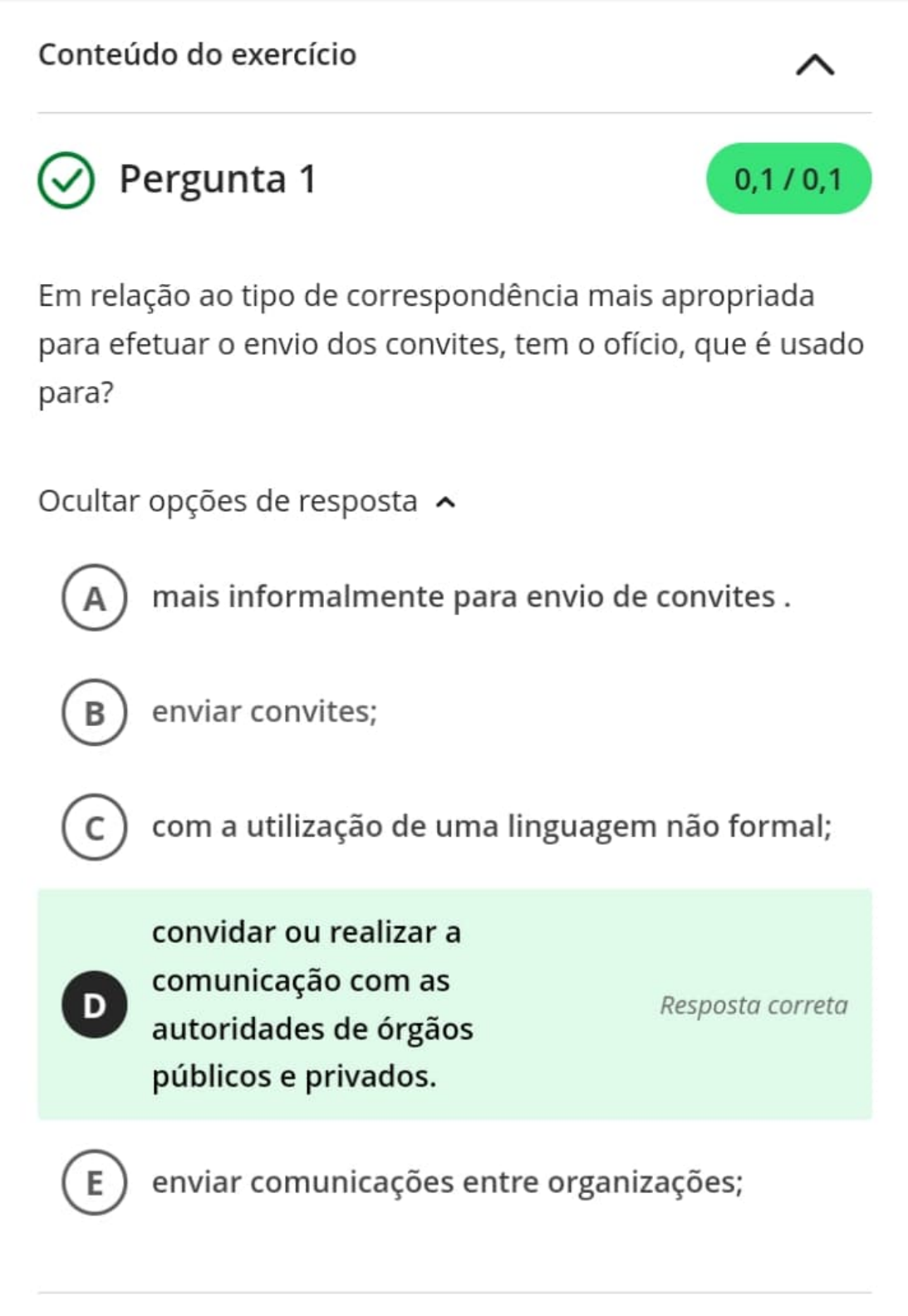 Conteúdo do exercício (2) Pergunta 1 ( 0,110,1) Em relação ao tipo de correspondência mais apropriada para efetuar o envio dos convites, tem o ofício, que é usado para? Ocultar opções de resposta ,. 0 mais informalmente para envio de convites. @ enviar convites; © com a utilização de uma linguagem não formal; convidar ou realizar a . -comun1caçao com as autoridades de órgãos públicos e privados. Resposta correta 0 enviar comunicações entre organizações; (0 Pergunta 2 Além dos tipos, os eventos também são classificados de acordo com srua categoria que pode ser? Ocultar opções de resposta ,. @ Dialogais ou sociais. 0 Expositivos ou sociais. • Institucional ou promocional. CÊ) Fechados ou abertos. 0 Honoríf ico ou competit ivo. Resposta correta 0 Pergunta 3 (0,110,1) Analise as alternativas que tratam sobre a execução do hino nacional brasileiro em eventos. 1 - Nas cerimônias em que se tenha de executar hino nacional estrangeiro, este precederá, em virtude do princípio de cortesia, o hino nacional brasileiro. li - O hino nacional brasileiro sempre será executado primeiramente, mesmo que na cerimônia estejam presentes autoridades estrangeiras. Ili -A execução do hino nacional só terá início depois que o presidente da República houver ocupado o lugar que lhe estiver reservado. IV - Não é correto bater palmas após a execução do hino nacional, salvo se houver sido executado por orquestra. Marque a opção correta. Ocultar opções de resposta ,.._ 0 1 e li; o 1, li e Ili. Resposta correta © 1 e IV. 0 1, Ili e IV. 0 li e IV. (2) Pergunta 4 ( 0,110,1) No século XII, a corte francesa elaborou um código de boas maneiras que até hoje é utilizado como a etiqueta, estando associada a formalidades. O que o código contém? Ocultar opções de resposta ,.. • Instruções de como deverá ser o comportamento de uma pessoa. @ Normas de vestimentas. Resposta correta © Regras de disposição das bandeiras. @ Dado,s sobre uma cerimônia de casamento. 0 Orientações de um evento em geral. (0 Pergunta 5 0,11 o,i) Analise as alternativas quanto ao conceito de eventos fechados e abertos. 1 - Eventos fechados são aqueles cujo público já está definido, que recebem um convite e não são abertas precedências para novos participantes. li - Eventos abertos são aqueles destinados ao público, de modo geral, e todas as pessoas podem participar. Ili - Em eventos fechados, o participante não faz sua inscrição previamente, mas recebe o certificado de participação. IV - Um show é um exemplo de evento fechado. V - Um congresso é um exemplo de aberto. Assinale a opção correta. Ocultar opções de resposta "' 0 1 e Ili. 0 1, Ili eV; • 1 e li; Resposta correta ® 11,IVeV; 0 1, li e 111, (0 Pergunta 6 Para Frelberger e Oliveira (2012), os eventos são divididos conforme suas dimensões em: Ocultar opções de resposta ,. • pequ,eno, médio, grande e mega; 0 pequ,eno, médio e mega; @ grande e mega; @ médio, grande e mega; (D pequeno, médio e grande; Resposta correta (0 Pergunta 7 Quando se fala em extensões de eventos, é de conhecimento que existem diversas, e uma delas é a extensão evento pan-americano, que acontece quando? Ocultar opções de resposta ,.. • 0 0 0 Houver representantes de dois ou mais países da América Latina, além do país sede. Resposta correta Houver representantes de duas ou mais cidades de um mesmo estado; Houver representantes de dois ou mais estados de uma mesma região. For realizado na sede do município. Houver representantes de diversos estados do país. 0 Pergunta 8 ~ 0,110,1) Eventos demonstrativos ou expositivos tem como objetivo? Ocultar opções de resposta " • 0 0 0 Buscam a demonstração de um local, serviços ou produto. Resposta correta Geralmente realizados pelas instituições públicas. São destinados a gerar competição entre os participantes. Eventos realizados para homenagear os servidores. Aproximam as relações, o entrosamento. (2) Pergunta 9 ( 0,110,1) Segundo o art. 1 º, da Lei n. 5.700n1, são considerados símbolos nacionais e inalteráveis: Ocultar opções de resposta ~ @ o Selo Nacional; O o hino nacional; © 0 0 . . as armas nac1ona1s; a bandeira nacional; todas as alternativas anteriores. Resposta correta 0 Pergunta 1 O Analise as alternativas que tratam sobre os termos: cerimonial, protocolo e etiqueta, e marque a opção correta. 1 - Etiqueta é um fenômeno da cultura popular e as características de cordialidade e hospitalidade estão ligadas às normas de comportamento pessoal requintado. li - Cerimonial e Etiqueta são termos paralelos, ou seja, tem o mesmo sentido. Ili- Cerimonial e Protocolo são exigidos apenas em eventos de caráter oficial, com a presença do Governador do Estado e Presidência da República. IV - Protocolo é a ordem hierárquica que determina as regras de conduta aos governos e seus representantes em ocasiões oficiais e particulares. Ocultar opções de resposta ~ @ as alternativas 1, li e IV; @ as alternativas Il i e IV; © as alternativas li e Ili; CÊ) apenas a alternativa 1. O as alternativas 1, IV; Resposta correta