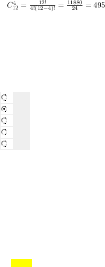Prova N2 A5 Pergunta 2 Enzo, aluno do primeiro ano de um colégio do interior do Estado de Pernambuco, possui 12 lápis de diferentes cores e deseja arrumá-los em grupos de 4 lápis em diferentes caixas de acrílico. Para realizar essa separação, assinale a alternativa correta em relação a quantos modos diferentes Enzo poderá proceder: R: Pergunta 3 Maurício, Carla, Fábio, Ana e Matheus são alunos da educação infantil do Colégio Sol Nascente e serão organizados em uma fila indiana para visitarem a biblioteca. Nessa fila indiana, cada um dos cinco estudantes deve ocupar uma posição determinada, sendo considerada uma ordenação diferente toda vez que permutarmos dois ou mais alunos. Calcule a quantidade de formas segundo as quais esses alunos poderão ser organizados nessa fila e assinale a alternativa que corresponde à opção correta: 130. 120. 240. 80. 60 R: 5! = 120 Pergunta 4 Os dados abaixo correspondem à receita média mensal de três empresas do ramo de exploração de petróleo localizadas na região Nordeste do Brasil. Os valores coletados foram: D1= 6, D2= 8, e D3= 19. Para verificar a variabilidade desse conjunto de dados, calcule a variância amostral desses dados e assinale a alternativa correta. A) 81 B) 64 C) 60 D) 49* E) 44 Pergunta 9 O gráfico a seguir representa a frequência absoluta do preço de óculos de EPI em 15 lojas localizadas no estado de São Paulo. Entre as 15 lojas, apenas duas cobram o valor de R$ 22 pelos óculos. A partir dessas informações, assinale a alternativa que corresponde ao valor mais próximo do valor médio dos óculos nas 15 lojas. A) R$ 23 B) R$ 18 C) R$ 16 D) R$ 31 E) R$ 20* 4x31 = 124 1x29= 29 2x22 = 44 3x17 = 51 5x12 = 60 Soma de todos= 308 308 dividido por 15 = 20 reais Pergunta 7 1. Em um processo seletivo para o setor financeiro de uma grande empresa, compareceram 13 candidatos para a gerência, 35 candidatos à coordenação e 61 candidatos à supervisão. Calcule quantas maneiras diferentes podemos escolher exatamente 1 gerente, 1 coordenador e 1 supervisor para o setor dessa empresa. Assinale a alternativa que corresponde à opção correspondente. 2135. 2928. 516. 27755. 35635. R: a multiplicação de 13*35*61 = 277"55" Pergunta 6 A função de um dado é gerar um resultado aleatório quando lançado. Com base nessa informação, qual a probabilidade de, no lançamento de dois dados diferentes, obter a soma menor que 3? Note que estamos tratando de dois dados de seis faces e não viciados. Dessa forma, assinale a alternativa correta: a) 1/12 b) 1/18 c) 1/36* d) ¼ e) 1/6 Pergunta 5 A Estatística Descritiva é a parte da estatística que fundamenta os métodos e procedimentos para descrição de conjuntos de dados. Para isso, precisamos compreender os conceitos de medidas de tendência central e de dispersão e construção e análise de gráficos e tabelas. Sobre esses elementos, assinale a alternativa correta. a) A altura de uma pessoa, em metros, é uma medida quantitativa discreta.* b) A amplitude é sempre uma boa medida para a dispersão de um conjunto de dados. c) Só devemos utilizar gráficos de setores para dados qualitativos. d) Um conjunto com 10 dados quantitativos não possui mediana. e) A mediana de um conjunto coincide com 2º quartil. Pergunta 10 Um engenheiro coleta as medidas de corrente em um circuito e verifica que essas seguem uma distribuição normal com µ = 10 miliamperes e σ = 4 miliamperes. Calcule a chance de uma das medidas ser superior a 13 miliamperes e marque a alternativa correta abaixo. a) 9,5% b) 8,2% c) 10,4% d) 6,7%* e) 13,8% Pergunta 8 Atualmente, o basquete é um dos jogos olímpicos mais populares do planeta. Nas olimpíadas escolares de 2018, foi realizado um torneio de basquete com 10 times participantes. Calcule quantas partidas foram realizadas entre os times participantes no torneio, considerando-se que todos os times jogaram entre si duas vezes e, por fim, assinale a alternativa correspondente. a) 90* b) 20 c) 60 d) 120 e) 40 Pergunta 1 A tabela a seguir representa a variável aleatória x, que corresponde ao número de filhos de um casal com mais de 10 anos de casados numa cidade do interior do Rio Grande do Sul. Na primeira coluna, estão os possíveis valores de x e na segunda, as respectivas probabilidades. 0 0,15 1 0,20 2 0,35 3 0,30 Com base nos dados da tabela, assinale a alternativa que indica o valor da variância, na ocasião da coleta desses dados. a) 1,06* b) 1,07 c) 1,04 d) 1,05 e) 1,03