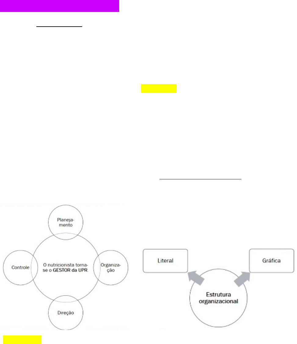 Aula 2 – Gestão UPR CONCEITUAL ATUAÇÃO DO NUTRICIONISTA NA GESTÃO UPR O que é UPR ou UAN? Onde são desenvolvidas refeições desde o pré-preparo até a distribuição para as pessoas, cada uma com suas finalidades: para os enfermos com intuito ajudar a melhorar a saúde. E para os sadios com intuito de dar um suporte/manter a saúde dos clientes. O nutricionista tem a função de gerir a UPR/UAN com gestão de liderança. Etapas da Gestão Planejamento: decidir com antecedência o que deve ser feito para alcançar o objetivo. Metas: quantidade das refeições Instrumento de ordenação, eficiência e produtividade que vai ser usado na produção. (Pensando no futuro) 3 NÍVEIS DE ETAPAS PARA GESTÃO · Estratégico (em nível de diretoria): Ex.: meta financeira · Tático (em nível gerencial): no sentido de produção: Ex.: qual o cardápio · Operacional (em nível de produção): Ex.: como fazer? Organização: processo administrativo de como será a estruturação, reunindo pessoas e equipamentos que serão utilizados para atingir os objetivos do planejamento. Dividir as atividades dos manipuladores, quais são os materiais que serão utilizados no preparo das refeições. 3 NÍVEIS DE ORGANIZAÇÃO · Nível Global: a empresa toda · Nível Departamental: diferentes setores (Ex.: cozinheiro, auxiliar de cozinha) · Nível de Operações: dividindo as tarefas de cada um. Literal: regulamentos da empresa Gráfica (organograma): através de desenhos, figuras geométricas que representam as unidades estruturais ou cargos. As linhas retratam a relação ou comunicação com os outros manipuladores. ORGANOGRAMA AUTORIDADE DE LINHA: a gestão fica sob o comando de uma pessoa que fica no topo do organograma (bastante utilizadas em Gestão de UPR institucionais) ORGANOGRAMA DE AUTORIDADE FUNCIONAL: não é centralizado o poder de gestão apenas a uma pessoa. Múltiplos comandos na Gestão de UPR ORGANOGRAMA DE ASSESSORIA Autoridade técnica de aconselhamento, não tem autoridade de gerir completamente a UPR/UAN, está subordinado a outra pessoa.Organogramas Quanto mais no centro a autoridade se encontrar, mais comando ela tem. O mais utilizado, de fácil interpretação. Quanto maior a barra, mais autoridade a pessoa tem. Funcionograma/ Funciograma Retrata as funções setoriais dentro da UPR/UAN de acordo que foi definido no organograma literal. DIREÇÃO: o que coordena e comanda o pessoal na execução das tarefas planejadas, que orienta, direciona e indicam o comportamento dos indivíduos. · COMUNICAÇÃO: conversar com a equipe para que tudo ocorra bem. · MOTIVAÇÃO: motivar a equipe para os objetivos serem alcançados. · LIDERANÇA: gestor, direcionando a UPR/UAN para o caminho. · GERÊNCIA: gerir as atividades técnicas administrativas. · DESENVOLVIMENTO PESSOAL: treinar a equipe para que todo o objetivo possa ser alcançado. CONTROLE: processo onde verifica se tudo o que foi planejado está sendo executado, com intuito de sempre observar os erros para que possam ser reparados. 4 FASES DO CONTROLE 1. Estabelecimento de padrões ou critérios 2. Observação do desempenho 3. Comparação do desempenho com o padrão estabelecido 4. Ação corretiva e preventiva para corrigir os desvios e variações. O objetivo central do controle é ver as falhas e erros em tempo hábil com intuito de corrigir os erros antes do fim na distribuição das refeições. TODAS AS ETAPAS DA GESTÃO NÃO OCORREM ISOLADAMENTE E TODAS AS FUNÇÕES SE RELACIONAM O nutricionista não é obrigatório para gestão, mas ele é muito importante para que todas essas etapas da gestão ocorram de forma objetiva e organizada.