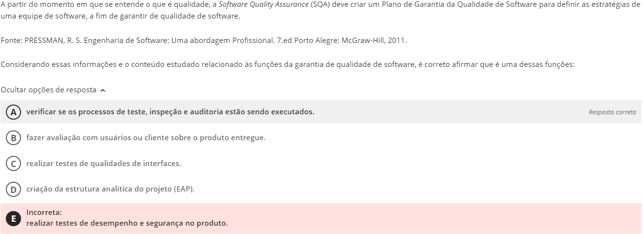 A partir do momento em que se entende o que é qualidade, a Software Quality Assurance (SQA) deve criar um Plano de Garantia da Qualidade de Software para definir as estratégias de uma equipe de software, a fim de garantir de qualidade de software. Fonte: PRESSMAN, R. S. Engenharia de Software: Uma abordagem 7.ed Porto Alegre: McGraw-Hill, 2011. Considerando essas informações e conteúdo estudado relacionado às funções da garantia de qualidade de software, é correto afirmar que é uma dessas funções: A verificar se os processos de teste, inspeção e auditoria estão sendo executados. B fazer avaliação com usuários ou cliente sobre O produto entregue. C realizar testes de qualidades de interfaces. D criação da estrutura analítica do projeto (EAP). E realizar testes de desempenho e segurança no produto.