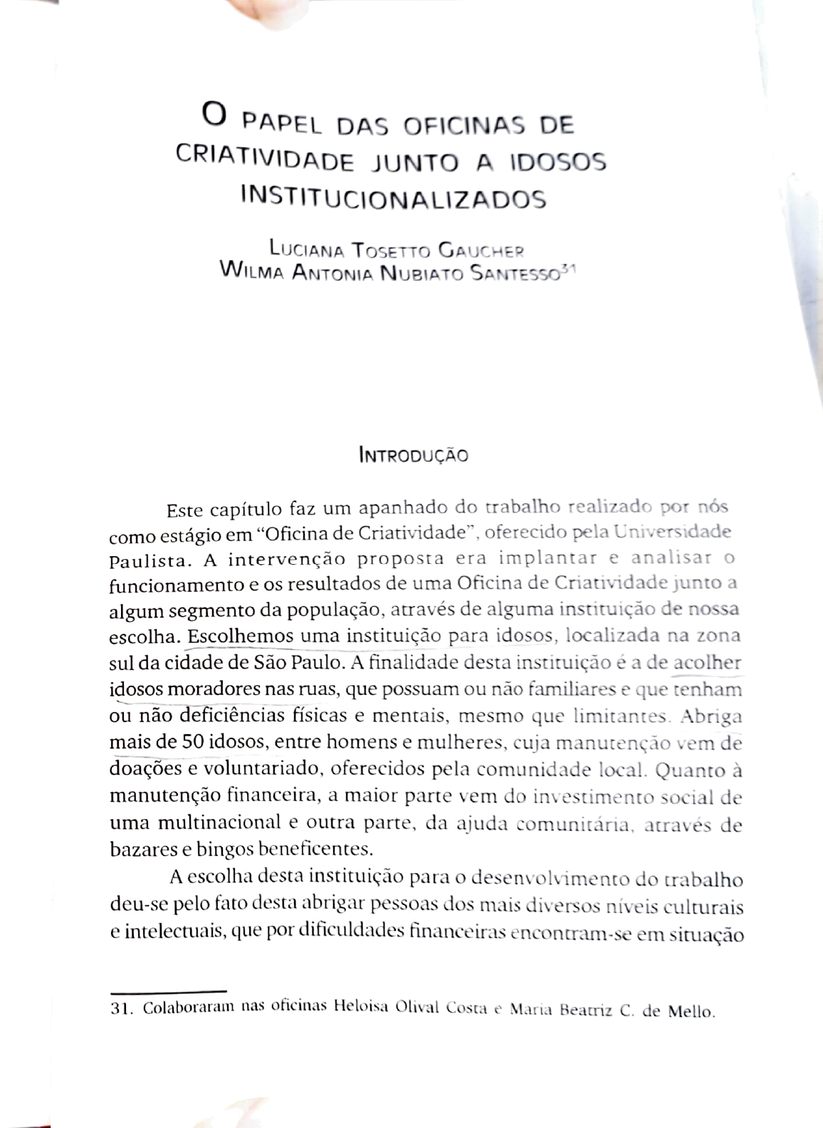 PAPEL DAS OFICINAS DE CRIATIVIDADE JUNTO A IDOSOS INSTITUCIONALIZADOS LuCIANA TosETTO GAUCHER WILMA ANTONIA NuBIATO SANTESSO INTRODUÇÃO Este capítulo faz um apanhado do trabalho realizado por nós como estágio em "Oficina de Criatividade", oferecido pela Universidade Paulista. A intervenção proposta era implantar e analisar o funcionamento e os resultados de uma Oficina de Criatividade junto a algum segmento da população, através de alguma instituição de nossa escolha. Escolhemos uma instituição para idosos, localizada na zona sul da cidade de São Paulo. A finalidade desta instituição é a de acolher idosos moradores nas ruas, que possuam ou não familiarese que tenham ou não deficiências fisicas e mentais, mesmo que limitantes. Abriga mais de 50 idosos, entre homens e mulheres, cuja manutenção vem de doações e voluntariado, oferecidos pela comunidade local. Quanto à manutenção financeira, a maior parte vem do investimento social de uma multinacional e outra parte, da ajuda comunitária, através de bazares e bingos beneficentes. A escolha desta instituição para o desenvolvimento do trabalho deu-se pelo fato desta abrigar pessoas dos mais diversos niveis culturais e intelectuais, que por dificuldades financeiras encontram-se em situação 31. Colaboraram nas oficinas Heloisa Olival Costa e Maria Beatriz C. de Mello. 218 ESPMÇOS DE CRIAÇAOEMPSICOLOGIA OFICINAS NA PRATICA de misériac abandono, de forma diferente de outuas instituiçocs para Tdosos que abriganm aqucles que têm condiçöes financeinas para residir DCm e tamilias que venham a seu cncontro quando nccessario. Nosso objetivo, ao clegermos a instituição para desenvolver a Oficina de Criatividade, foi o de buscar um entendimento sobre as questoes que envolvem o sofrimento para as pessoas que nao recebem 0 amparo de suas tamilias na fasc final da vida e necessitam de alguma forma de intervenção para que ultrapassem obstáculos e limites dessa etapa. Na instituição, os abrigados encontram-se em fase de inserção em um novo grupo onde todos são idosos, ex-desabrigados ou semi-abrigados, sem familiares que lhes dêem amparo e com as doenças físicas e mentais próprias do envelhecimento. A REALIDADE DO ENVELHECIMENTO Desde a Antigüidade se discute a respeito do envelhecer. Encontramos leituras sobre direitos dos idosos no Código de Hamurabi, em hieróglifos encontrads no Egito, e citaçoes na Biblia e no Cristianismo. Em cada cultura, época ou religião o envelhecimento é caracterizado de alguma forma. A velhice � uma categoria social. Cada sociedade vive de forma diferente o desgaste do ser humano. Atualmente a sociedade rejeita o idoso, não querendo continuar a sua obra, por considerar que ele já não é mais produtivo. O idoso detentor de propriedades é mais bem acolhido, pois seus bens o defendem de sua desvalorização como pessoa. Depois do desenvolvimento industrial e urbanístico desordenado, os anciãos foram relegados a situações de marginalização e de empobrecimento. Idosos são populações ou indivíduos que podem ser caracterizados pela duração do seu ciclo vital. Segundo as convenções sócio- demográficas atuais, idosos são pessoas com mais de sessenta anos, nos países em desenvolvimento, e de mais de sessenta e cinco, nos países desenvolvidos (Neri, 2001).O envelhecimento éo processo de mudanças genéticas para a espécie e para cada indivíduo, que se traduz na diminuição da plasticidade comportamental, aumento da vulnerabilidade, acumulação de perdas evolutivas e aumento da probabilidade de morte (Neri, 1995). Beauvoir (1976) o entende como CHRISTINA M. B.CUPERTINO (oRGANZADORA) 219 um lenoneno biológico com conseqiências psicológicas consideradas tipicas da rdade avançada, quc modifica a relação do homem n CSeu Tconecnto com o mundo c com sua própria nistor preterivel para o idoso ser independente no ponto de VIsta CconomiCo, pois iSso significa quc tem meios para viver dignamente Depender da lamilia o leva ao retraimento, pois esta vai d com pequcnas cquzantias em dinheiro quando se faz necessário, o que cercea sua autonomia. Muitos idosos só apresentam sua necessidade monetara quando se trata de problemas de saúde ou moradia, tendo vergonha de desejar comer melhor ou fazer uma viagem. Ficam na dependência da sensibilidade dos filhos. No Brasil, é caracteristica da relação dos adultos com os velhos a falta de reciprocidade, que se pode traduzir numa tolerância sem o calor da sinceridade (Bosi, 2003). Não se discute com o velho e nen se confronta suas opiniöes, negando-Ihe a oportunidade de desenvolver aquilo que só se permite aos amigos: a convivència com a alteridade,o enfrentamento e o conflito. Recentemente, certas áreas das ciências sociais despertaram para o estudo dessa temática. A sociologia do envelhecimento constituiu-se como campo específico de investigaçãoa partir do surgimento de um novo fenômeno: o rápido aumento da população de mais de 60 anos. A representação social do idoso conheceu uma série de modificações ao longo do tempo, uma vez que as mudanças sociais reclamavam políticas sociais para a velhice, que pressionaram a CTiaçao de categorias classificatórias adaptadas à nova condição moral e a uma construção ética do envellhecer, ou seja, conceder aos idosos condiçõese direitos para continuarem o restante da vida de forma digna e respeitosa. Em nosso pais, o interesse do Estado nas questões ligadas aos idosos caminha a passos lentos. Em 2003 foi criado o Estatuto do ldoso, que entende que o processo de envelhecimento diz respeito à sociedade, devendo ser objeto de conhecimento e intormação para todos asseverando que os idosos não devem sotrer nenhuma discriminação 220 ESPACOS DE CRIAÇÃO EM PSICOLOGIA OFICINAS NA PRÁTICA O iDOsO INSTITUCIONALIZADO Na Holanda do século XV surgiram as primeiras instituições oficiais para acolher idosos carentes ou enfermos e a Inglaterra foi o 