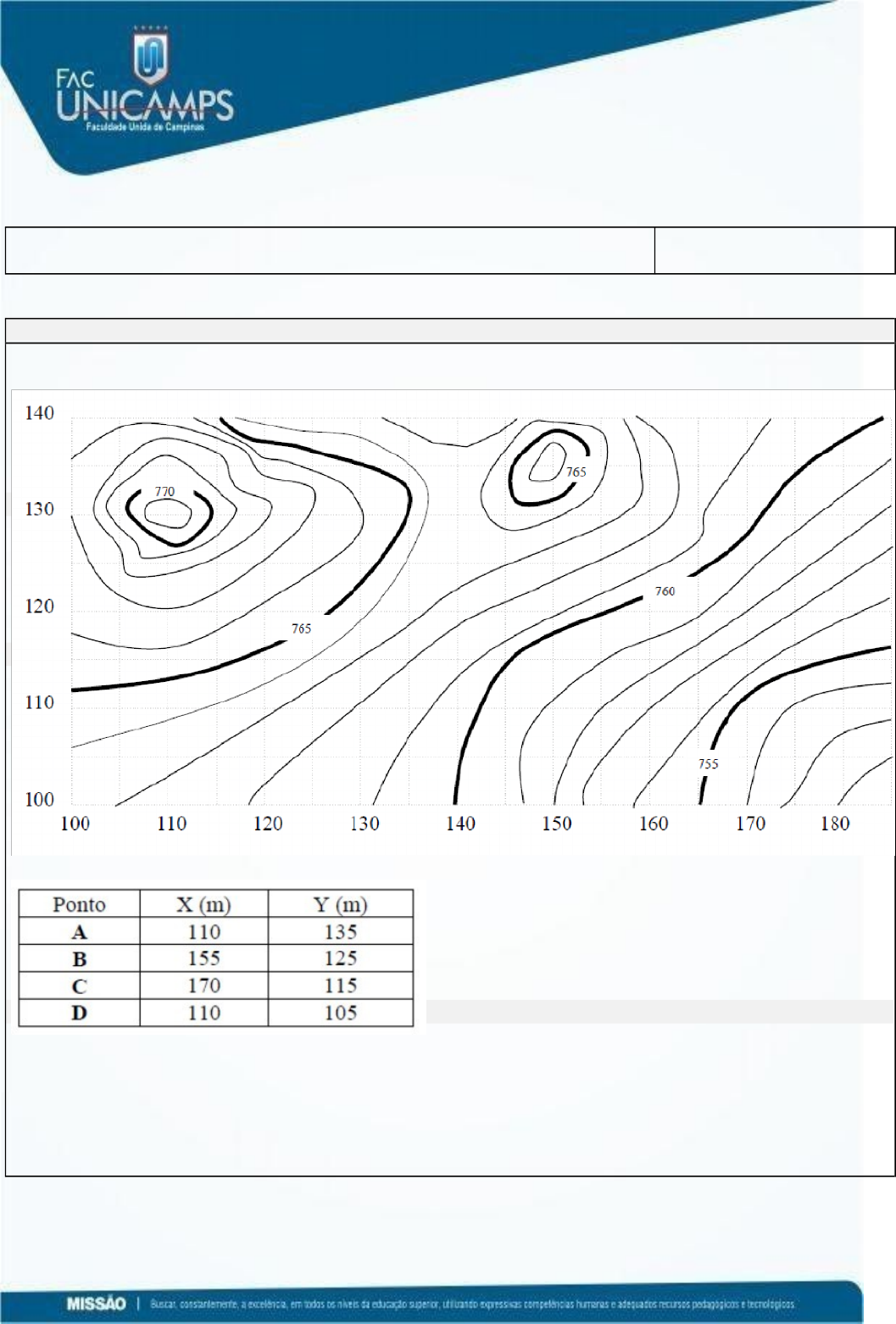 RESPOSTA D C D B A FACULDADE UNIDA DE CAMPINAS - FacUNICAMPS Recredenciada pela Portaria MEC nº 262 de 18/04/2016 Publicada no D.O.U em 19/04/2016 Atividade 01 – N1 . DISCIPLINA: Projeto e Construção de Estradas ALUNO: QUESTÃO 1 Dada a planta com curvas de nivel e os pontos A, B, C e D, pede - se: a) O espaçamento entre as curvas de nível (equidistância); R- 1 metro b) A cota dos pontos A, B, C e D; R- cota A-769, B-762, C-756, D-763 c) A distância AB; d) Traçar o perfil da estrada entre os pontos C e D. QUESTÃO 2 Calcular os comprimentos e os azimutes dos alinhamentos da figura abaixo. Calcular também os ângulos de deflexão. QUESTÃO 3 Calcular os comprimentos e os azimutes dos alinhamentos da figura abaixo. Calcular também os ângulos de deflexão. QUESTÃO 4 O azimute é o ângulo, no plano horizontal, de uma direção qualquer com o meridiano. O rumo de 74º30’ SE de uma visada a vante corresponde ao azimute de? we QUESTÃO 5 Nos projetos de estradas de rodagem, os perfis longitudinais são desempenhados em papel quadriculado ou milimetrado, em escalas horizontais (distâncias) e verticais (cotas), que normalmente guardam uma proporção de: a) 10:1 b)2:3 c)1:10 d)3:2 QUESTÃO 6 Na planta de um projeto, a indicação de escala 1:500 (horizontal) significa que 1 cm no desenho equivale, no terreno, a uma distância de: a) 50 m b) 5 m c) 0,5 m d) 0,05 m QUESTÃO 7 Numa rodovia de 3500 metros de comprimento, a numeração final da última estaca é? QUESTÃO 8 Calcular a distância de visibilidade de parada recomendada, numa estrada plana (i = 0,01 m/m), onde a velocidade diretriz é 120 km/h. QUESTÃO 9 Calcular a distância de visibilidade de parada excepcional, numa estrada plana (i = 0 m/m), onde a velocidade diretriz ou de projeto é 100 km/h.