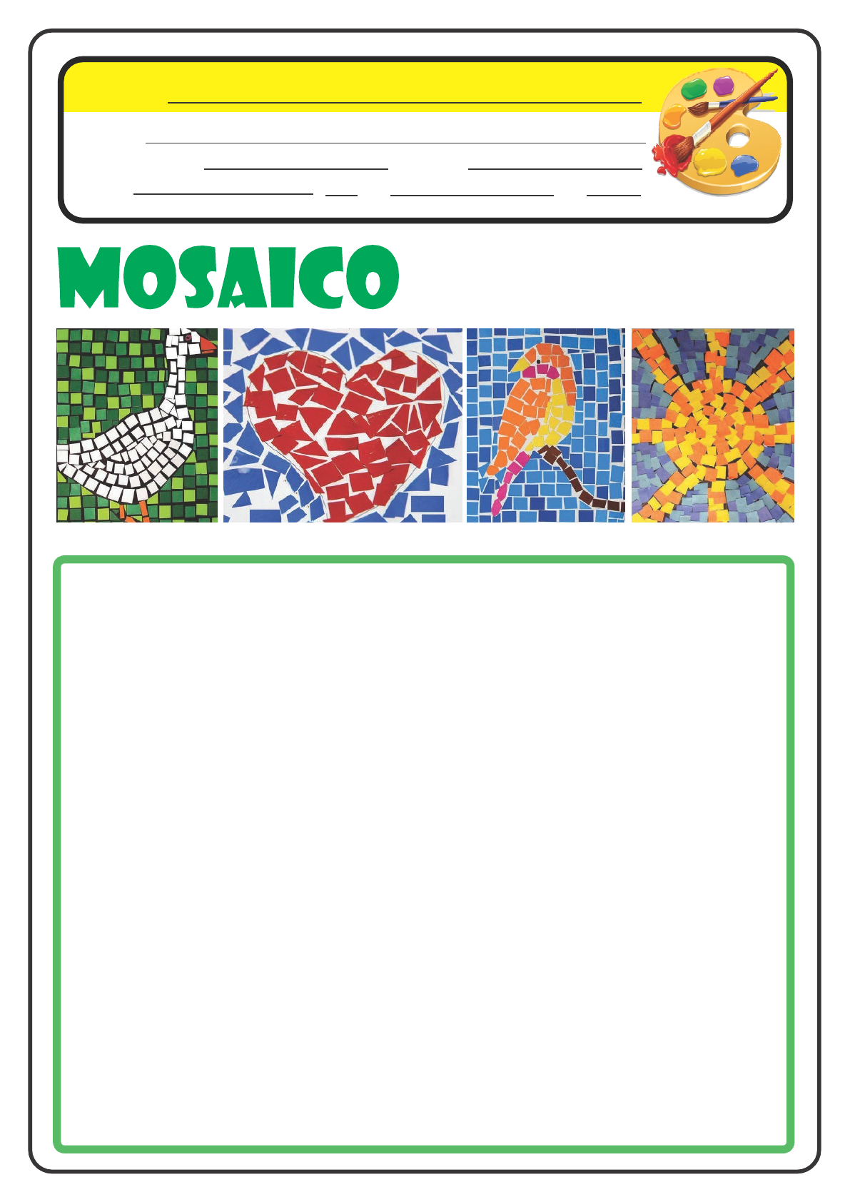 Escola: Nome: Professor (a): Data: , Turma: de de . (Município) (Dia) (Mês) (Ano) Aula de Arte Mosaico é uma técnica muito antiga, que envolve a montagem de pequenos pedaços de pedra ou de outros materiais, como: plástico, areia, papel ou conchas que formam um desenho. Faça um desenho no quadro abaixo e preencha-o com pequenos pedaços de papéis coloridos, formando um mosaico.
