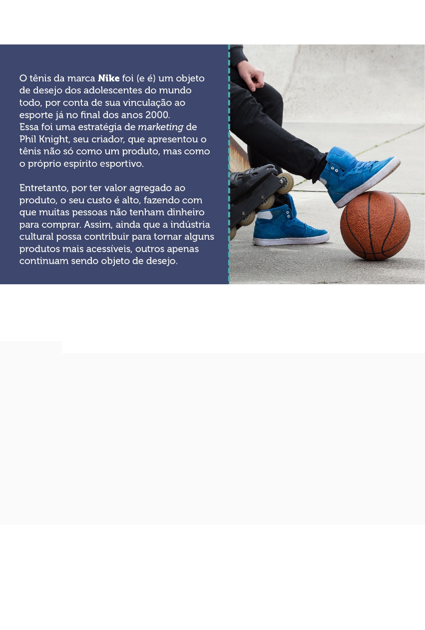 Desafio Veja a seguir o case da marca Nike: Faça uma reflexão crítica sobre as implicações da indústria cultural e o poder de compra dos adolescentes que desejam um produto como o tênis da marca Nike. Sua resposta A mídia contemporânea domina a vida das crianças em seu cotidiano e as influencia, incutindo o consumismo. Ocorre que a Indústria Cultural planeja seus conteúdos almejando as crianças e adolescentes como seu público alvo mais relevante, pois são os mais vulneráveis. Concomitantemente, destina seus produtos ao consumo em massa,visando o lucro nos produtos da indústria cultural os múltiplos níveis não são constituídos por significados intrínsecos aos requisitos formais da construção da obra, mas por níveis de efeitos, ou seja, de relações calculáveis entre determinados estímulos emitidos e as percepções ou condutas dos receptores. Não se trata, aqui, de mera 'manipulação'. Trata-se de uma modalidade específica de entidades simbólicas multidimensionais, produzidas e difundidas segundo critérios prioritariamente (mas não exclusivamente, embora no limite o sejam) administrativos, relativos ao controle sobre os efeitos no receptor e não segundo critérios prioritariamente estéticos, relativos às exigências formais intrínsecas à obra. Padrão de resposta esperado Com relação às implicações da indústria cultural e do poder de compra dos adolescentes, o desejo massificado por esse produto, que é de custo elevado, não é acessível a todo mundo. Tal fato pode até causar violência, pois os adolescentes poderiam ser motivados a furtos e a assaltos para conseguir esse produto. Assim, ainda que a indústria cultural consiga acessar mais públicos, nem todos poderão ter os produtos que são oferecidos.