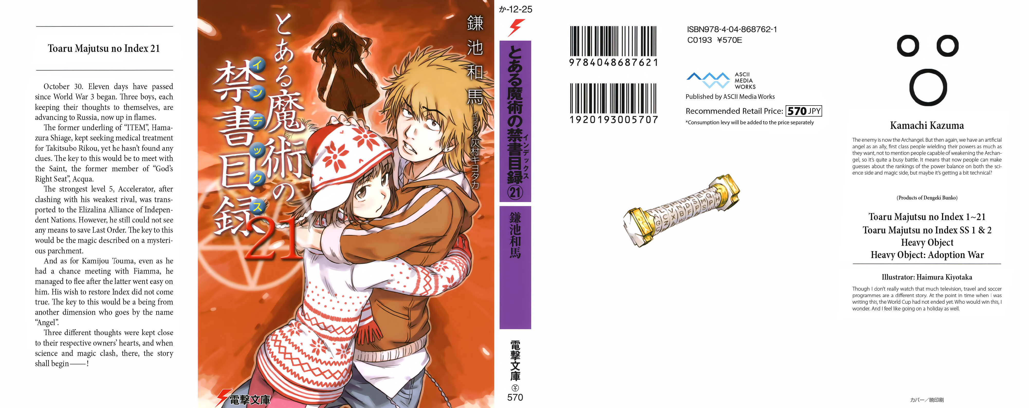 WAR REPORT World War III had finally begun. On a thin LCD TV, a female reporter holding a microphone and with a solemn expression on her face could be seen in the landscape of blowing snow and black smoke. “It has been 11 days since the war began. Even now on October 30th, there is no sign of the war weakening here near the border with the Elizalina Alliance of Independent Nations!! Wah! Was that an Academy City bomber!? As the Japanese government has repeatedly denied any intention to join in the war, Academy City must be carrying out this incident alone.” Not only the civilians were panicked. A female Russian air force pilot gritted her teeth in the battle above the Sea of Japan. “What do they mean they’re only putting in the minimum effort needed for a defensive line? This is enough firepower to turn all of Russia into a sea of flames 10 times over!!” “This is Kameyama Ryuuta from Academy City. I’ll shoot you down gently, so don’t worry, young lady. You can’t escape lasers that fly at the speed of light.” ♦ The spiky haired boy named Kamijou Touma and the magician girl named Lessar walked through the white land of Russia that was at the center of that war. “It’s Fiamma again. He’s started a war against Academy City from behind the Roman Catholic - Russian Orthodox alliance.” “Fiamma is a man of the magic side through and through, so I doubt his only goal is to gain control of the army. The timing of him obtaining the remote control spiritual item that gives him access to Index Librorum Prohibitorum’s 103,000 grimoires is also troubling.” “Either way, there’s only one thing I need to do: punch Fiamma and save Index.” ♦ 1 At the same time, Hamazura Shiage and Takitsubo Rikou drove through an area near the border of Russia and the Elizalina Alliance in a stolen car. “Either way, we can’t do this without that city’s tech. Defeating that city will not work as our goal.” “Hamazura, we need to find something to negotiate with in this war. Find a bottleneck in this fight between Academy City and Russia where you can affect the outcome with what you do. If you search there…” ♦ Inside a freight train rushing along a track running horizontally across Eurasia, Accelerator crouched down holding Last Order who had mostly lost consciousness. The appearance of the supernatural being known as Aiwass had put a great strain on the Misaka Network which had damaged the small girl. After defeating a group of powered suits that had attacked the train, Accelerator recalled Aiwass’s words upon checking the contents of a trunk the attackers had tried to steal. “Pieces of parchment, hm? Will they actually lead to a way to save this brat?” ♦ To crush Fiamma’s plan, Kamijou and Lessar came to the Elizalina Alliance in order to guard Sasha Kreutzev, the nun needed for that plan. However, Fiamma showed up and easily defeated the magicians known as Elizalina and Vento of the Front who happened to be there. He then stole Sasha and spoke to Kamijou as he left. “I look forward to seeing how the girl of the 103,000 grimoires chooses to punish you now that she knows everything.” ♦ When Takitsubo’s condition worsened, Hamazura was led to a town near the border of the Elizalina Alliance by a man named Digurv so that he could use the clinic. But that village was suddenly attacked by foreign privateers hired by the Russian army. “What do we do? No matter how far we run, it’s all over once they fire on us from the sky. We’ll all be killed!!” “We use the anti-aircraft gun. If we use the vehicle they left behind, we can fight back against the attack helicopters!!” ♦ 2 Accelerator and Last Order headed to a snowy plain near the remains of the Russian air force base where the parchment was supposed to be delivered. There, they were attacked by Academy City. The attacker was called Misaka Worst. She was a clone created in the Third Season project. “They must be disposed of. The unusable old series must all be killed. The Misakas of the new series will create a new network.” ♦ In a forest near the village, Hamazura sat dumbfounded within the half-destroyed anti- aircraft gun. The attack helicopter that had been flying through the air had been pierced through the side by a giant sword. A strong mercenary pulled the sword out of the exploding remains of the helicopter. “I, Acqua of the Back, will be presumptuous enough to lend you my help.” ♦ On a road from the Russian border to a town, Lessar gulped as she watched the battle between Kamijou Touma and Accelerator. Accelerator’s black wings divided countless times and attacked simultaneously from various angles. Kamijou used the fact that he could not use his right hand to negate all of them to instead “grab” the black wing and forcibly twist it. But… (Is that really enough to explain it?) ♦ The defeated Accelerator woke up within the Elizalina Alliance to find himself in the back of a truck. A small memo had been left next to Last Order who lay next to him. Written there in messy handwriting was… “Index Librorum Prohibitorum…” ♦ And the war continued to involve more and more people as it spontaneously continued on. 3 Bewilderment colored the transmissions between the two fighter pilots battling above the Sea of Japan. “The Kremlin Report…?” “It’s a manual for defending the nuclear launch facilities using a bacterial wall. A killer virus kills only the people and leaves the facility undamaged. It seems the Russian military is already discussing using it since they feel as if they are losing. And no evacuation warning will be sent to the people living nearby.” ♦ The Roman pope who was sleeping within a hospital in Italy’s capital slowly awoke. As he opened the window in the hospital room and prepared to leave through it, he magically communicated with the Russian Orthodox magician known as Vasilisa. “I’m sure I have already lost my authority. M