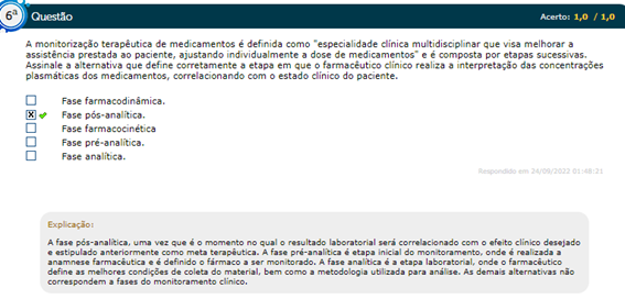 A monitorização de medicamentos é definida como "especialidade clínica multidisciplinar que visa melhorar a assistência prestada ao paciente, ajustando individualmente a dose de e é composta por etapas. Assinale a alternativa que define corretamente a etapa em que realiza a interpretação das concentrações plasmáticas dos medicamentos, correlacionando com estado clínico do paciente. A fase farmacocinética é o momento no qual resultado laboratorial será correlacionado com efeito clínico desejado e estipulado anteriormente como meta. A fase pré-analítica é a etapa inicial onde é realizada a anamnese e definido o que será monitorado. A fase analítica é a etapa onde o farmacêutico define as melhores condições de coleta do material, bem como a metodologia utilizada para análise.