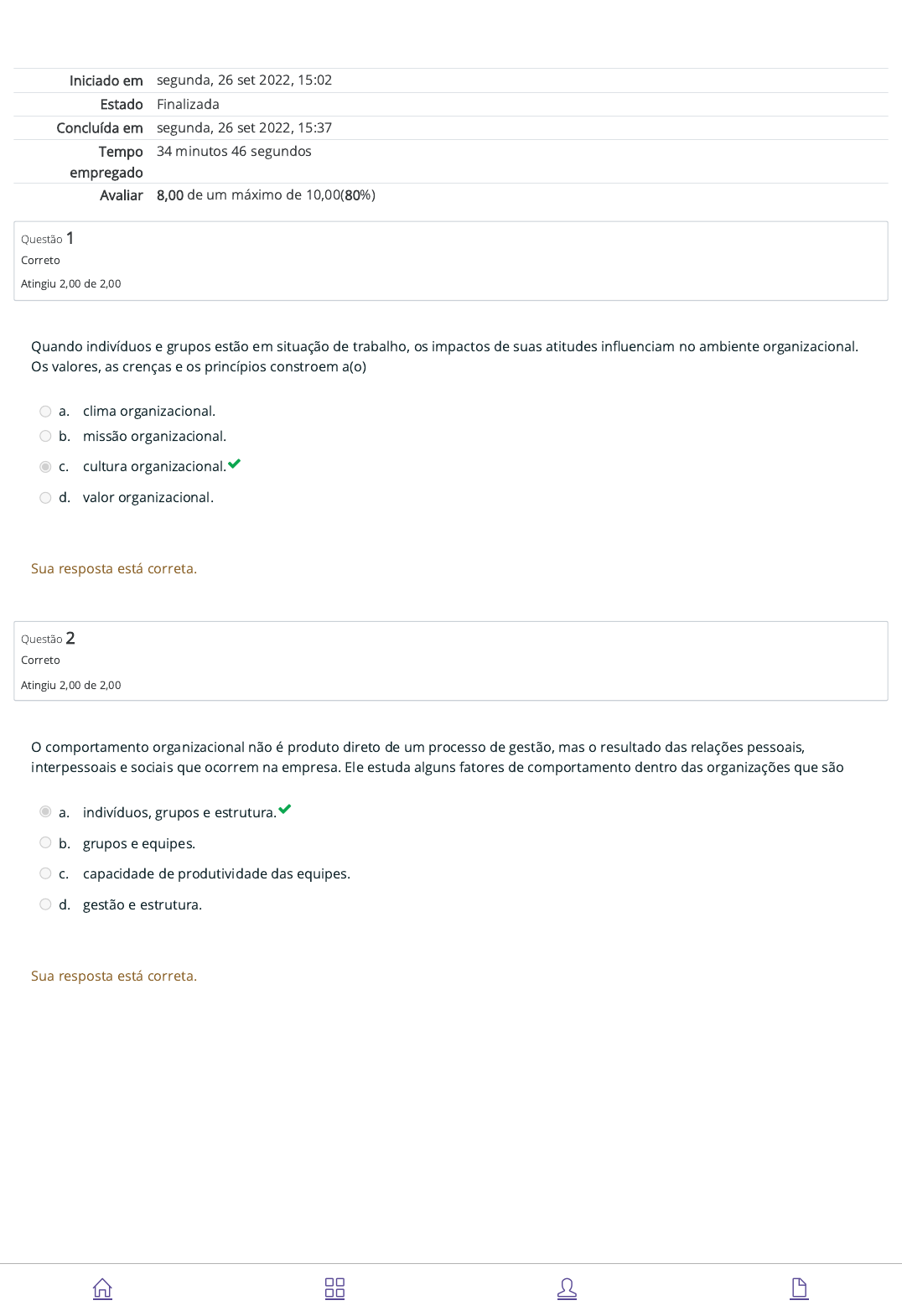 Iniciado em segunda, 26 set 2022, 15:02 Estado Finalizada Concluída em segunda, 26 set 2022, 15:37 Tempo empregado 34 minutos 46 segundos Avaliar 8,00 de um máximo de 10,00(80%) Questão 1 Correto Atingiu 2,00 de 2,00 Questão 2 Correto Atingiu 2,00 de 2,00 Quando indivíduos e grupos estão em situação de trabalho, os impactos de suas atitudes in�uenciam no ambiente organizacional. Os valores, as crenças e os princípios constroem a(o) a. clima organizacional. b. missão organizacional. c. cultura organizacional. d. valor organizacional. Sua resposta está correta. O comportamento organizacional não é produto direto de um processo de gestão, mas o resultado das relações pessoais, interpessoais e sociais que ocorrem na empresa. Ele estuda alguns fatores de comportamento dentro das organizações que são a. indivíduos, grupos e estrutura. b. grupos e equipes. c. capacidade de produtividade das equipes. d. gestão e estrutura. Sua resposta está correta. https://eskadauema.com/my https://eskadauema.com/index.php?redirect=0 https://eskadauema.com/user/edit.php?id= https://eskadauema.com/theme/olm/certificates.php Questão 3 Incorreto Atingiu 0,00 de 2,00 Questão 4 Correto Atingiu 2,00 de 2,00 Julgue as a�rmações a seguir e assinale V para Verdadeiro ou F para Falso. Pelos ensinamentos de Chiavenato, Administração de Recursos Humanos (2009, p.107), o estudo das pessoas inseridas numa Organização tem as seguintes alternativas: ( ) Considerar as pessoas como recursos (dotadas de características próprias, de personalidade e individualidade, aspirações, valores, atitudes, motivações e objetivos individuais) ou, considerar as pessoas como pessoas (dotadas de habilidades, capacidades, destrezas, conhecimentos e competências necessárias para a tarefa organizacional). ( ) Considerar as pessoas como pessoas (dotadas de características próprias, de personalidade e individualidade, aspirações, valores, atitudes, motivações e objetivos individuais) ou, considerar as pessoas como recursos (dotadas de habilidades, capacidades, destrezas, conhecimentos e competências necessárias para a tarefa organizacional). Assinale a opção correta. a. V, V. b. F, F. c. V, F. d. F, V. Sua resposta está incorreta. Chiavenato (2009, p.110) chama à atenção para o comportamento humano, limitando-os a dois grupos de fatores: FATORES EXTERNOS e FATORES INTERNOS. Sobre os fatores internos podemos citar: a. grau de con�ança, clima, motivação e cultura. b. recompensas, valores, grau de con�ança e motivação. c. percepção, aprendizagem, valores e cultura. d. personalidade, motivação, percepção, aprendizagem e valores. Sua resposta está correta. https://eskadauema.com/my https://eskadauema.com/index.php?redirect=0 https://eskadauema.com/user/edit.php?id= https://eskadauema.com/theme/olm/certificates.php Questão 5 Correto Atingiu 2,00 de 2,00 Termos de uso Política de privacidade As pessoas não são capazes de se comportar de todas as formas, suas características pessoais são limitadas e restritas. Como somos todos, individualmente diferentes, os comportamentos variam de pessoas para pessoa. A capacidade de resposta depende das características inatas e de aprendizagem. Essa é uma característica comportamental de�nida como a. proativo. b. social. c. limitada capacidade de resposta. d. diferentes necessidades. Sua resposta está correta. https://eskadauema.com/admin/tool/policy/view.php?policyid=1&versionid=3 https://eskadauema.com/admin/tool/policy/view.php?policyid=2&versionid=2 https://eskadauema.com/my https://eskadauema.com/index.php?redirect=0 https://eskadauema.com/user/edit.php?id= https://eskadauema.com/theme/olm/certificates.php
