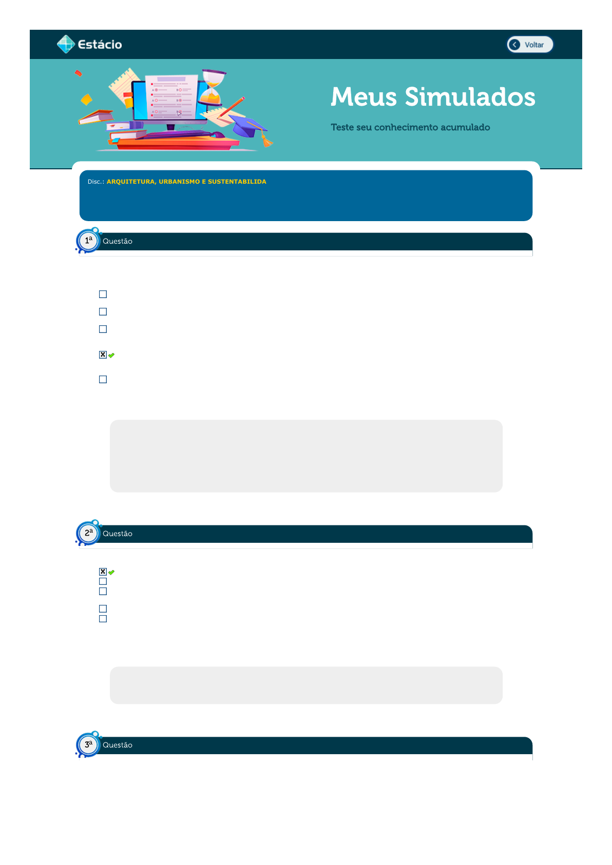 27/09/2022 08:45 Estácio: Alunos https://simulado.estacio.br/alunos/ 1/5 Meus Simulados Teste seu conhecimento acumulado Disc.: ARQUITETURA, URBANISMO E SUSTENTABILIDADE Acertos: 8,0 de 10,0 26/09/2022 Acerto: 1,0 / 1,0 A Agenda 21 Brasileira é um processo e instrumento de planejamento participativo para o desenvolvimento sustentável e que tem como eixo central a sustentabilidade, compatibilizando a conservação ambiental, a justiça social e o crescimento econômico. Em síntese a Agenda 21 Brasileira é compõe-se de três documentos em que são estabelecidas metas de curto, médio e longo prazo para a ampliação do papel do Brasil na divulgação de ações e práticas de sustentabilidade. compõe-se de dois documentos elaborados exclusivamente por instituições de pesquisa sobre o sistema urbano brasileiro e suas perspectivas de crescimento. compõe-se de dois documentos: Agenda 21 Brasileira - Ações Prioritárias, na qual são sugeridos parâmetros para a construção da sustentabilidade brasileira; e Agenda 21 Brasileira - Resultado da Consulta Nacional, que consiste no produto das discussões realizadas em todo território nacional. compõe-se de dois documentos: Agenda 21 Brasileira - Ações Prioritárias, na qual são estabelecidos parâmetros para o sistema urbano no Brasil; e Agenda 21 Brasileira - Resultado da Consulta Internacional, na qual é discutido o papel do Brasil no mundo. compõe-se de um único documento universal. Respondido em 27/09/2022 08:32:12 Explicação: A Agenda 21 Brasileira resulta da composição de dois documentos distintos: Agenda 21 Brasileira - Ações Prioritárias, que estabelece os caminhos preferenciais da construção da sustentabilidade brasileira, e Agenda 21 Brasileira - Resultado da Consulta Nacional. No primeiro, a Comissão de Políticas de Desenvolvimento Sustentável e da Agenda 21 Nacional - CPDS enumera os desafios emergenciais a serem enfrentados pela sociedade brasileira, rumo a um novo desenvolvimento. O Resultado da Consulta Nacional, por sua vez, é produto das discussões realizadas em todo o território nacional sobre a construção da Agenda 21 Brasileira, importante passo para a consolidação de um projeto de desenvolvimento sustentável para o Brasil. Acerto: 1,0 / 1,0 A problemática urbana foi abordada no Relatório Brundtland dando destaque a alguns temas, exceto: Legalização dos assentamentos informais nas grandes cidades melhorando a qualidade de vida das pessoas. Incoerência entre a limitação de recursos energéticos com as matrizes de transporte urbano adotadas. Poluição e contaminação ocasionadas pelas atividades humanas, relacionadas principalmente ao uso do automóvel e a queima de combustíveis fosseis. Destruição do habitat e das paisagens naturais ocasionadas pela expansão urbana. Especulação imobiliária ocasionando perdas e desperdícios pela substituição do espaço edificado, muitas vezes em condições de habitabilidade. Respondido em 27/09/2022 08:33:10 Explicação: O Relatório Brundtland enfatiza que deve haver opções legais de terrenos, mais bem situados, e com melhor disponibilidade de serviços e infraestrutura, para os lotes em terrenos ilegais. Acerto: 1,0 / 1,0 Considere o contexto a seguir para estabelecer a afirmativa falsa. Segundo o Relatório Brundtland (ONU; COMISSÃO BRUNDTLAND, 1987), os governos, por meio de suas políticas, deverão encontrar maneiras de desacelerar as atuais taxas de urbanização observadas nas grandes cidades. Atualmente, em especial no Terceiro Mundo, os governos das grandes cidades não têm condições de suprir as necessidades básicas de moradia e toda a infraestrutura necessária, para as pessoas que nelas chegam diariamente, atraídas por melhores perspectivas de trabalho. Além de não atender às necessidades básicas das populações e de gerar riscos a sua saúde, a expansão física descontrolada das cidades implica ainda em importantes repercussões para a economia e para o meio ambiente, tornando-os muito complexos e difíceis de serem atendidos, tais como: Questão1 a Questão2 a Questão3 a Aluno(a): https://simulado.estacio.br/alunos/inicio.asp javascript:voltar(); 27/09/2022 08:45 Estácio: Alunos https://simulado.estacio.br/alunos/ 2/5 Abastecimento de água. Paisagens naturais e o meio rural que circundam as cidades. Aplicações orçamentárias coerentes. Suprimento de vias e meios de transportes e demais serviços públicos. Esgotamento sanitário. Respondido em 27/09/2022 08:36:09 Explicação: Segundo o Relatório Brundtland (ONU; COMISSÃO BRUNDTLAND, 1987), os governos, por meio de suas políticas, deverão encontrar maneiras de desacelerar as atuais taxas de urbanização observadas nas grandes cidades. Atualmente, em especial no Terceiro Mundo, os governos das grandes cidades não têm condições de suprir as necessidades básicas de moradia e toda a infraestrutura necessária, para as pessoas que nelas chegam diariamente, atraídas por melhores perspectivas de trabalho. Além de não atender às necessidades básicas das populações e de gerar riscos a sua saúde, a expansão física descontrolada das cidades implica ainda em importantes repercussões para a economia e para o meio ambiente, tornando-os muito complexos e difíceis de serem atendidos, tais como:abastecimento de água, esgotamento sanitário, suprimento de vias e meios de transportes e demais serviços públicos, paisagens naturais e o meio rural que circundam as cidades. Acerto: 0,0 / 1,0 Tomando por base o contexto a seguir assinale a afirmativa corerta. O processo de transição das corporações para a adoção de uma postura socioambiental responsável manifestou-se a partir do desejo de fortalecimento da marca, da imagem, da necessidade de fidelizar os clientes, de atrair investidores e até mesmo de obter concessões de dedução fiscais. (MELO NETO e FRÓES, 1999). Com a emergência de distintos paradigmas mercadológicos, se torna necess