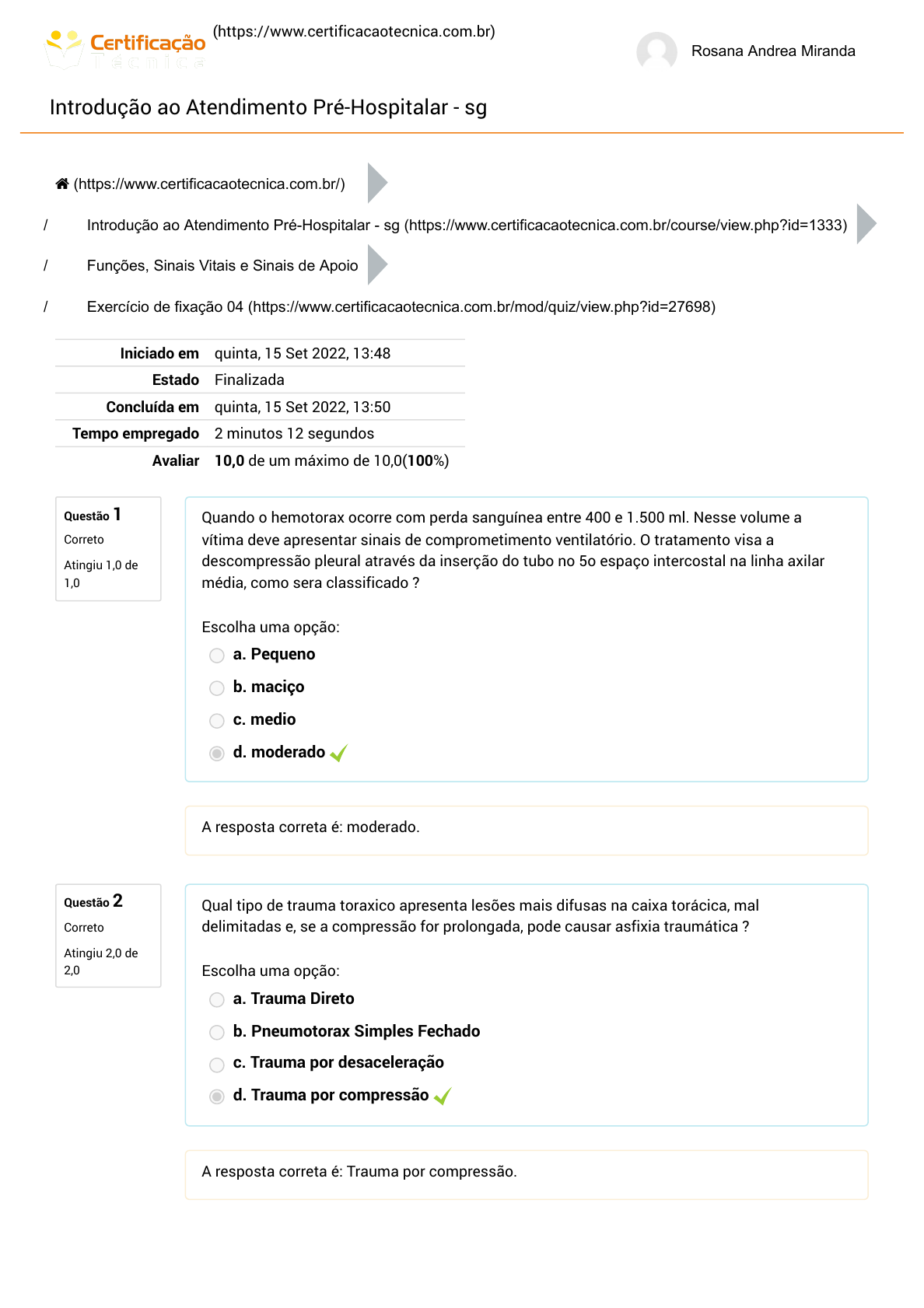 (https://www.certificacaotecnica.com.br) Rosana Andrea Miranda Introdução ao Atendimento Pré-Hospitalar - sg Questão 1 Correto Atingiu 1,0 de 1,0 Questão 2 Correto Atingiu 2,0 de 2,0 / / / Iniciado em quinta, 15 Set 2022, 13:48 Estado Finalizada Concluída em quinta, 15 Set 2022, 13:50 Tempo empregado 2 minutos 12 segundos Avaliar 10,0 de um máximo de 10,0(100%) Quando o hemotorax ocorre com perda sanguínea entre 400 e 1.500 ml. Nesse volume a vítima deve apresentar sinais de comprometimento ventilatório. O tratamento visa a descompressão pleural através da inserção do tubo no 5o espaço intercostal na linha axilar média, como sera classificado ? Escolha uma opção: a. Pequeno b. maciço c. medio d. moderado A resposta correta é: moderado. Qual tipo de trauma toraxico apresenta lesões mais difusas na caixa torácica, mal delimitadas e, se a compressão for prolongada, pode causar asfixia traumática ? Escolha uma opção: a. Trauma Direto b. Pneumotorax Simples Fechado c. Trauma por desaceleração d. Trauma por compressão A resposta correta é: Trauma por compressão. (https://www.certificacaotecnica.com.br/) Introdução ao Atendimento Pré-Hospitalar - sg (https://www.certificacaotecnica.com.br/course/view.php?id=1333) Funções, Sinais Vitais e Sinais de Apoio Exercício de fixação 04 (https://www.certificacaotecnica.com.br/mod/quiz/view.php?id=27698) https://www.certificacaotecnica.com.br/ https://www.certificacaotecnica.com.br/ https://www.certificacaotecnica.com.br/course/view.php?id=1333 https://www.certificacaotecnica.com.br/mod/quiz/view.php?id=27698 Questão 3 Correto Atingiu 1,0 de 1,0 Questão 4 Correto Atingiu 1,0 de 1,0 Questão 5 Correto Atingiu 1,0 de 1,0 Qual a divisão da medula espinhal em um ser humano ? Escolha uma opção: a. 7 cervicais, 12 torácicas, 5 lombares, 5 sacrais e 4 coccígeas b. 7 cervicais, 10 torácicas, 7 lombares, 4 sacrais e 5 coccígeas c. 8 cervicais, 12 torácicos, 5 lombares, 5 sacrais e 1 coccígeo d. 10 cervicais, 10 torácicos, 4 lombares, 5 sacrais e 2 coccígeo A resposta correta é: 8 cervicais, 12 torácicos, 5 lombares, 5 sacrais e 1 coccígeo. Quando o hemotorax ocorre com perda sanguínea de aproximadamente 1.500 a 2.000 ml, causando choque hipovolêmico. O tratamento imediato é a descompressão torácica. No intra-hospitalar, na perda de sangue acima de 1.500 ml está indicada a autotransfusão, como sera classificado ? Escolha uma opção: a. Pequeno b. medio c. maciço d. moderado A resposta correta é: maciço. Como é chamado o rápido acúmulo de sangue no espaço pleural produzido por laceração das veias inter- costais ou artéria mamária interna ? Escolha uma opção: a. Tamponamento Cardiaco b. Pneumotorax c. Trauma direto d. Hemotorax A resposta correta é: Hemotorax. Questão 6 Correto Atingiu 2,0 de 2,0 Questão 7 Correto Atingiu 2,0 de 2,0 Qual tipo de trauma toraxico ocorre quando há um vazamento de ar para o espaço pleural por um sistema de válvula de mão única (pressão positiva). O sistema de válvula faz com que o ar entre para a cavidade torácica sem a possibilidade de sair, permitindo que a pressão nessa cavidade torne-se cada vez mais positiva em relação à atmosfera, produzindo o colapso do tecido pulmonar ? Escolha uma opção: a. Pneumotorax Simples Fechado b. Pneumotorax hipertensivo c. Trauma direto d. Pneumotorax Simples Aberto A resposta correta é: Pneumotorax hipertensivo. Qual tipo de trauma toraxico tem seu diagnóstico dado pela hipersonoridade à percussão e diminuição ou ausência de murmúrio vesicular ? Escolha uma opção: a. Pneumotorax Simples Fechado b. Trauma por compressão c. Trauma Direto d. Trauma por desaceleração A resposta correta é: Pneumotorax Simples Fechado.