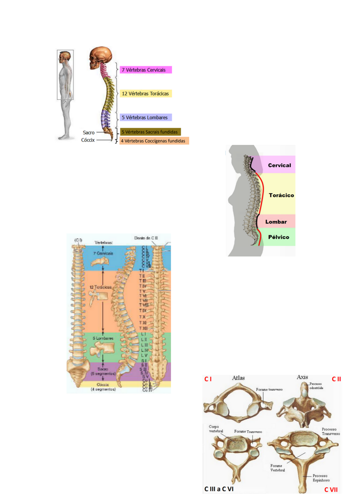 Coluna Vertebral e Osso Hióide Coluna Vertebral: Formada por 33 vértebras • Está em posição posterior no corpo e na linha média. • Dividida em 4 regiões: Cervical Torácica Lombar Pélvica (Sacral) • Curvaturas primárias: côncava anteriormente - regiões torácica e sacral. • Curvaturas secundárias: côncavas posteriormente - regiões cervical e lombar e trazem o centro de gravidade para uma linha vertical, o que permite que o peso do corpo esteja distribuído na coluna vertebral de um modo que se gaste o mínimo de energia muscular para manter um posicionamento bípede ereto. • As vértebras tornam-se maiores gradualmente até o sacro, e depois tornam-se progressivamente menores em direção ao ápice do cóccix. • Mudança de tamanho: à medida que se desce a coluna vertebral, as vértebras suportam cada vez mais peso corporal, atingindo o tamanho máximo mediatamente acima do sacro, que transfere o peso para o cíngulo do membro inferior nas articulações sacroilíacas. As vértebras cervicais se apresentam em 4 formatos: sendo vértebras atípicas as C I, C II e C VII e típicas de C III a C VI. VÉRTEBRAS CERVICAIS TÍPICAS (C III a C VI) Características: • corpos pequenos; • processos espinhosos bífidos; • processos transversos que contêm um forame (forame transverso). C l e C II são modificadas para movimentar a cabeça Características Vertebras Cervicais Típicas (C III a C VI) VÉRTEBRAS TORÁXICAS Nelas se fixam as costelas. Principal característica: fóveas costais para articulação com as costelas. Características: • corpos maior e em formato de coração; • fóveas costais; • forame vertebral menor. Características Vértebras Toráxicas Típicas (T II a T VIII) As vértebras toráxicas atípicas: T I, T IX a T XII Características: • T I – assemelha-se a uma vértebra cervical, tem um processo espinhoso longo, quase horizontal; • T IX a T XII - têm algumas características das vértebras lombares. VÉRTEBRAS LOMBARES Características: • corpos grandes (o peso aumenta em direção à extremidade inferior da coluna vertebral); • processos articulares estendem - se verticalmente; • presença de processo acessório; • forame vertebral triangular Caracteristicas Vertebras Lombares Sacro • Formado por 5 vértebras sacrais fundidas; • Formato triangular. CÓCCIX • Formado por 4 vértebras coccígenas fundidas; • Pequeno osso triangular. HIÓIDE É um osso que não se articula com nenhum outro, é móvel e suspenso, situado na parte anterior do pescoço, no nível da vértebra C III, no ângulo entre a mandíbula e a cartilagem tireóidea. Tem um corpo e cornos maior e menor. As funções do sistema estomatognático(sucção,mastig ação,deglutição,fonoarticulação e respiração) têm como característica a participação da mandíbula e de todo complexo cabeça/pescoço. EQUILÍBIO E SINERGISMO garantem o bom funcionamento. • O hióide, entre outras coisas, dá toda a sustentação física para que a região laringofaríngica possa sustentar-se e com isso as pregas vocais possam exercer suas funções vibratórias; ao mesmo tempo a língua, ancorada pela sua musculatura extrínseca pode realizar os inúmeros movimentos auxiliares na fonoarticulação. • Quando mastigamos, durante os movimentos de abertura e fechamento, de lateralidades direita e esquerda, os movimentos mandibulares necessitam enormemente da ancoragem hióidea, principalmentecom a ação dos grupos supra e infra-hióideos. • Quando deglutimos é o osso hióide quem dá ancoragem à língua para que ela se posicione mais para posterior e superior, levando o bolo alimentar para a região orofaríngica. • O hióide é o único osso participante do complexo laríngeo, local de passagem constante de ar, alimento vital ao ser humano. • A postura craniocervical pode interferir diretamente na posição da mandíbula e do osso hióide e consequentemente na realização das funções de mastigação e deglutição. • Uma mudança na posição da cabeça provocada pela contração dos músculos cervicais muda, consequentemente, a posição mandibular. • Essas mudanças afetam também a oclusão e os músculos mastigatórios. • Quando ocorre uma alteração postural, por exemplo, anteriorização da cabeça, simultaneamente o paciente apresentará tensão em ambas as cadeias musculares, em especial no músculo esternocleidomastoídeo e também nos grupos musculares supra e infra-hióideos, que terão seus comprimentos de EQUILÍBRIO e SINERGISMO alterados em consequência da alteração do osso hióide.