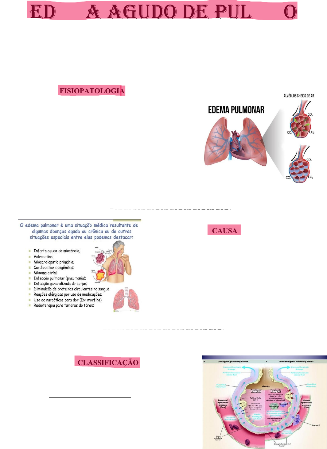 EDEMA AGUDO DE PULMÃO Edema pulmonar é o nome que se dá ao acúmulo de líquido nos alvéolos e interstícios pulmonares, condição que afeta diretamente o processo de oxigenação do sangue indispensável à vida. Na maior parte das vezes, ele surge como consequência do extravasamento dos fluidos contidos nos vasos capilares, fluido que se deposita nos interstícios pulmonares (espaço entre os alvéolos) onde se dá a troca gasosa, dificultando a respiração. FISIOPATOLOGIA Há um desequilíbrio nas forças das trocas de fluidos intravasculares e intersticiais ou uma ruptura de membrana alvéolo-capilar; independentemente disso, uma vez que um alvéolo é inundado haverá algum grau de ruptura e a sequência pode ser dividida em três estágios: 1- Elevação do fluxo de líquidos dos capilares para o interstício; 2- o volume que e filtrado pelos capilares ultrapassa a capacidade de drenagem linfática; 3 – Aumento adicionais do volume no interstício terminam por distender os septos interalveolares. CAUSAS • Insuficiência Cardíaca; • Infarto Agudo do Miocárdio; • Crise Hipertensiva; • Doenças Valvares; • Insuficiência Renal; • Infecções; • Altitudes Elevadas; • Drogas e Medicamentos CLASSIFICAÇÃO • Edema cardiogênico: pacientes que costumam ter história de cardiopatia ou hipertensão; • Edema não cardiogênico: pacientes podem apresentar condições preexistentes que aumentam o risco de infecção. https://drauziovarella.uol.com.br/corpo-humano/alveolo-pulmonar/ SINAIS E SINTOMAS • Tosse seca ou produtiva; • Ortopneia; • Fadiga; • Dispneia paroxística noturna • Edema de MMII; • Cianose de extremidades; • Estertores crepitantes; • Diminuição da ausculta; • Sibilos. TRATAMENTO • De imediato fornecer O2 pois paciente chega com hipoxemia; • Casos graves necessita de ser intubado; • Medicamentos diuréticos e vasodilatadores (se paciente urine); • Hemodiálise urgente (não urine). DERRAME PREURAL X EDEMA AGUDO PULMONAR 1. DERRAME PLEURAL: é caracterizado pelo acúmulo de liquido entre as pleuras 2. EDEMA AGUDO PULMONAR: é o acúmulo de liquido dentro dos pulmões. REFERÊNCIAS MENEZES, Joanna D’arc. O que é edema agudo de pulmão? 2020. Disponível em http://www.sanarmed.com/o-que-e-edema- agudo-de-pulmão-colunistas . Acesso em: 03 de setembro 2022. PINHEIRO, Dr. Pedro. Edema pulmonar: sintomas, causas e tratamento. 2022. Disponível em https://www.mdsaude.com/pneumologia/edema-pulmonar-agudo/. Acesso em 3 de setembro de 2022. DANESI, Giuliano Machado; et al. "Edema agudo de pulmão." Acta Méd.: Porto Alegre,2016. 6-6. KACMAREK, Robert M.; WILKINS, Robert L.; STOLLER, James K.. Egan, fundamentos da terapia respiratória. 9. ed. Rio de Janeiro: Elsevier, 2009. v. 2. http://www.sanarmed.com/o-que-e-edema-agudo-de-pulmão-colunistas http://www.sanarmed.com/o-que-e-edema-agudo-de-pulmão-colunistas https://www.mdsaude.com/pneumologia/edema-pulmonar-agudo/