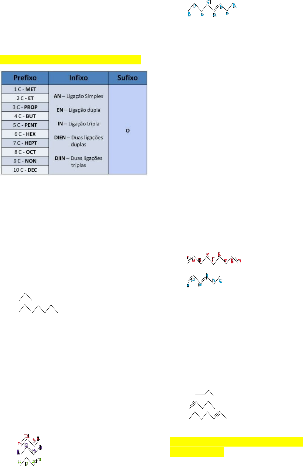Hidrocarbonetos são compostos orgânicos formados apenas por átomos de Hidrogênio e Carbono em sua molécula. Nomenclatura dos Hidrocarbonetos Acíclicos: · Alcanos (ou parafinas): são hidrocarbonetos alifáticos saturados (cadeia aberta somente com simples ligações); o termo “parafina” vem do latim, paraum = pequena + affinis = afinidade; e significa que são pouco reativas. Exemplos: 1. CH4 = met+an+o = metano 2. H3C – CH3 = et + an + o = etano 3. = but + an + o = butano 4. = hept + an + o = heptano · Alcenos (alquenos ou olefinas): são hidrocarbonetos alifáticos insaturados (cadeia aberta com uma dupla ligação); o termo “olefina” vem do latim, oleum = óleo + affinis = afinidade, pois eles originam substâncias com aspecto oleoso. Exemplos: 1. H2C ═ CH2 = et + en + o = eteno 2. = but + 1 + en + o = but-1-eno 3. = but + 2 + en + o = but-2-eno 4. = but + 1 + en + o = but-1-eno 5. = oct + 3 + en + o = oct-3-eno No caso dos exemplos 2,3, e 4, temos a mesma estrutura, mas com a ligação em local diferente, logo, são compostos diferentes. Já no exemplo 5, para sabermos a posição da ligação, temos que enumerar a cadeia carbônica a partir da extremidade mais próxima em que se encontra a ligação. Dessa forma, onde tiver o posicionamento da dupla ligação, colocamos após o prefixo. · Alcadienos: são hidrocarbonetos alifáticos que possuem duas duplas ligações entre os carbonos. Exemplos: 1. H2C ═ C ═ CH2 = propa+dien+o = propadieno (não precisa enumerar porque é o menor alcadieno possível, visto que há apenas 3 átomos de carbono e é obrigatório ter duas duplas ligações). 2. = non+1,8+dien+o = non-1,8-dieno 3. = hexa+1,3+dien+o = hexa-1,3-dieno · Alcinos (ou acetilênicos): são hidrocarbonetos alifáticos que possuem uma ligação tripla entre os carbonos. Exemplos: 1. HC ≡ CH = et+in+o = etino 2. ≡ = pent+1+in+o = pent-1-ino 3. = pent+1+in+o = pent-1-ino 4. = hept+2+in+o = hept-2-ino Nomenclatura dos hidrocarbonetos cíclicos (cadeia fechada): Esse tipo de hidrocarboneto possui antes do sufixo a palavra “ciclo”. · Cicloalcanos (ciclanos): hidrocarboneto de cadeia fechada com ligações simples. Exemplos: 1. = ciclo + but+an+o = cliclobutano 2. = ciclo + pent+an + o = ciclopentano · Cicloalcenos (ciclenos): hidrocarboneto de cadeia fechada com uma ligação dupla. Exemplos: 1. = ciclo + but+en+o = cliclobuteno 2. = ciclo + pent+en + o = ciclopenteno · Cicloalcinos: são hidrocarbonetos que possuem uma ligação tripla entre os carbonos. Exemplo: ciclo+oct+in+o = ciclooctino. · Cicloalcadienos: são hidrocarbonetos que possuem duas duplas ligações entre os carbonos. Exemplos: 1. ciclo+but+1,3-en+o = ciclobut-1,3-eno 2. Ciclo+hex+1,3+dien+o = ciclohex- 1,3dieno · Aromáticos: Hidrocarbonetos com ramificações Como identificar qual é a cadeia principal? É aquela que possui maior quantidade de carbonos. Para começar a nomenclatura, é necessário numerar os carbonos da cadeia principal. E para isso, numera-se onde a ramificação está mais próxima. Passo a passo para nomear: 1. Identificar a cadeia principal; 2. Numerar os carbonos da cadeia principal (começando de onde tem a ramificação); 3. Começar pela ramificação: colocar a posição que se encontra o carbono na ramificação (na cadeia principal, sempre), depois, o nome da ramificação; 4. Caso haja insaturação (presença de ligação dupla ou simples), a insaturação tem prioridade. Ou seja, ao inves de começar a contagem pela ramificação mais próxima, começa pela insaturação; 5. Nomear a cadeia principal normalmente; 6. Juntar tudo, lembrando de separar o número. Ou seja, a ordem de numeração da cadeia carbonica é a seguinte: 1. Caso haja função organica, tem prioridade; 2. Se não, a insaturação (dupla ou tripla ligação); 3. Por ultimo a ramificação. Ramificação metil: Nesses casos, a ramificação se chama metil; met = apenas um carbono; il = código de nomenclatura para a ramificação. No exemplo 3, começa a contagem da cadeia carbônica a partir do lado que possui maior numero de ramificações. A nomenclatura fica “2,2,4-trimetil” porque no carbono 2 temos duas ramificações, logo, “2,2”, no carbono 4 temos outra ramificação, e trimetil porque temos três grupos metil. Ramificação etil: No exemplo 1, como dito anteriormente, há a presença de uma insaturação, ou seja, uma ligação dupla, logo, ela terá prioridade. Não precisa deixar “but-1-eno”, poderia ser apenas “buteno” porque só há uma ligação. A ramificação “CH2-CH3” é etil porque contem dois carbonos, é apenas uma, não estão separadas. No exemplo 2, quando há mais de uma ramificação, a ordem da nomenclatura da ramificação é por ordem alfabética. Lembrando que C2H5 possui 2 carbonos, por isso é etil. No exemplo 3, é a mesma coisa dos outros dois exemplos. Ramificação propil e isopropil: A diferença entre propil e isopropil é que no isopropil, há um elétron livre no carbono central (secundário) e no propil, há um eletron livre no carbono em uma das extremidades (primário). Ramificações benzil e fenil: Não confundir a estrutura do benzeno com a ramificação benzil, que é a de cima e está ligada ao CH2. Ramificações no anel aromático: