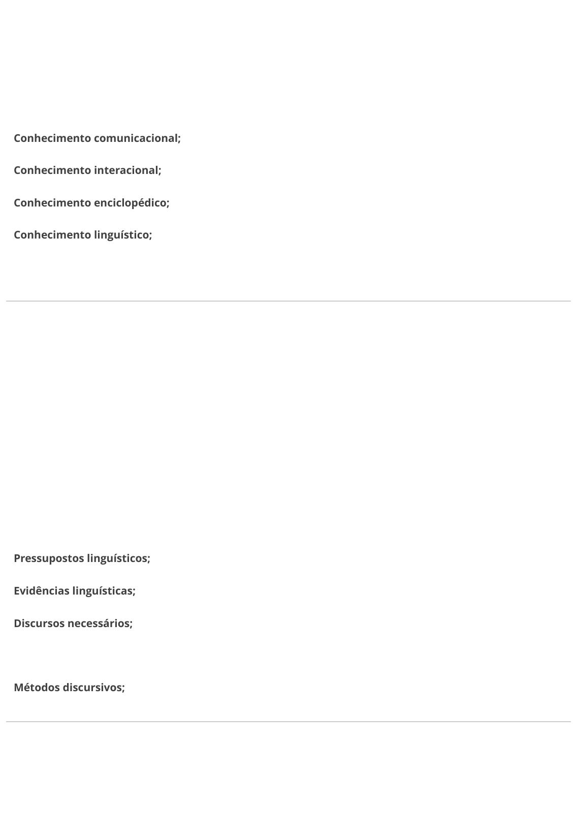 Ocultar opções de resposta Ocultar opções de resposta Pergunta 1 1 / 1 O _________________ relaciona-se à capacidade de se fazer entender pelo outro, por meio dos mecanismos de linguagem disponíveis. Qual alternativa completa corretamente o espaço? Conhecimento comunicacional; Conhecimento interacional; Conhecimento enciclopédico; Conhecimento linguístico; Resposta corretaConhecimento metacomunicativo; Pergunta 2 1 / 1 Koch e Elias (2007) definem como __________________________ para a prática de leitura o conhecimento linguístico, o conhecimento enciclopédico e o conhecimento interacional, o conhecimento ilocucional, o conhecimento comunicacional e o conhecimento metacognitivo. Pressupostos linguísticos; Evidências linguísticas; Discursos necessários; Resposta corretaSistemas de conhecimento prévios; Métodos discursivos; Pergunta 3 1 / 1 Ocultar opções de resposta Ocultar opções de resposta Dentre os estudiosos notáveis da Linguística, temos um pesquisador que, devido aos legados deixados por sua obra póstuma, é considerado o “pai da linguística”, desse modo, assinale a alternativa correta a partir de seus conhecimentos. Resposta corretaFerdinand de Saussure; Noam Chomsky; Ludwig Wittgenstein; William Labov; Leonard Bloomfield; Pergunta 4 1 / 1 Compreendida, no campo da Linguística Aplicada, como um discurso, e a LA busca compreender seu funcionamento na contemporaneidade sem o intuito de formular leis universais ou generalizantes. Estamos falando da: Conotação; Literatura; Literatura comparada; Linguagem; Resposta corretaLíngua; Pergunta 5 1 / 1 Ocultar opções de resposta Ocultar opções de resposta Em que momento a reescrita do texto deve acontecer? Desse modo, assinale a alternativa correta a partir de seus conhecimentos e coloque-os em prática na questão a seguir. Antes da última produção textual; Somente após a avaliação final do professor; Já na primeira aula sobre o tema; Resposta corretaDurante o processo de aprendizagem do gênero e de construção do texto; Em todas as aulas; Pergunta 6 1 / 1 A _____________ é compreendida, pela Linguística Aplicada, como um grande sistema possibilitador da comunicação, que pode se manifestar de forma verbal e também não-verbal. Desse modo, assinale a alternativa correta a partir de seus conhecimentos. Resposta corretaLinguagem; Fala; Análise discursiva; Língua; Língua falada; Pergunta 7 1 / 1 Ocultar opções de resposta Ocultar opções de resposta O __________________________ refere-se à quantidade de informações concretas de comunicação que o sujeito possui, bem como à habilidade linguística de reconhecer enunciados e usar a linguagem conforme as regras de situação comunicativa. Conhecimento metacomunicativo; Resposta corretaConhecimento comunicacional; Conhecimento interacional; Conhecimento linguístico; Conhecimento enciclopédico; Pergunta 8 1 / 1 A _______________ não é apenas um processo biológico de decodificação da linguagem, mas um processo que envolve relacionar diferentes competências e habilidades. Desse modo, assinale a alternativa correta a partir de seus conhecimentos. Análise discursiva Literatura Linguística Aplicada Resposta corretaLeitura Linguística Pergunta 9 1 / 1 Ocultar opções de resposta Ocultar opções de resposta Na Teoria da Comunicação desenvolvida por Ferdinand de Saussure, há a identificação de um elemento fundamental para compreendermos a língua: o signo linguístico. Considerando sua composição, numere as lacunas: Signo Significante Significado ( ) A parte abstrata do signo, ou seja, o significado por ele transmitido. ( ) Formado pelo significante e pelo significado. ( ) A parte concreta do signo, ou seja, aquela constituída pelos sons que, juntos, dão origem à imagem sonora do signo, ou seja, suas letras e sons. A alternativa que preenche adequadamente as lacunas é: 1 – 2- 3; 1 – 3 - 2; Resposta correta3 – 1 - 2; 2 -1 -3; 3 – 2 - 1; Pergunta 10 1 / 1 Segundo o texto, a Linguística Aplicada não é uma área fechada em si, mas um campo que dialoga com outras áreas de conhecimento. Quais são elas? Desse modo, assinale a alternativa correta a partir de seus conhecimentos. As Ciências Naturais e as Ciências Exatas; A Música, a Pintura e a Escultura; Resposta corretaA Psicologia, a Filosofia, a Sociologia, a Antropologia, a Política e a Educação; A Sociologia, a Geografia, a Antropologia, a Matemática e as Ciências Naturais; Soc o og a, a Geog a a, a t opo og a, a ate át ca e as C ê c as atu a s; A Linguagem, a Estética, a Filosofia e a Sociologia;