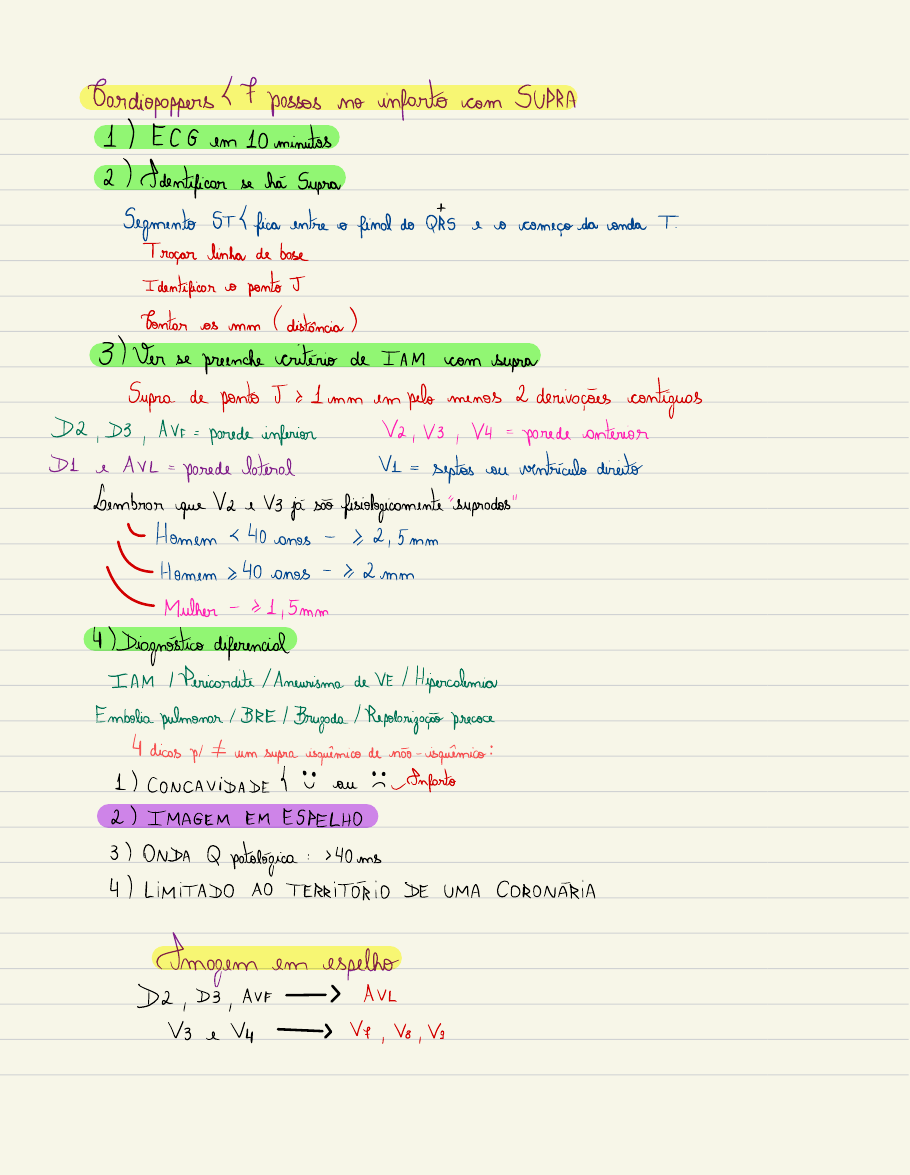 Pordiopoppers { 7 passos no infarto com SUPRA 1) ECG em 1O minutos 2) identificar se há Supra Segmento ST { fica entre o final do QÂS e o começo -da onda T. Troçar linha de base Identificar o ponto J Contar os mm ( distância ) 3) Ver se preenche critério de IAM com supra Supra de ponto J ≥ 1mm em pelo menos 2 derivações contíguos D2 , D3 , AVF = parede inferior V2 , V3 , V4 = parede anterior 1 e AVL = parede lateral V1 = septos ou ventrículo direito Lembrar que V2 e V3 já são fisiologicamente "superados " Homem < 40 anos - ≥ 2,5mm Homem ≥ 40 anos - ≥ 2mm Mulher - ≥ 1,5mm 4)Diagnóstico diferencial IAM / Pericardite /Aneurisma de VE / Hipercalemia Embolia pulmonar / BRE / Brigada / Repolarização precoce ↳ dias p/ =/ um supra isquêmico de não - isquêmico : 1) CONCAVIDADE { F ou Ii -tnforto 2) IMAGEM EM ESPELHO 3) ONDA Q patológica : > 40ms 4) LIMITADO AO TERRITÓRIO DE UMA CORONÁRIA Aniagem em espelho D2 , D3 , AVF AVL V3 e V4 V7 , V8 , V9 5)Decidir trombólise transferência IAM com supra de ST com < 12h de dor em local SEM CATE . Paciente tem contraindicação ABSOLUTA ao trombolítico . AVCH Dissecção aguda de aorta { tórax AVC i { 3 meses Sangramento ativo de abdome{ ADA TCE { 3 meses Tumor MAV Se SIM = transferir p / serviço de hemodinâmica Não tem Motivos : Gravidez / Gestação porém > 120min TROMBOLISAR 6) Prescrever trombótise (lopidogrel iticagrelor e plosugrd SEM estudos /evidências Aspirina Trombolítico E-noxoporinou Doses , depende se > 75 anos ou < 75 anos Menos que 75 anos : Clopidogrel 300mg V0 A AS 300mg V0 Trombolítico { Tenecteplose Enoxaparina 30mg IV F) thecor se trombólise funcionou Sinais de reperfusão miocárdica no ECG . Redução ≥ 50% do supra após 60 - 90min . RIVA Amersão da onda Temos primeiros 4h Arritmia transitória