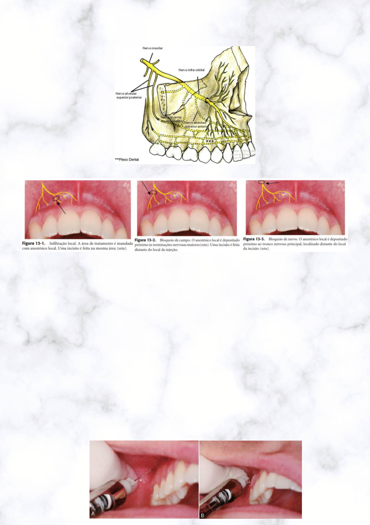 ANESTESIOLOGIA Técnicas anestésicas da maxila Técnicas O bloqueio do nervo alveolar superoposterior (ASP) - Outros nomes: Bloqueio da tuberosidade (baixa), bloqueio zigomático. Areas anestesiada: 1. Polpas do terceiro, segundo e primeiro molares superiores, exceto raiz mesiovestibular do primeiro molar superior). 2. Tecido periodontal vestibular. Técnica. - Uma agulha curta -Área de introdução: altura da prega mucovestibular acima do segundo molar superior - Área-alvo: nervo ASP — posterior, superior e medial à borda posterior da maxila - Pontos de referência: Prega mucovestibular - Posição: Direito 10h / Esquerdo 8h - Preparar tecido (secar) para o anestésico tópico - Avançar a agulha lentamente para cima, para dentro e para trás Em um só movimento (não em três movimentos). J oan na P óvo a Bloqueio do Nervo Alveolar Superior Médio (AMS) - Áreas Anestesiadas 1. Polpas do primeiro e segundo prémolares superiores, raiz mesiovestibular do primeiro molar superior 2. Tecidos periodontais vestibulares e osso sobre estes mesmos dentes - Quando o bloqueio do nervo infraorbitário não produzir anestesia pulpar distal ao canino superior Técnica. 1. Uma agulha curta. 2. Área de introdução: altura da prega mucovestibular acima do segundo pré- molar superior 3. Área-alvo: osso maxilar acima do ápice do segundo pré-molar superior 4. Ponto de referência: prega mucovestibular acima do segundo pré-molar superior 5. Orientação do bisel: voltado para o osso 6. Depositar lentamente 0,9 a 1,2 ml (de metade a dois terços do tubete) da solução 7. Aguardar 3 a 5 minutos (Tempo de latência). Bloqueio do Nervo Alveolar Superoanterior (Bloqueio do Nervo Infraorbitário) / ASA - Áreas Anestesiadas 1. Polpas do incisivo central superior até o canino superior do lado da injeção 2. Em cerca de 72% dos pacientes, as polpas dos pré-molares superiores e a raiz mesiovestibular do primeiro molar 3. Periodonto vestibular (labial) e osso destes mesmos dentes 4. Pálpebra inferior, aspecto lateral do nariz, lábio superior J oan na P óvo a Técnica 1.Agulha longa 2.Área de inserção: altura da prega mucovestibular diretamente sobre o primeiro pré-molar superior ou mesialmente 3. Área-alvo: forame infraorbitário (abaixo da incisura infraorbitária). 4. Pontos de referência: a. Prega mucovestibular b. Incisura infraorbitária c. Forame infraorbitário Bloqueio do Nervo Palatino Maior - Áreas Anestesiadas: A parte posterior do palato duro e os tecidos moles sobrejacentes, anteriormente até o primeiro pré-molar e medialmente até a linha média. Técnica 1. Uma agulha curta. 2. Área de introdução: tecidos moles levemente anteriores ao forame palatino maior 3. Área-alvo: nervo palatino maior (anterior), quando passa anteriormente entre os tecidos moles e o osso do palato duro 4. Pontos de referência: forame palatino maior e junção do processo alveolar maxilar e osso palatino 5. Trajeto da introdução: avançar a seringa a partir do lado oposto da boca formando um ângulo reto com a área-alvo 6. Orientação do bisel: voltado para os tecidos moles palatinos 7. Agulha na diagonal J oan na P óvo a Bloqueio do Nervo Nasopalatino - Áreas Anestesiadas: Porção anterior do palato duro (tecidos moles e duros) bilateralmente desde a face mesial do primeiro pré-molar direito à face mesial do primeiro pré-molar esquerdo. Técnica (Injeção Única no Palato ) 1. Uma agulha curta. 2. Área de introdução: mucosa palatina imediatamente lateral à papila incisiva 3. Área-alvo: forame incisivo, sob a papila incisiva 4. Pontos de referência: incisivos centrais e papila incisiva 5. Trajeto de introdução: aproximar o local de injeção em um ângulo de 45 graus em direção à papila incisiva 6. Uso de cotonete para isquemia 7. Técnica de multiplas perfurações Bloqueio do Nervo Alveolar Superior Médio Anterior (ASMA) Áreas Anestesiadas 1. Anestesia pulpar dos incisivos, caninos e pré-molares superiores 2. Gengiva inserida vestibular destes mesmos dentes 3. Tecidos palatinos inseridos desde a linha média até a margem gengival livre dos dentes associados J oan na P óvo a Técnica: 1. Uma agulha curta. 2. Área de introdução: no palato duro, na metade do caminho ao longo de uma linha imaginária conectando a sutura palatina mediana à margem gengival livre; a linha está localizada no ponto de contato entre o primeiro e o segundo pré-molar 3. Área-alvo: osso palatino no local da injeção 4. Pontos de referência: ponto de interseção na metade do caminho ao longo de uma linha da sutura palatina mediana à margem gengival livre, fazendo interseção com o ponto de contato entre o primeiro e o segundo pré-molar. 5. Orientação do bisel: o bisel da agulha é colocado “voltado para baixo” em direção ao epitélio. A agulha é mantida tipicamente num ângulo de 45o em relação ao palato Abordagem Palatina-Alveolar Superoanterior (P-ASA) Áreas Anestesiadas: 1. Polpa dos incisivos centrais, laterais e caninos 2. Tecidos periodontais vestibulares associados a estes mesmos dentes 3. Tecidos periodontais palatinos associados a estes mesmos dentes Obs: Se administrado rapidamente pode causar necrose Técnica 1. Uma agulha curta. 2. Área de introdução: imediatamente lateral à papila incisiva no sulco papilar 3. Área-alvo: forame nasopalatino 4. Pontos de referência: papila nasopalatina J oan na P óvo a Bloqueio do Nervo Maxilar Nervo Anestesiado: Divisão maxilar do nervo trigêmeo. Áreas Anestesiadas: 1. Anestesia pulpar dos dentes superiores no lado do bloqueio 2. Periodonto vestibular e osso sobrejacente a estes dentes 3. Tecidos moles e osso do palato duro e parte do palato mole, medialmente à linha média 4. Pele da pálpebra inferior, lateral do nariz, bochecha e lábio superior Cont. Bloqueio do nervo maxilar Técnica (Abordagem da Tuberosidade Alta) 1. Uma agulha longa 2. Área de introdução: altura da prega mucovestibular acima da face distal